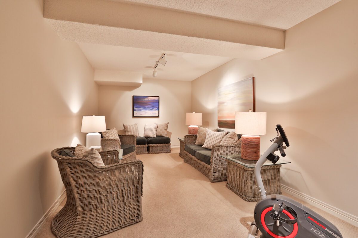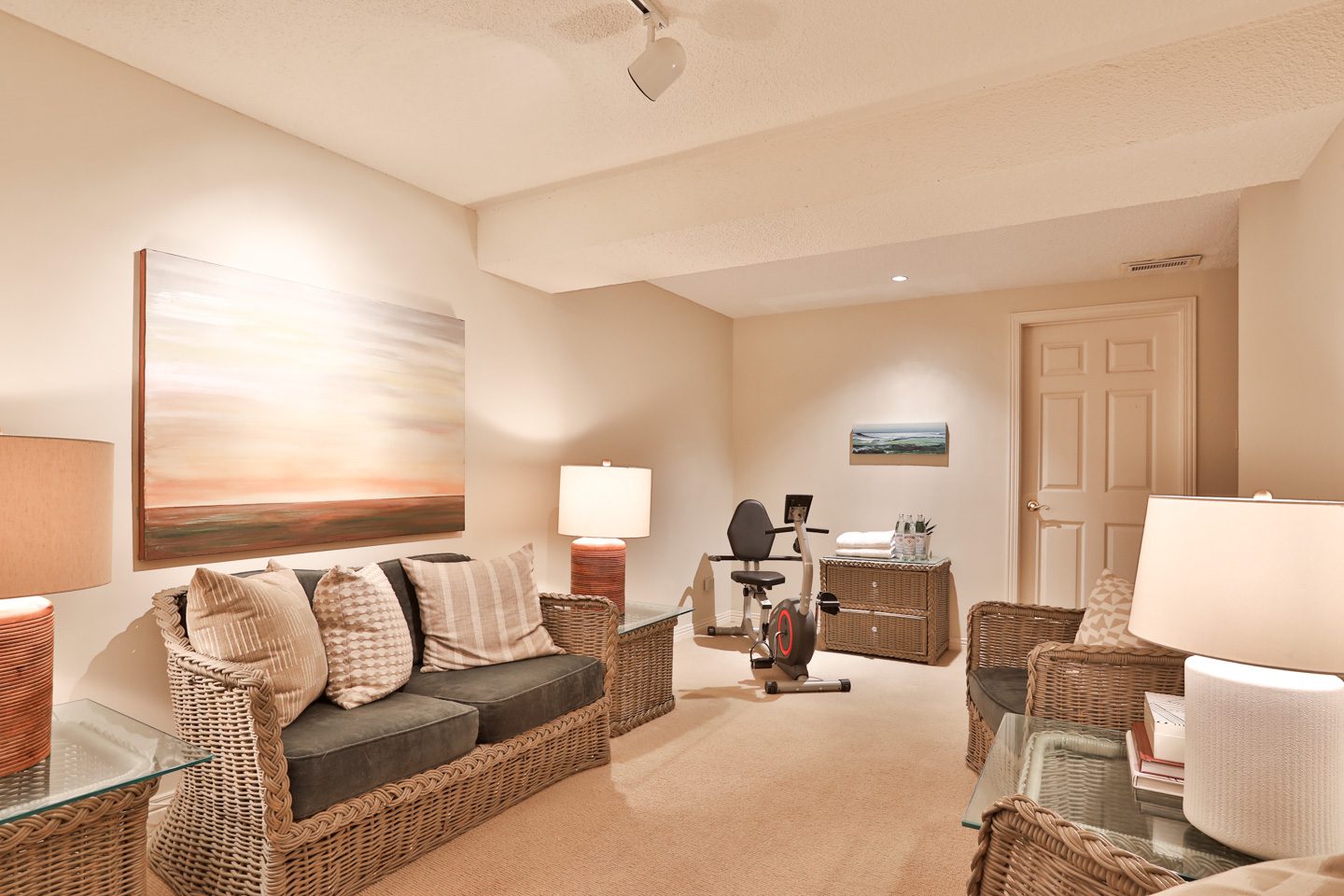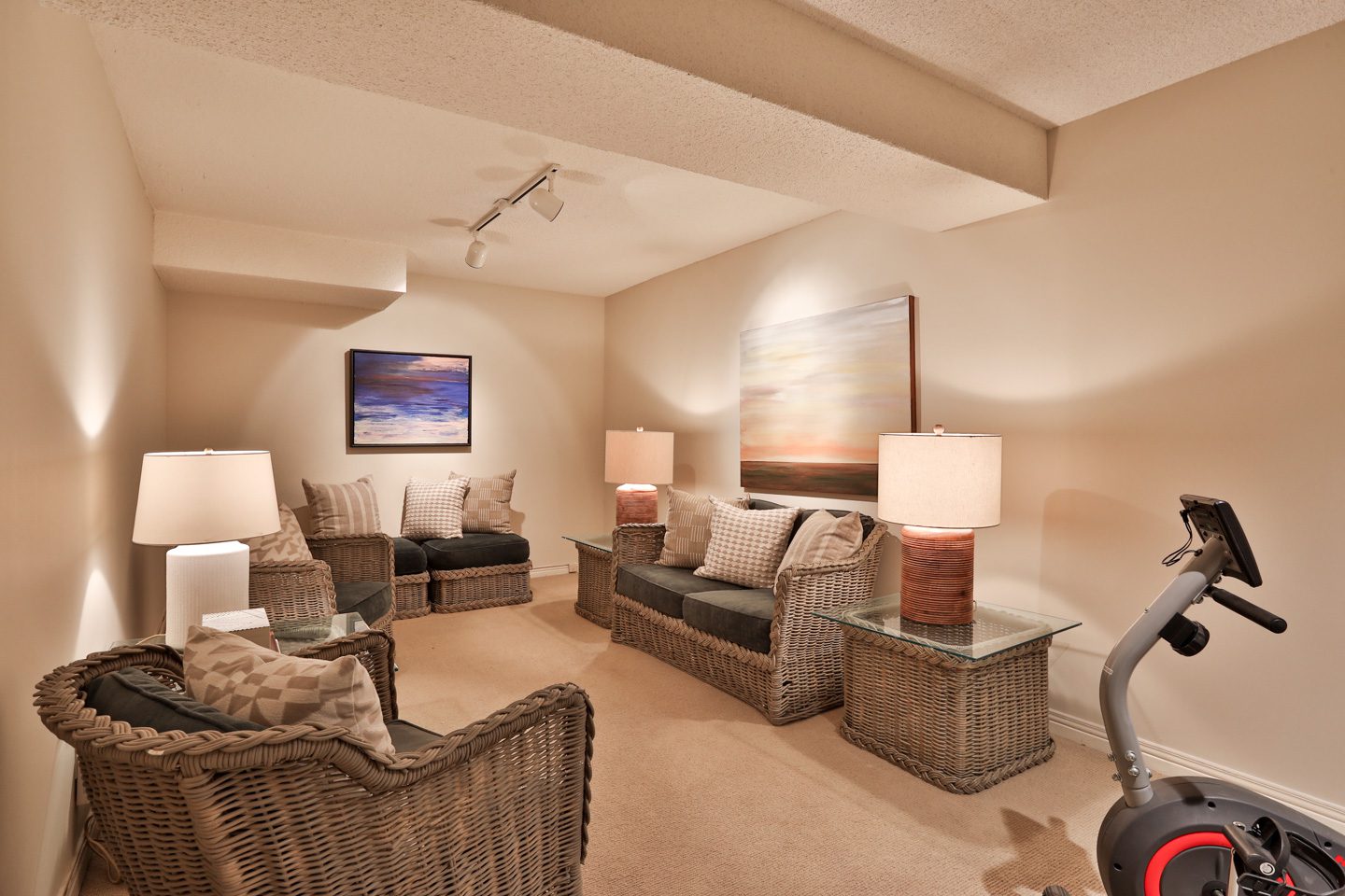 The lower level is designed for both lifestyle and convenience, offering a large recreation or workout room, an extra-large walk-in storage closet, ensuite laundry with front-loading machines, and direct access to the underground parking space. The development provides a shared common room for seasonal storage and visitor parking for up to seven cars.