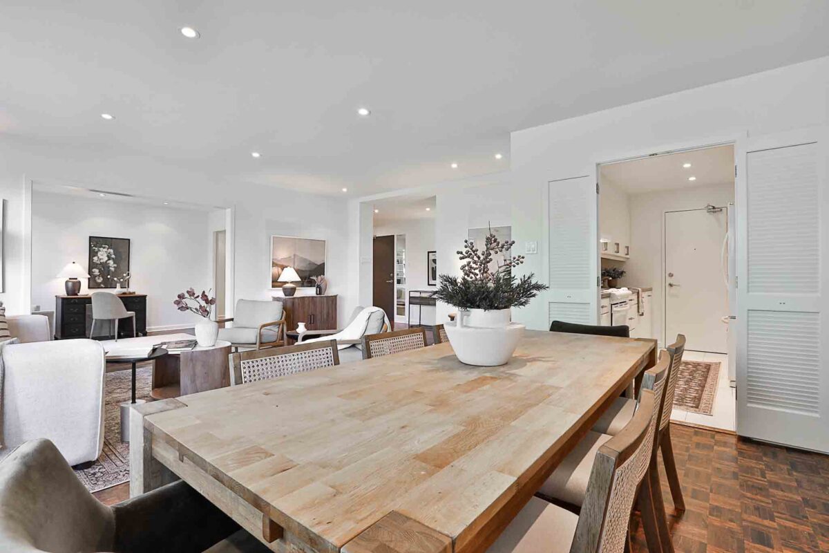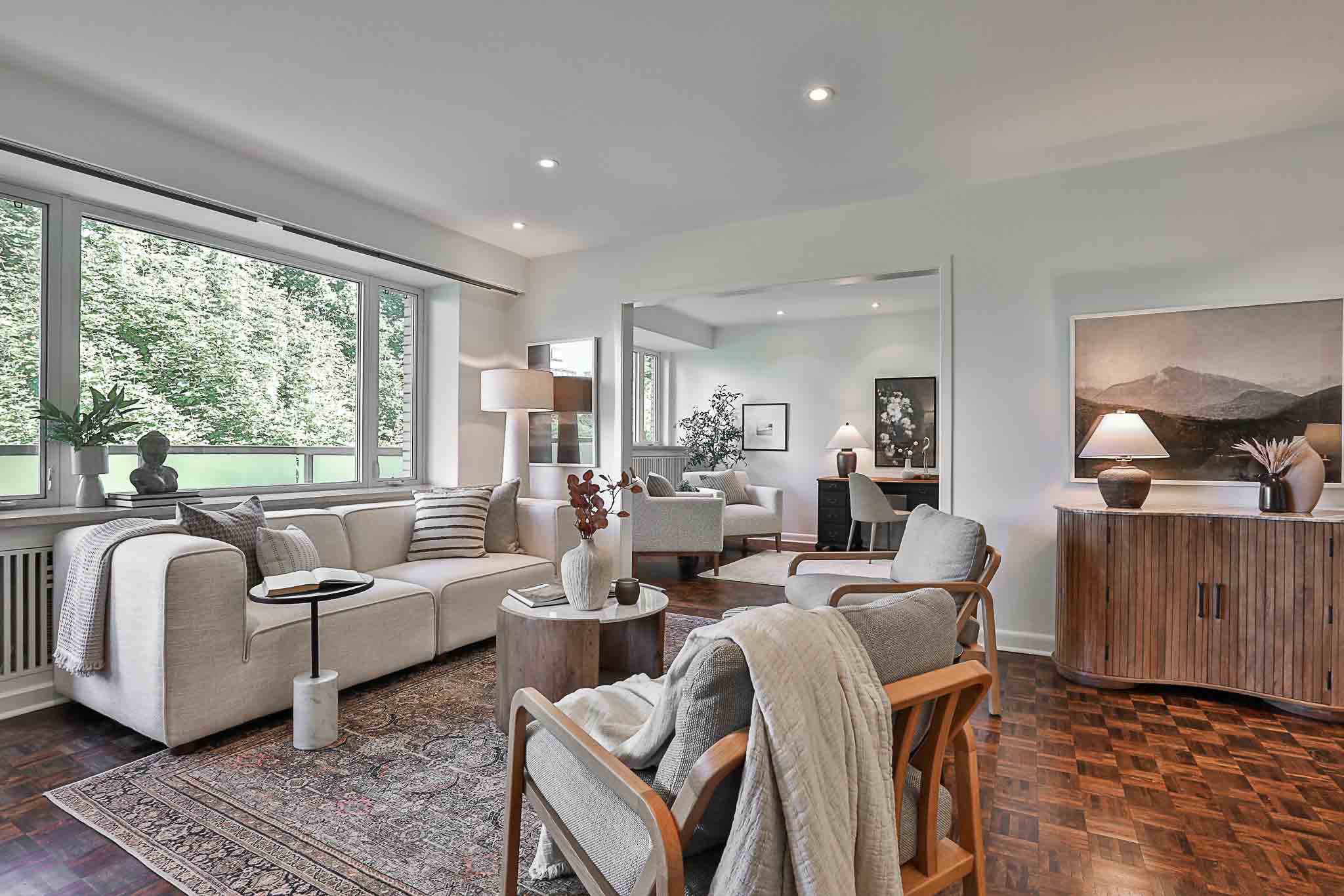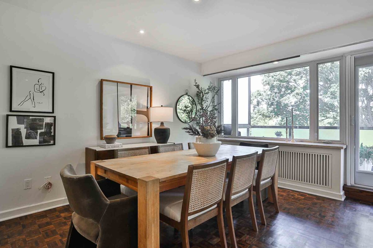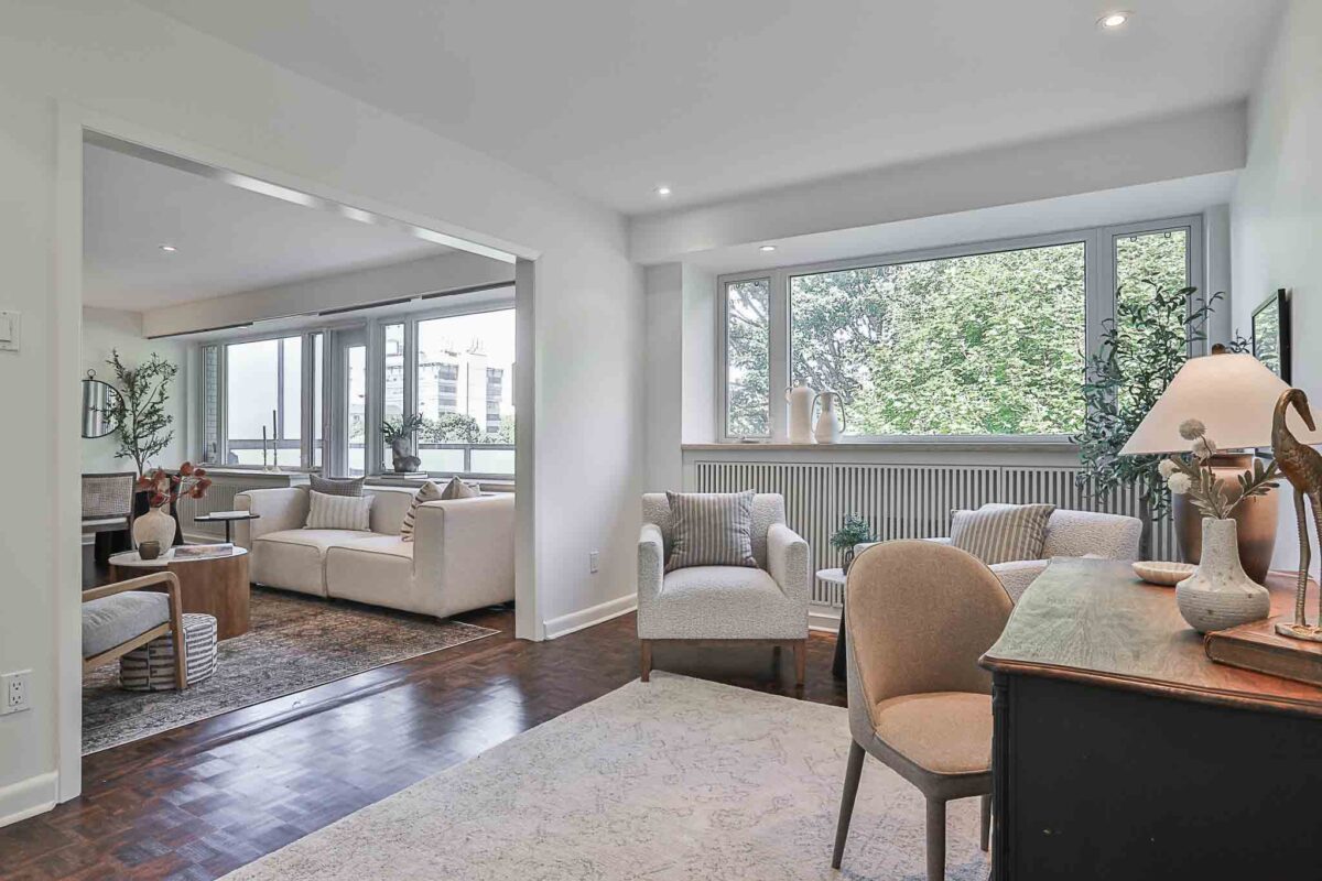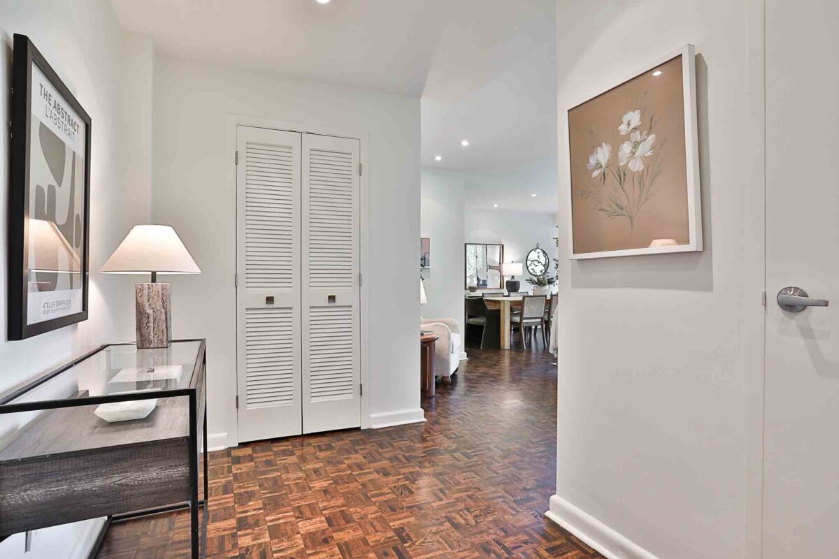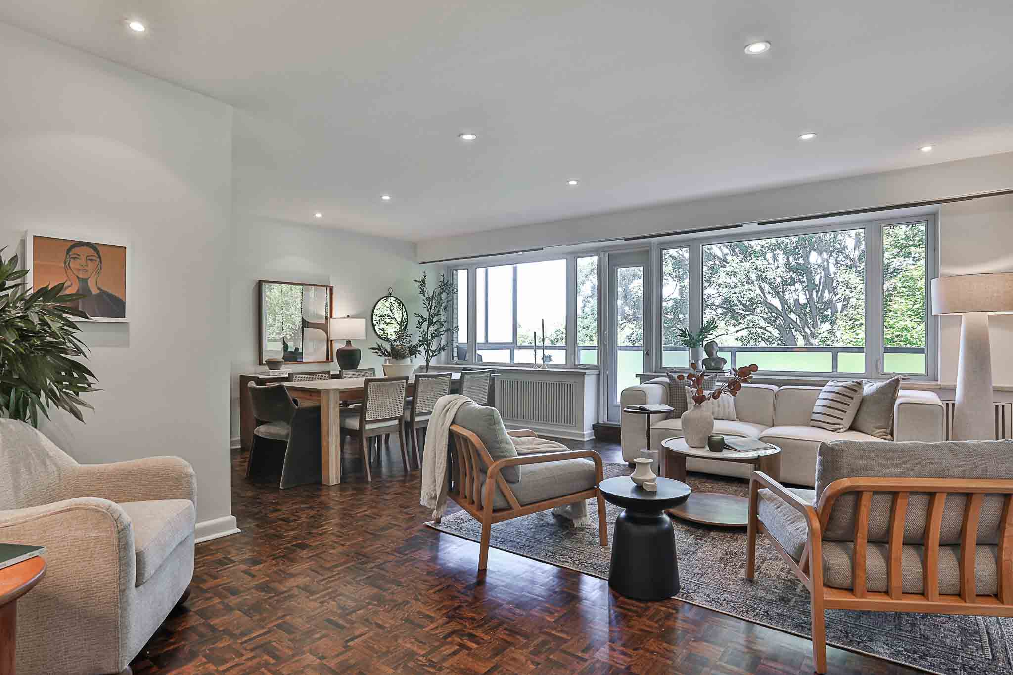 Welcome to Suite 709 at Arbour Glen – set within a quiet, well-established Rosedale residence, this spacious suite offers thoughtful design, comfort, and leafy treetop views. A welcoming foyer introduces the home, complete with a coat closet, an oversized walk-in closet that cleverly doubles as pantry storage, and a discreet two-piece bathroom for guests. From here, the suite opens into expansive living and dining rooms, where the original parquet flooring and oversized windows create a warm and inviting backdrop for daily life.