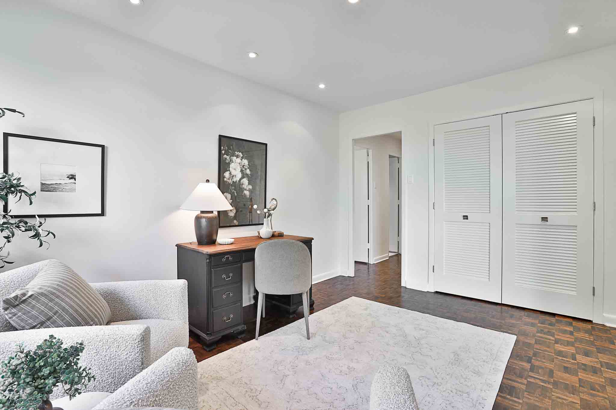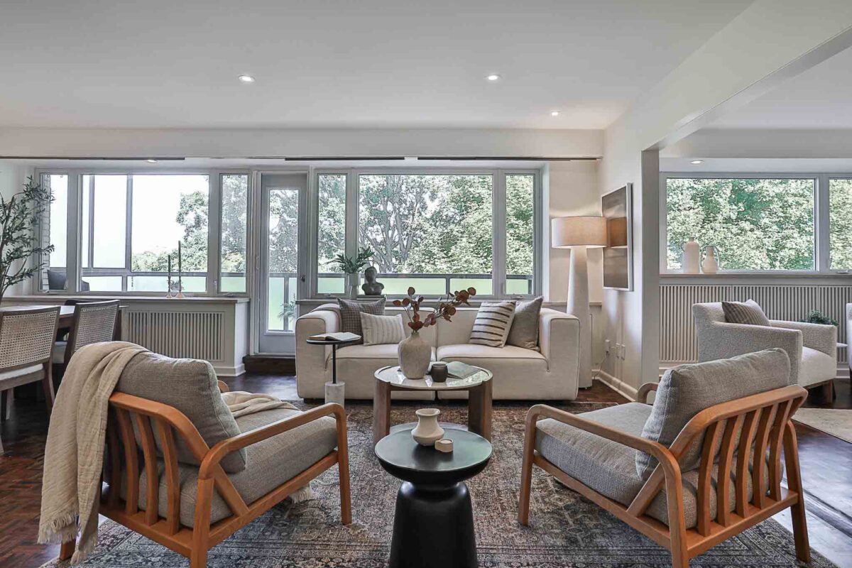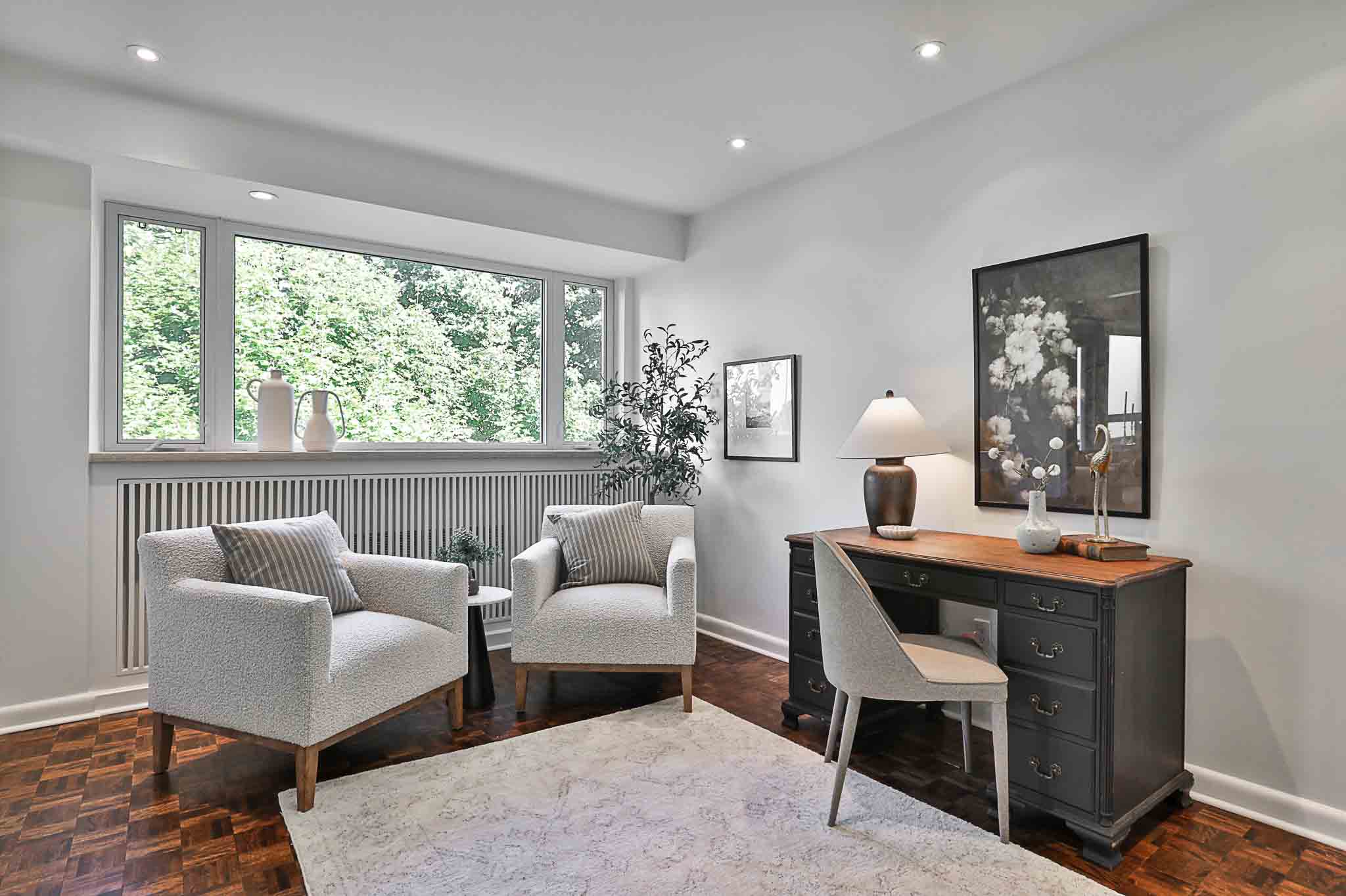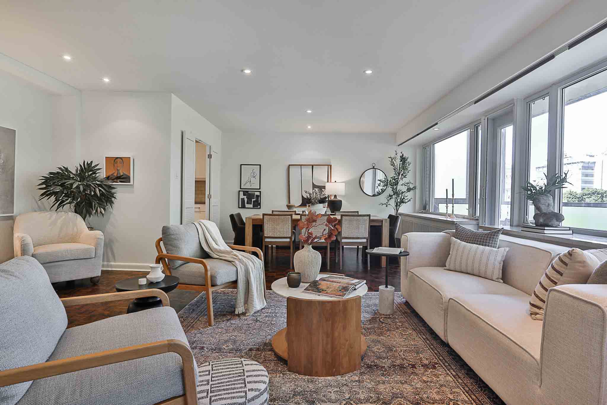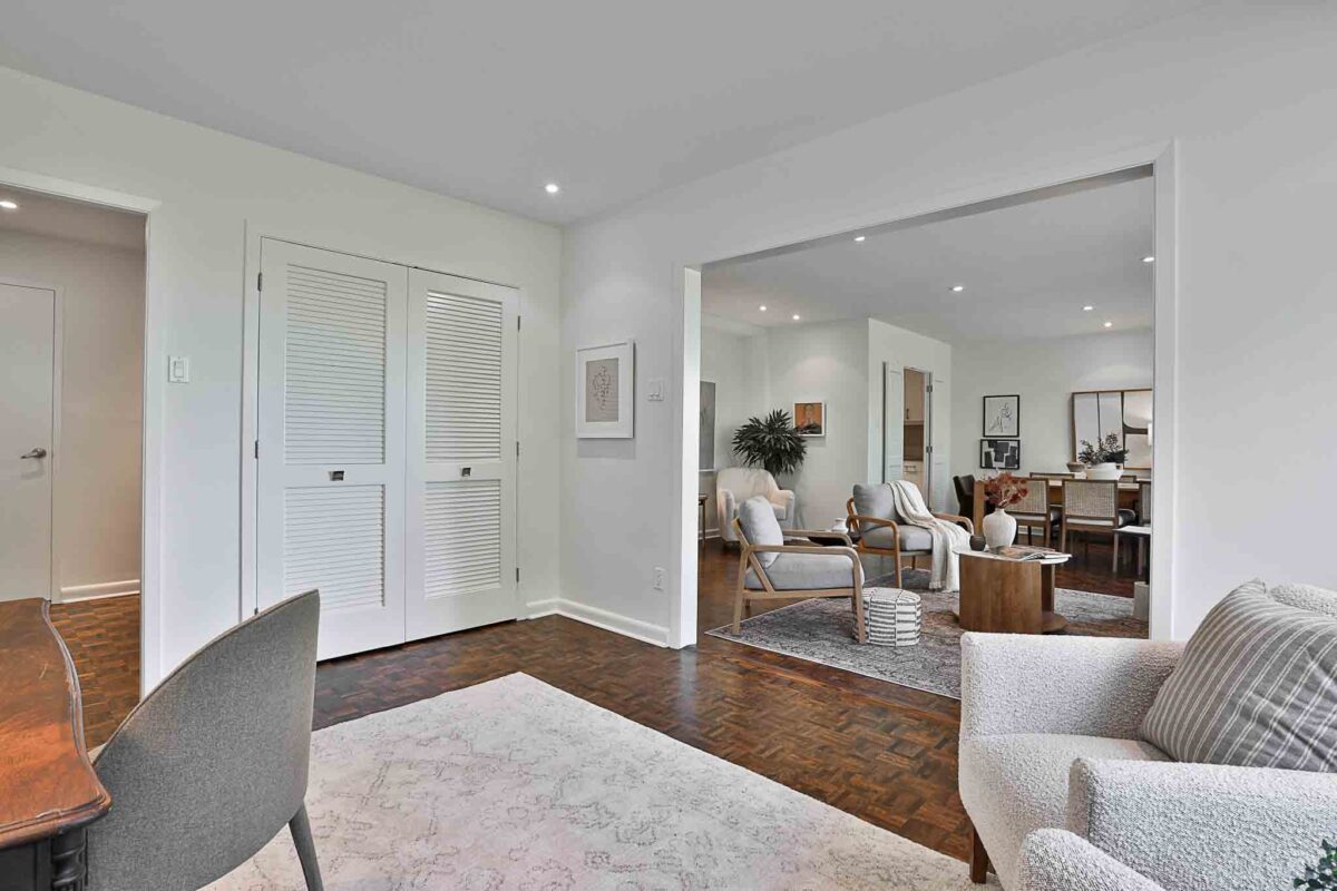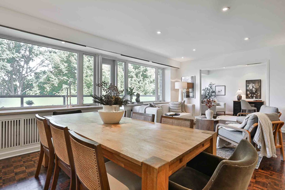 Welcome to Suite 709 at Arbour Glen – set within a quiet, well-established Rosedale residence, this spacious suite offers thoughtful design, comfort, and leafy treetop views. A welcoming foyer introduces the home, complete with a coat closet, an oversized walk-in closet that cleverly doubles as pantry storage, and a discreet two-piece bathroom for guests. From here, the suite opens into expansive living and dining rooms, where the original parquet flooring and oversized windows create a warm and inviting backdrop for daily life.