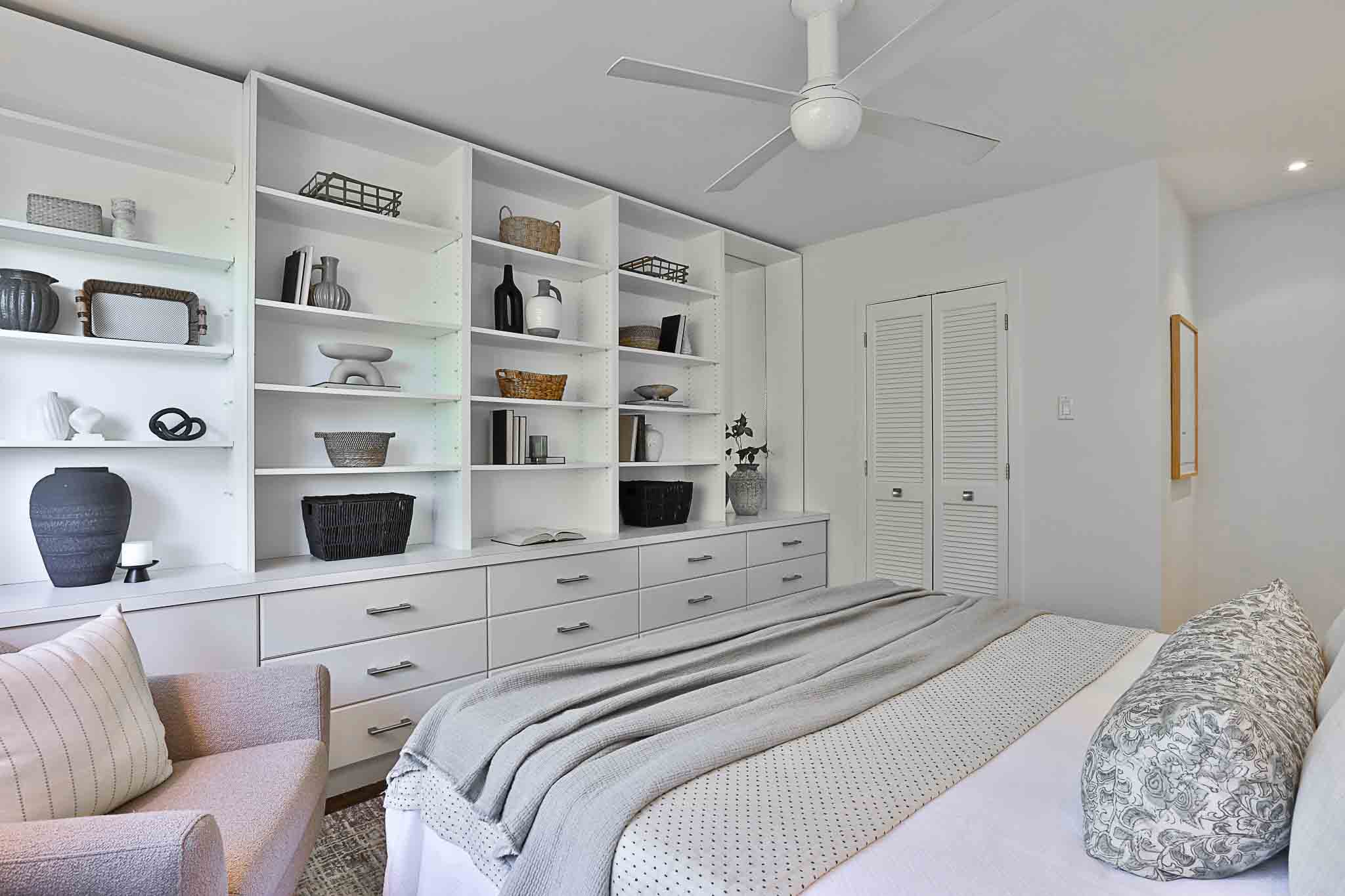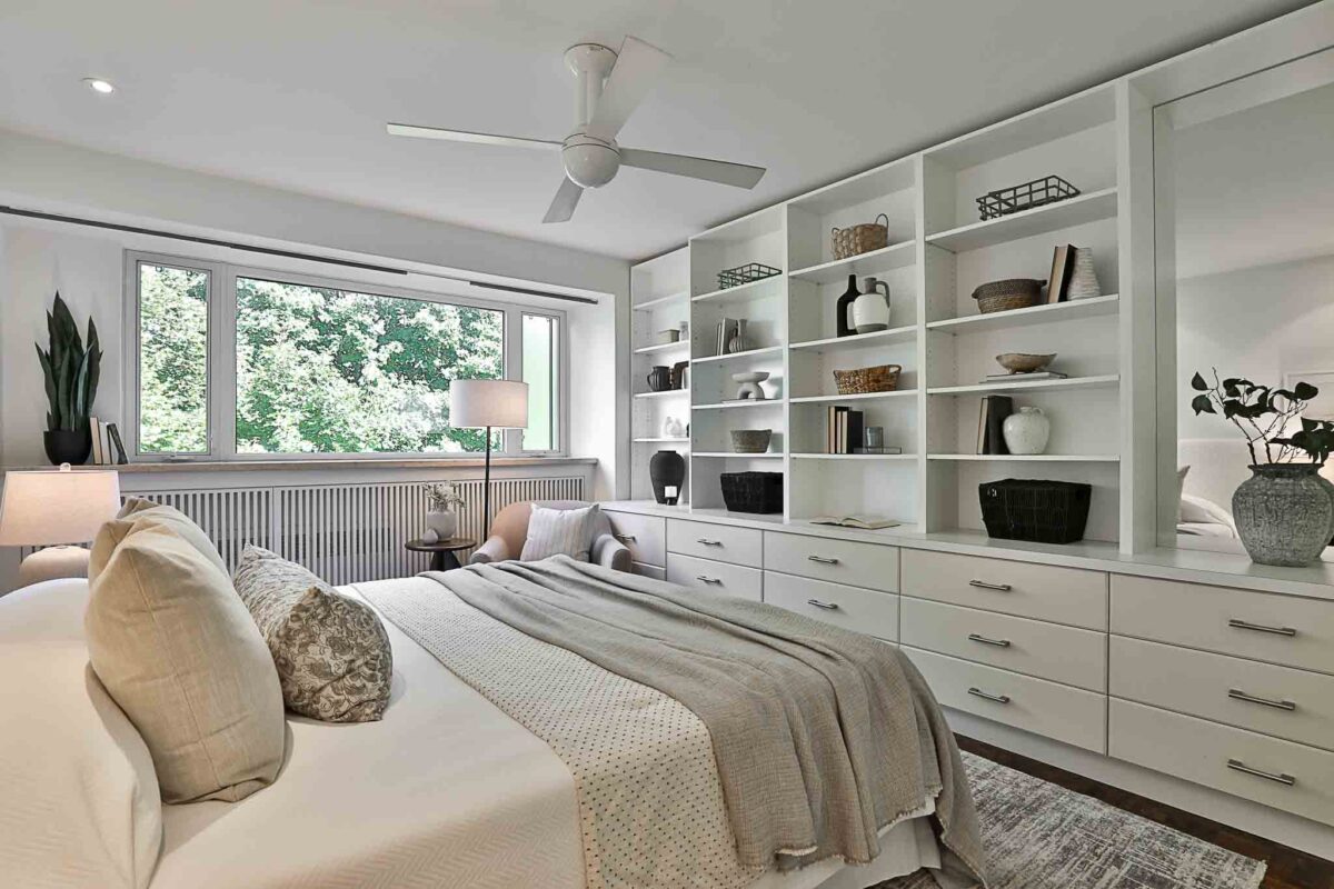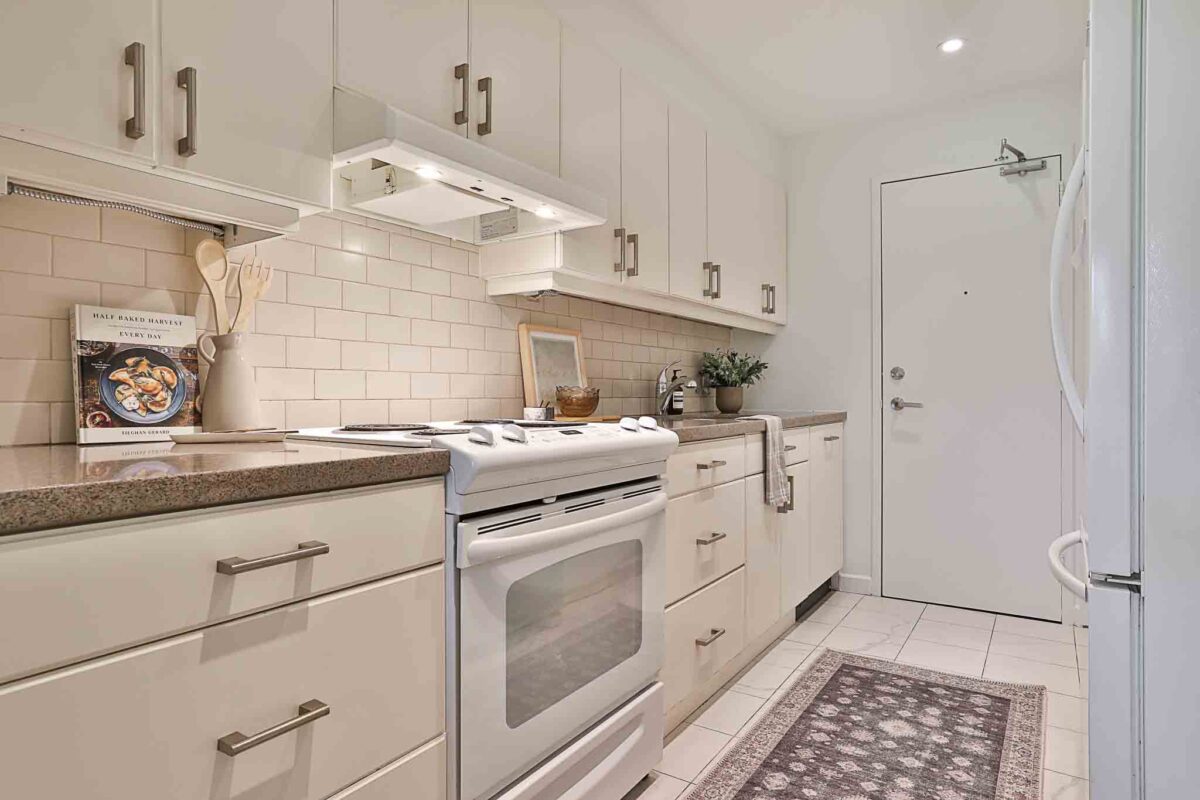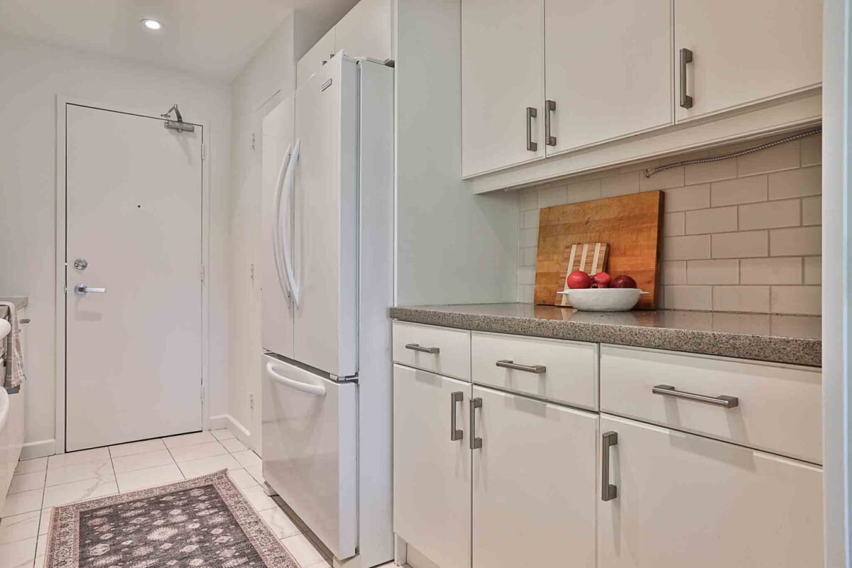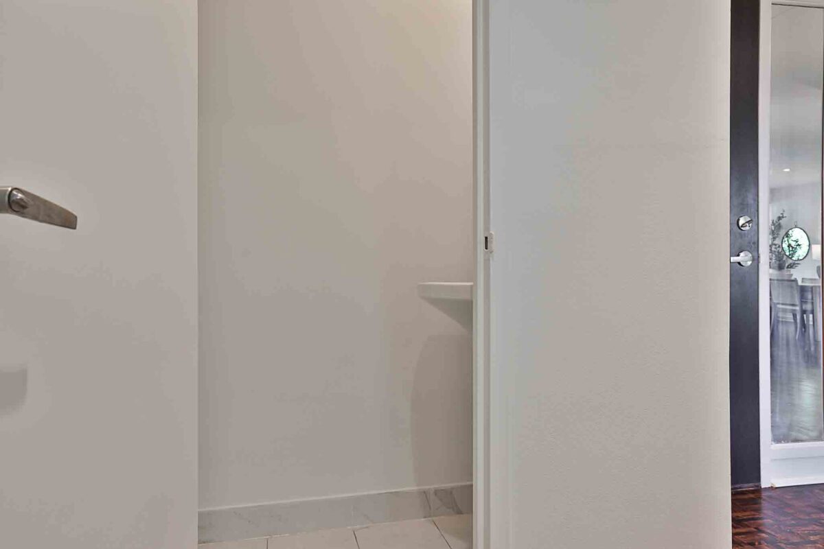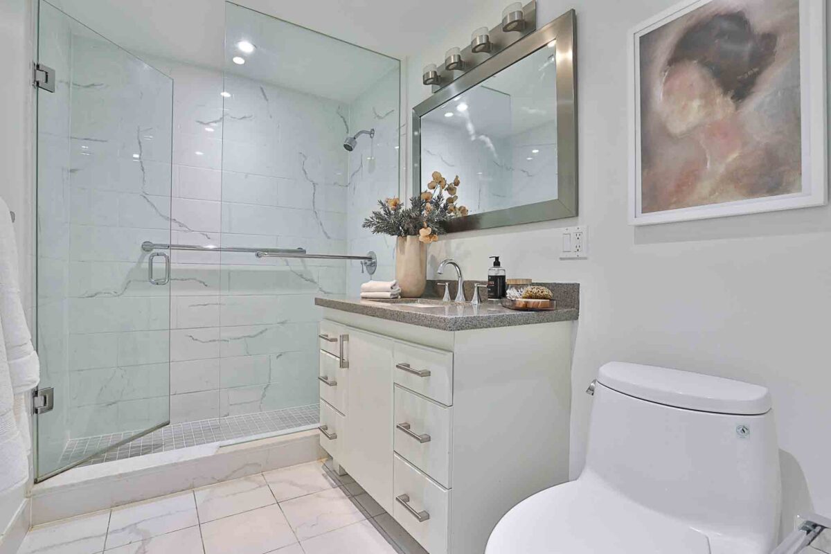 The kitchen is a model of efficiency, planned as a galley to maximize space and function, and offering the convenience of a secondary hallway entrance. The king-sized primary bedroom is enhanced by custom built-in shelving, an expansive walk-in closet, and oversized windows that fill the room with natural light. Once configured as a two-bedroom suite, it was reimagined with a dedicated formal dining area. Still, it can easily be converted back to a second bedroom or used as a flexible den or office. A renovated three-piece bathroom with a glass-enclosed shower serves both the primary bedroom and the secondary space.