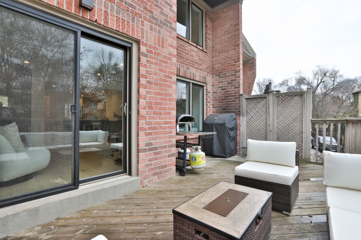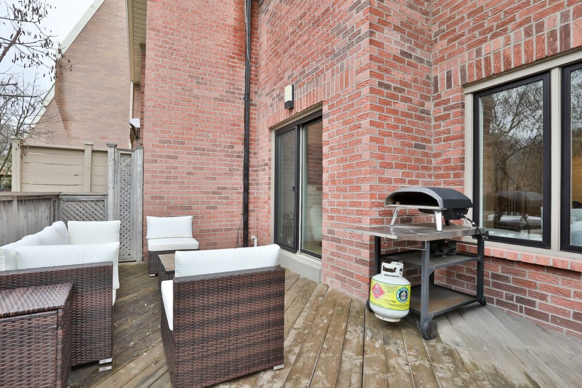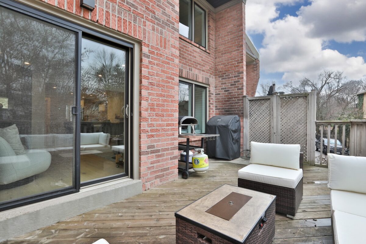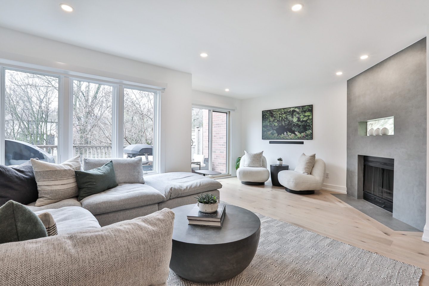 The living room is amazing, offering an obvious L corner for a huge comfortable couch facing the wood burning fireplace, porcelain slab surround, onyx back-lit niche, and the Frame television (excluded). Large windows overlook the rear terrace with private tree-lined views into greenspace at the rear of this lot. A walk-out from the living room connects you to this highly functional exterior space, to be used for barbecuing and entertaining throughout the warmer months.