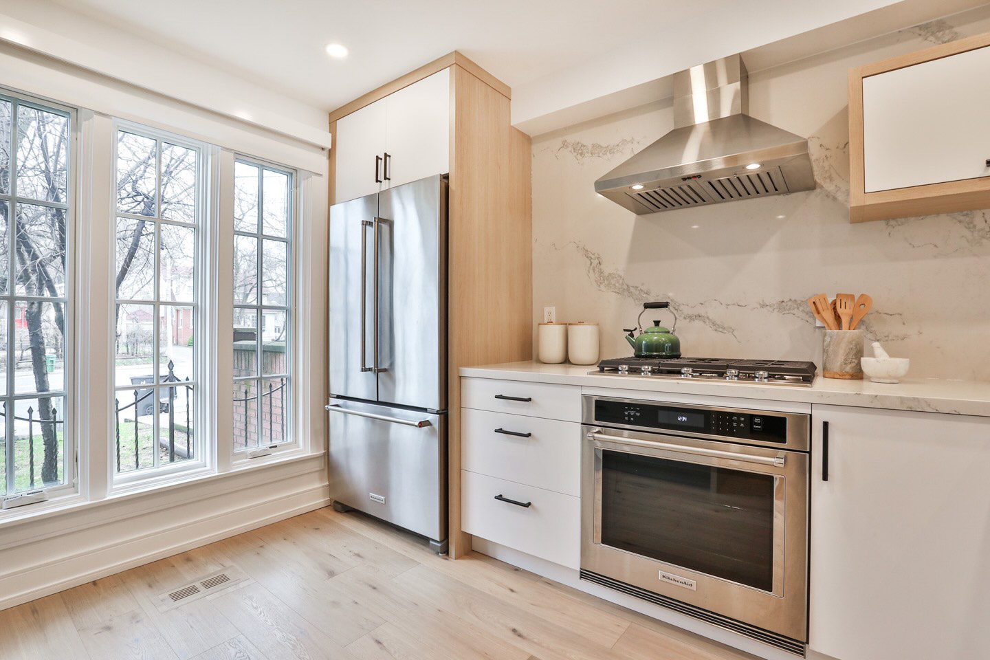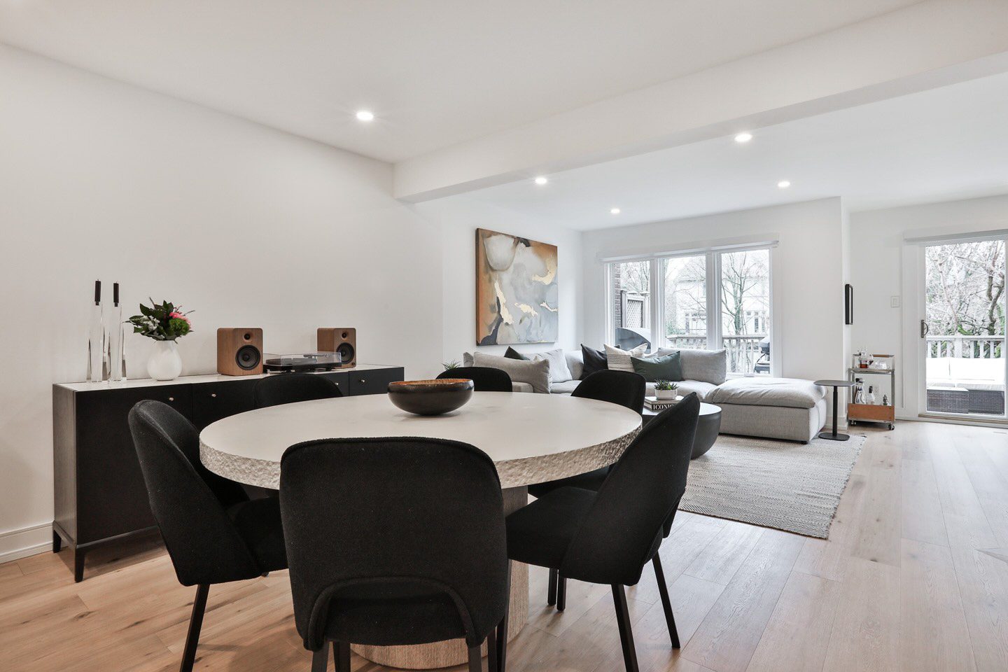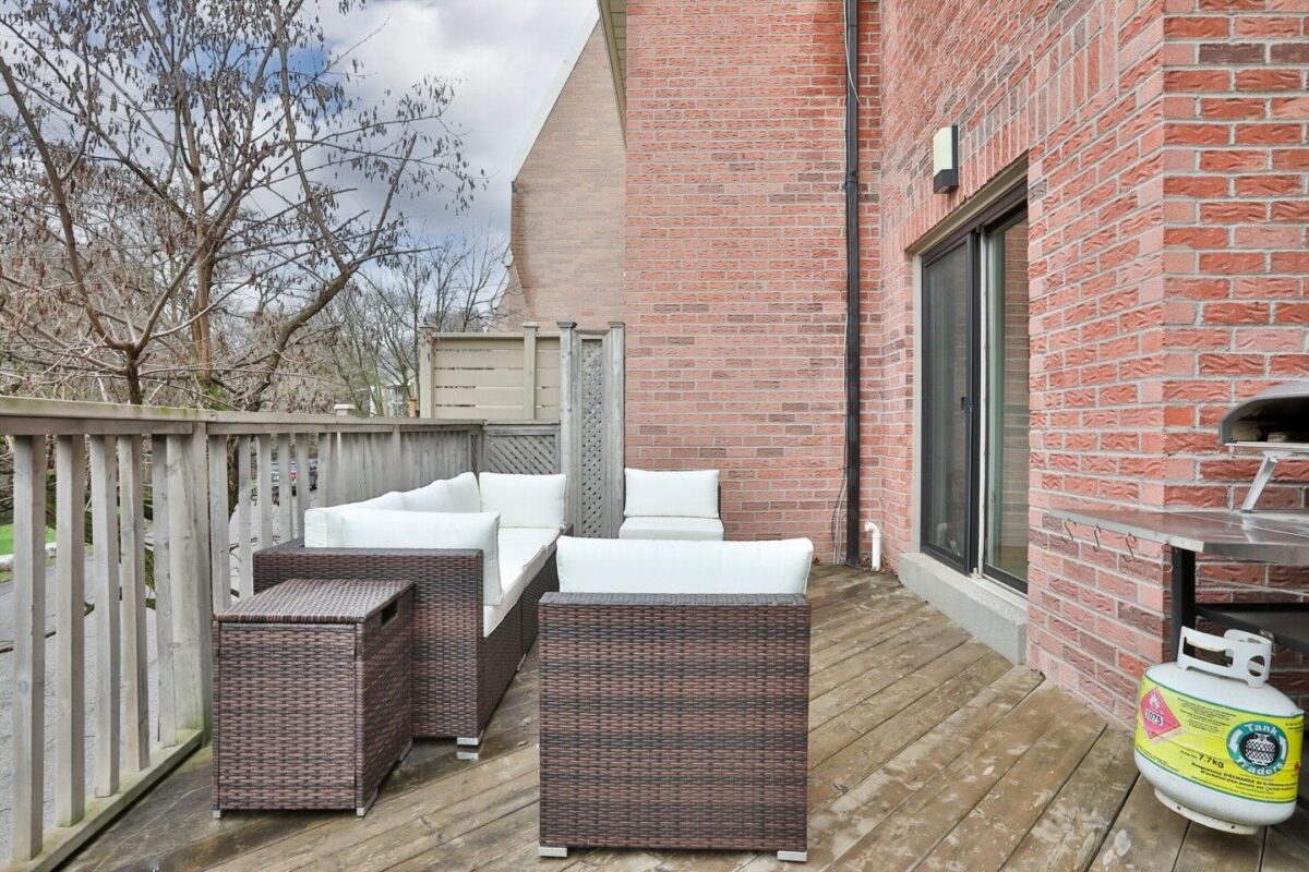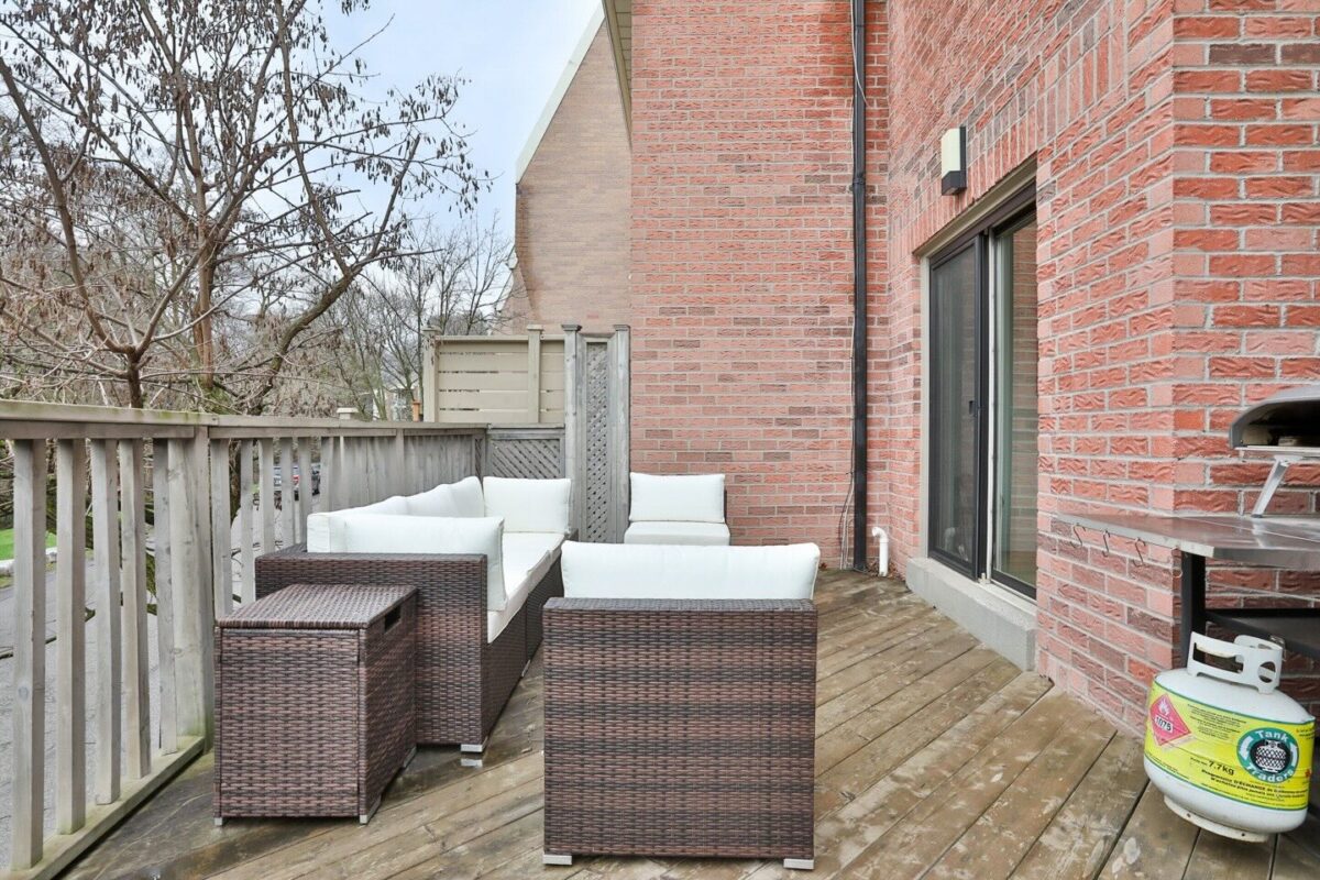 The living room is amazing, offering an obvious L corner for a huge comfortable couch facing the wood burning fireplace, porcelain slab surround, onyx back-lit niche, and the Frame television (excluded). Large windows overlook the rear terrace with private tree-lined views into greenspace at the rear of this lot. A walk-out from the living room connects you to this highly functional exterior space, to be used for barbecuing and entertaining throughout the warmer months.