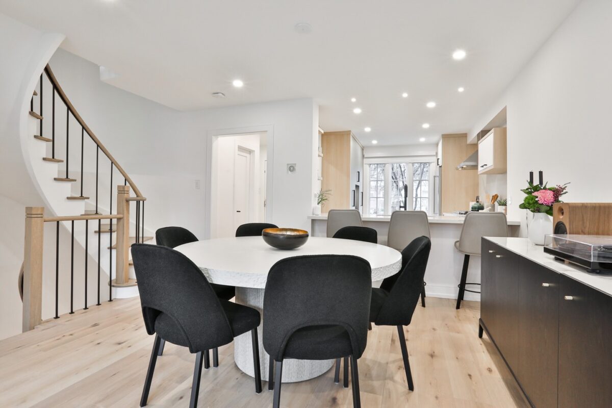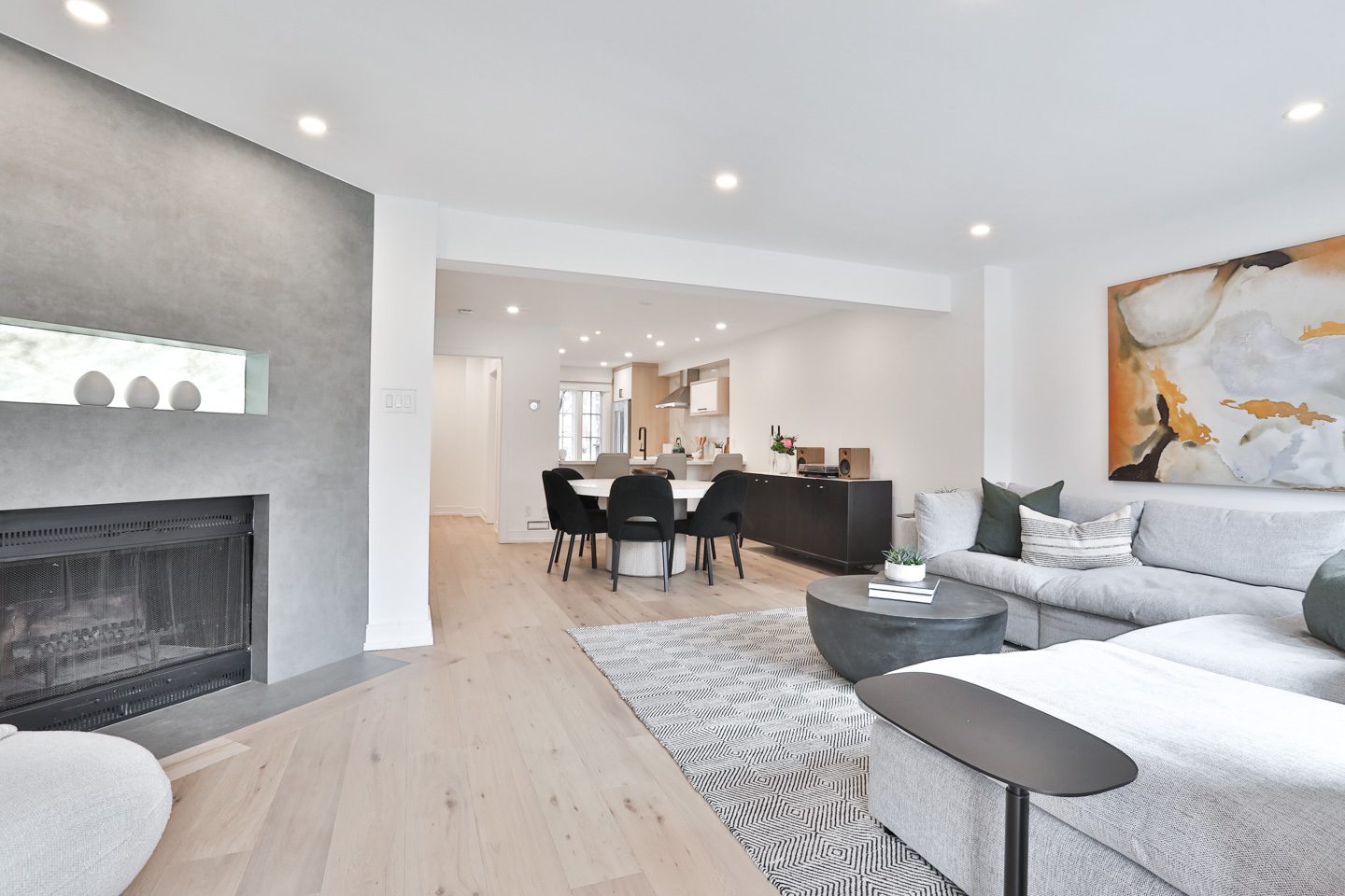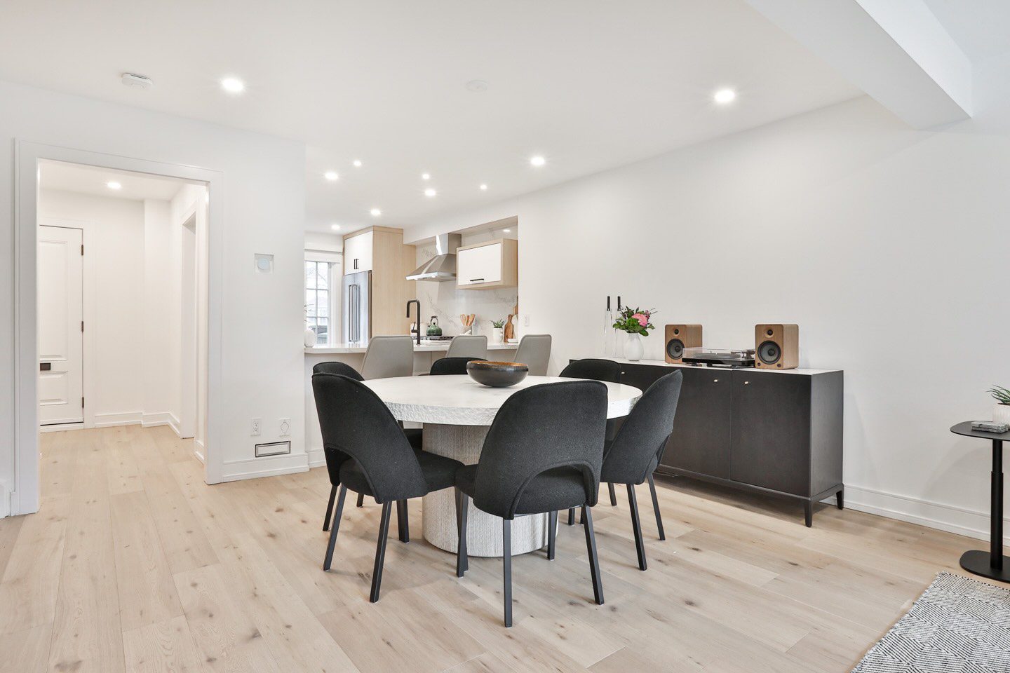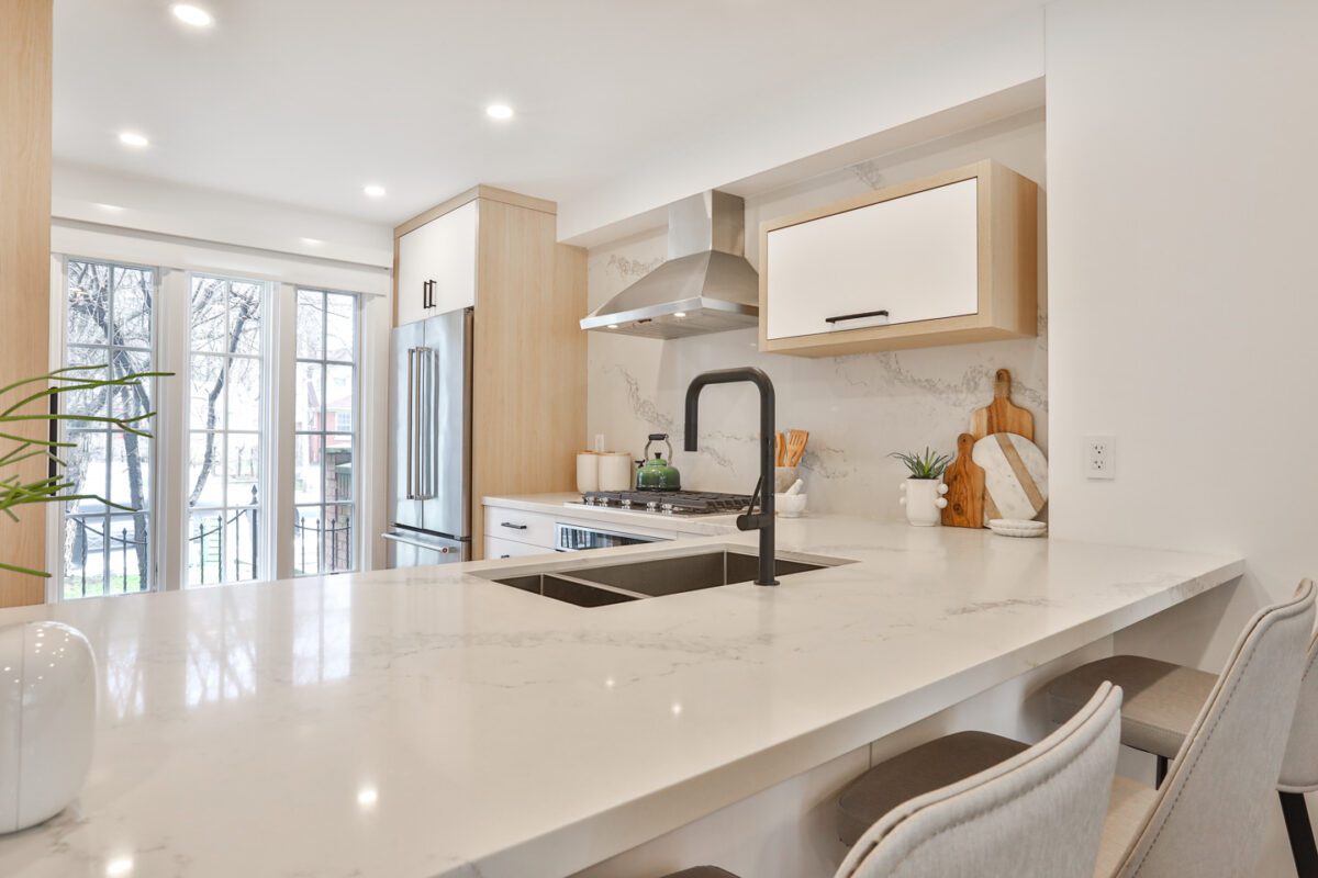 On the main floor, a generous foyer sets the tone with custom built in storage and a renovated two-piece guest bathroom. Beside this, the kitchen opens with a completely new design and open-concept connection to the living and dining rooms. It is lined with new customized cabinetry, stainless steel appliances, and a striking slab countertop and backsplash. There is a large breakfast bar with seating for up to four guests, beyond which the dining room expands with generous proportions for a side board and a large dining setting.