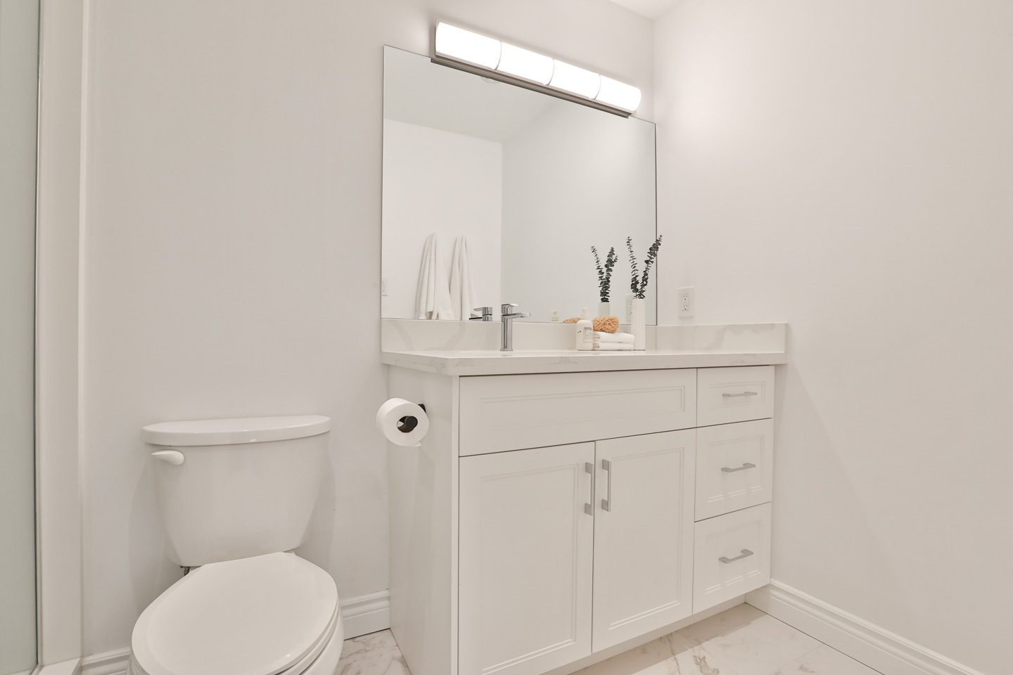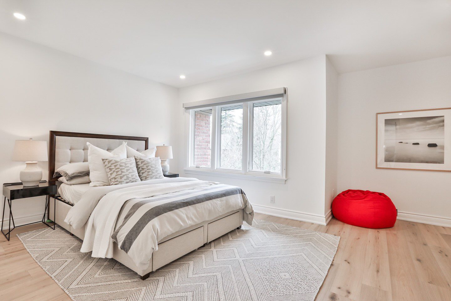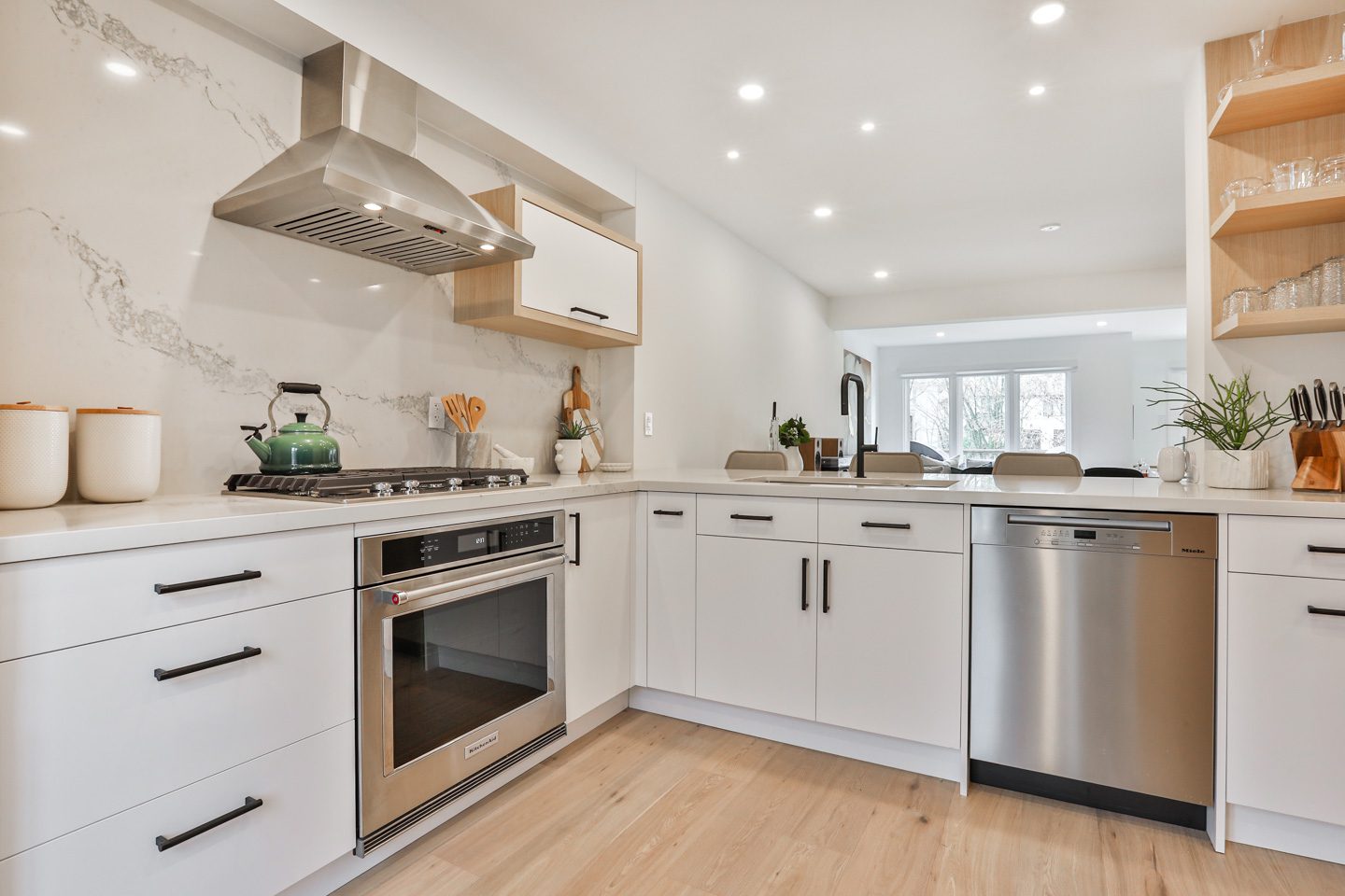 On the main floor, a generous foyer sets the tone with custom built in storage and a renovated two-piece guest bathroom. Beside this, the kitchen opens with a completely new design and open-concept connection to the living and dining rooms. It is lined with new customized cabinetry, stainless steel appliances, and a striking slab countertop and backsplash. There is a large breakfast bar with seating for up to four guests, beyond which the dining room expands with generous proportions for a side board and a large dining setting.