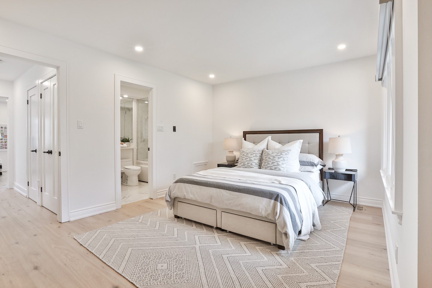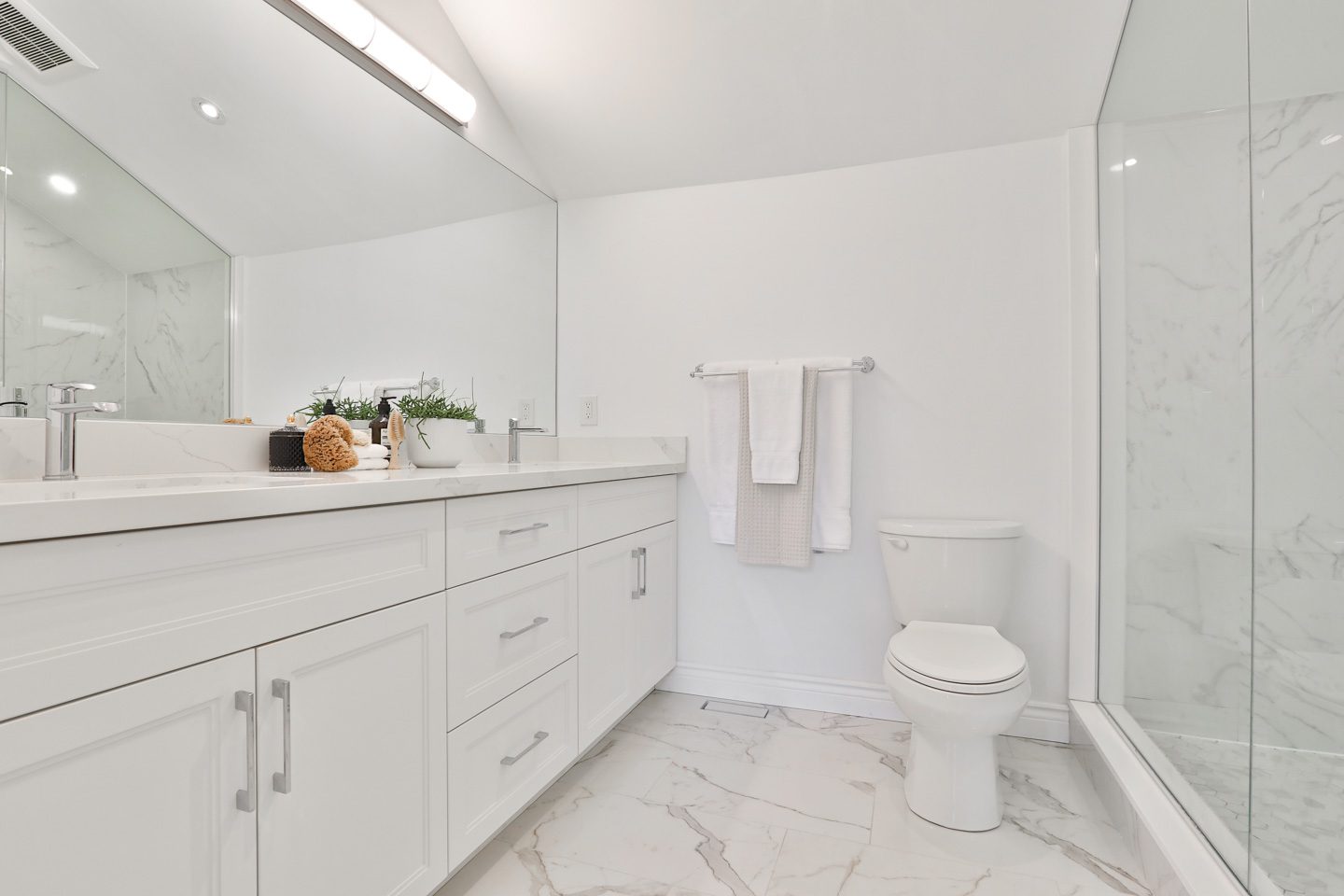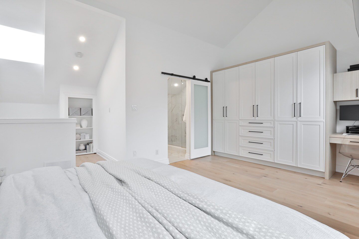 The second level hosts two substantial bedroom suites, each with its own beautifully renovated ensuite and built-in storage closets and shelves. Above, the third level is devoted to a stunning primary retreat with vaulted ceilings, skylight exposure, and a full wall of custom millwork with storage closets and an integrated workspace. The bathroom is gorgeous, with a custom double-vanity, a huge walk-in glass encased shower, and vaulted ceilings. There is also a secret storage room behind the built-in bookshelf in the bedroom, perfect for seasonal wardrobe storage.