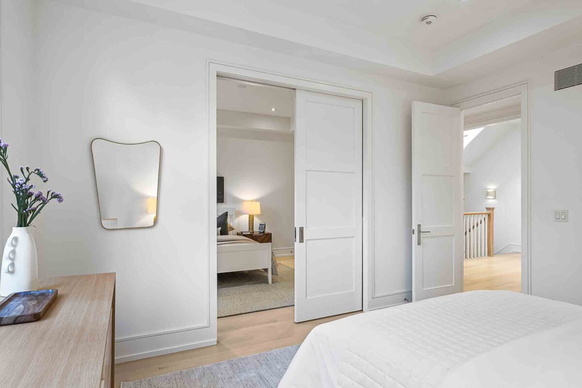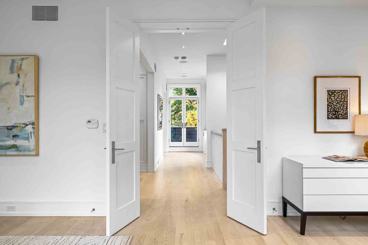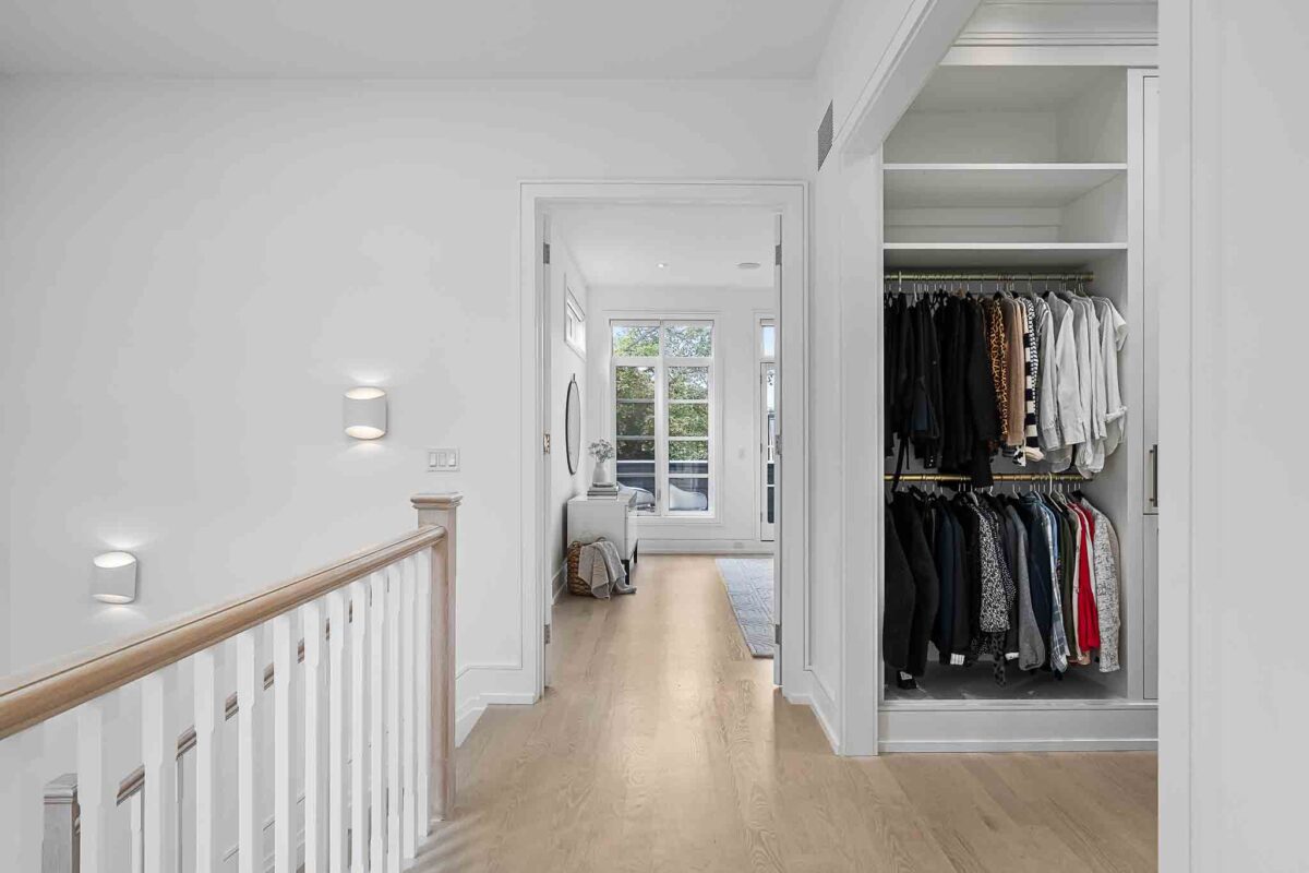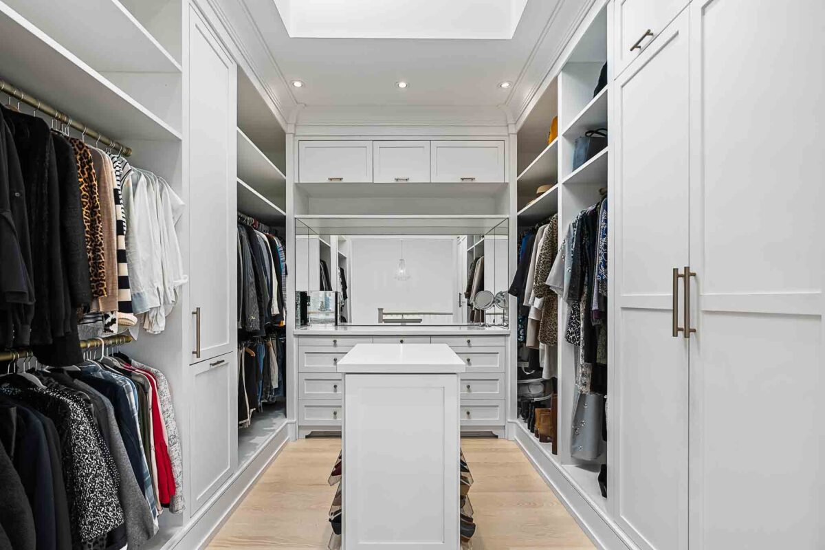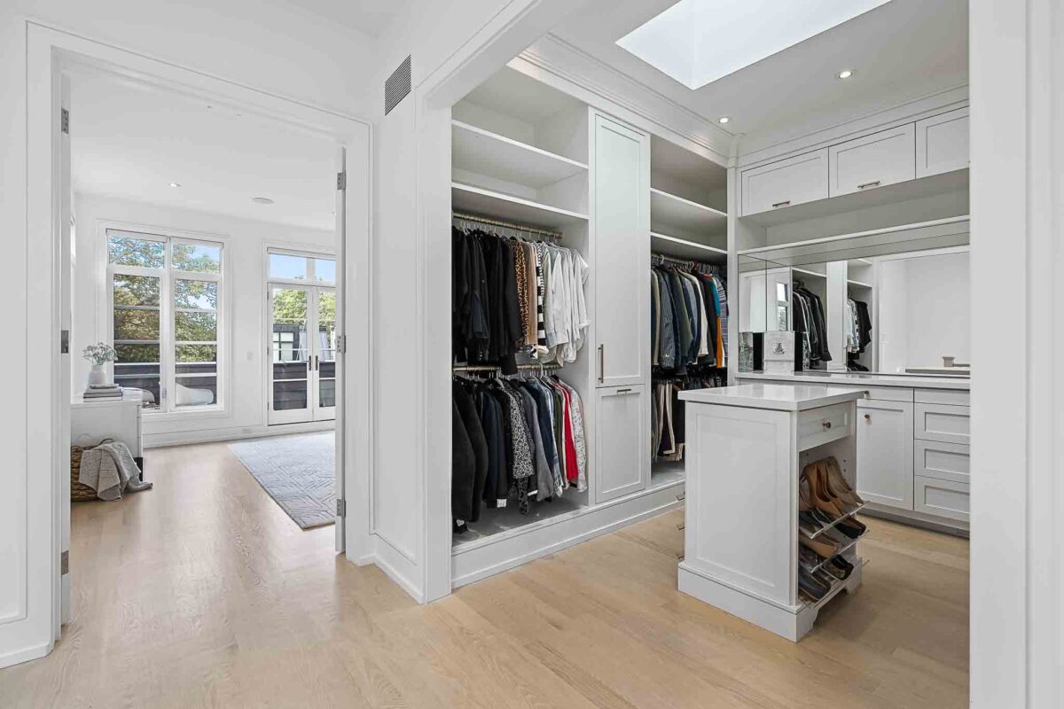 The third floor is dedicated entirely to the primary suite, and it is quite a retreat to enjoy. French doors open to the king-sized bedroom with a tandem seating area and a walk-out to one of two terraces on this floor. The walk-in dressing room is perfectly lined with carefully planned storage for each parent, with drawers, long hanging, short hanging and ample cupboard space. Carrying past this, more custom millwork and storage line the south wall before arriving at the gorgeous ensuite bathroom, outfitted with a huge walk-in shower, double vanity and deep soaking tub. Walk out to the second terrace with the most incredible treetop views, and relax amongst the canopy of birch and maple leaves fluttering in the wind.