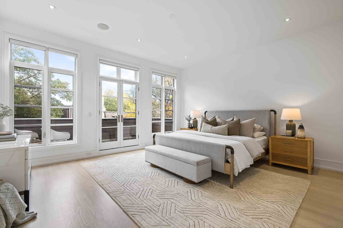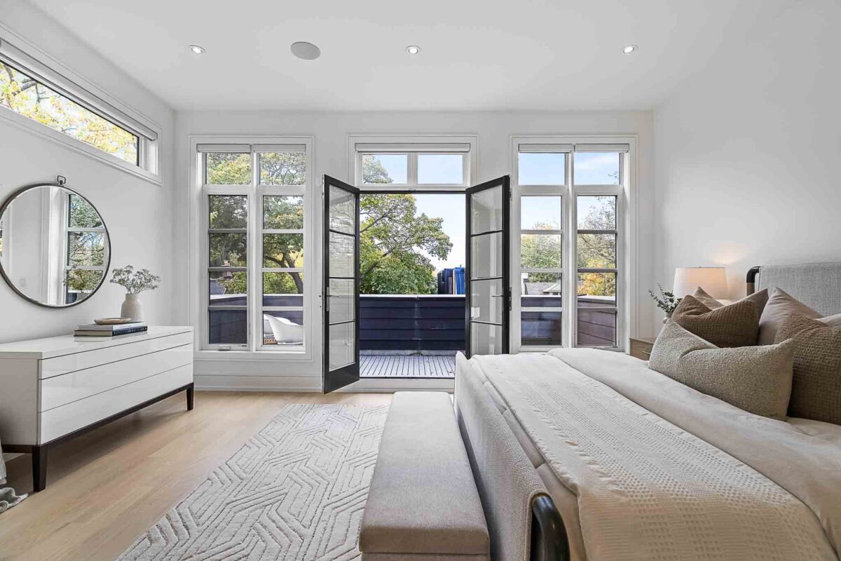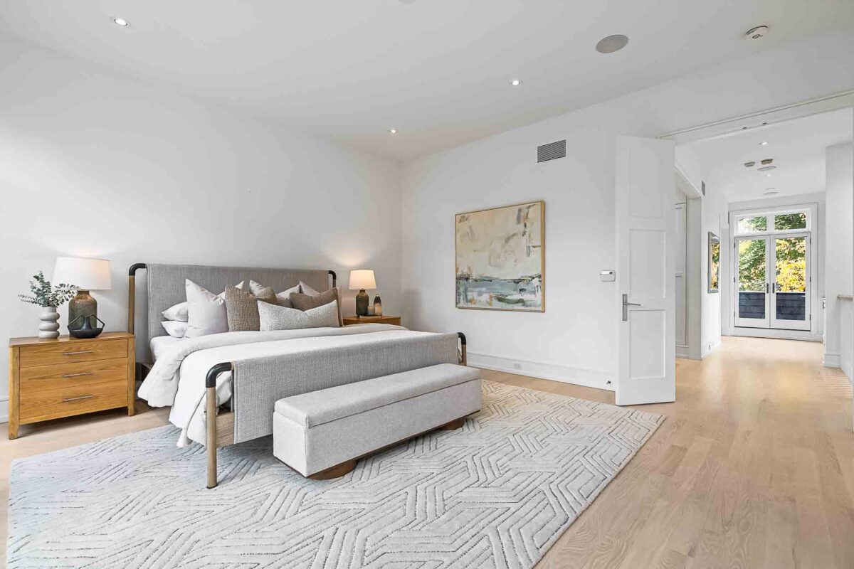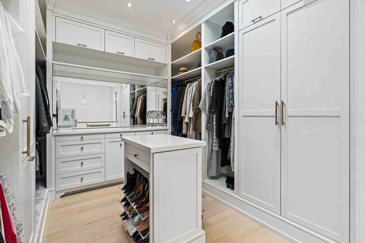 The third floor is dedicated entirely to the primary suite, and it is quite a retreat to enjoy. French doors open to the king-sized bedroom with a tandem seating area and a walk-out to one of two terraces on this floor. The walk-in dressing room is perfectly lined with carefully planned storage for each parent, with drawers, long hanging, short hanging and ample cupboard space. Carrying past this, more custom millwork and storage line the south wall before arriving at the gorgeous ensuite bathroom, outfitted with a huge walk-in shower, double vanity and deep soaking tub. Walk out to the second terrace with the most incredible treetop views, and relax amongst the canopy of birch and maple leaves fluttering in the wind.