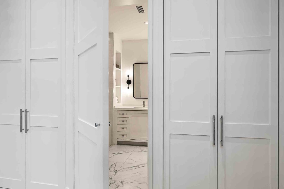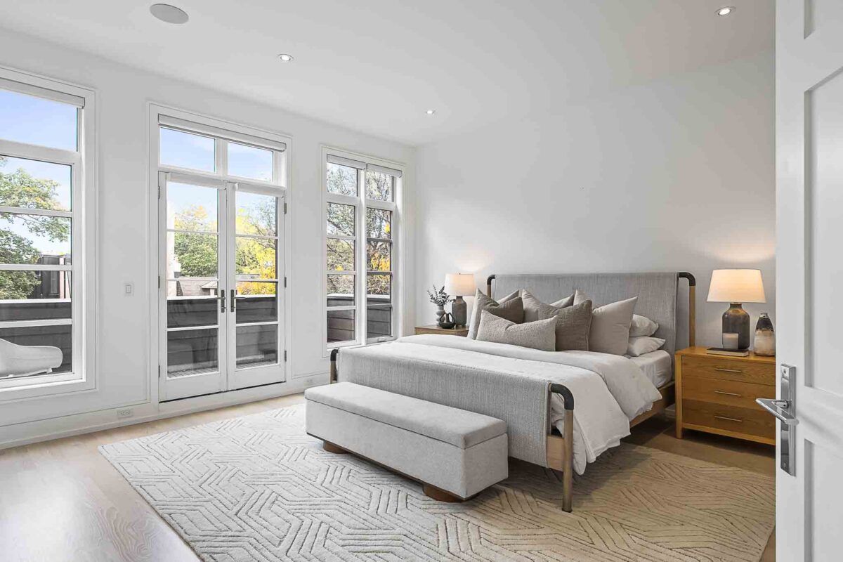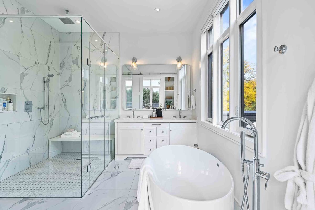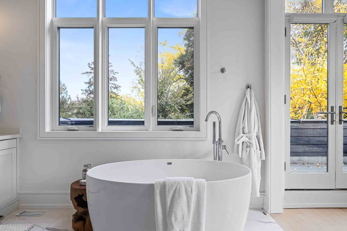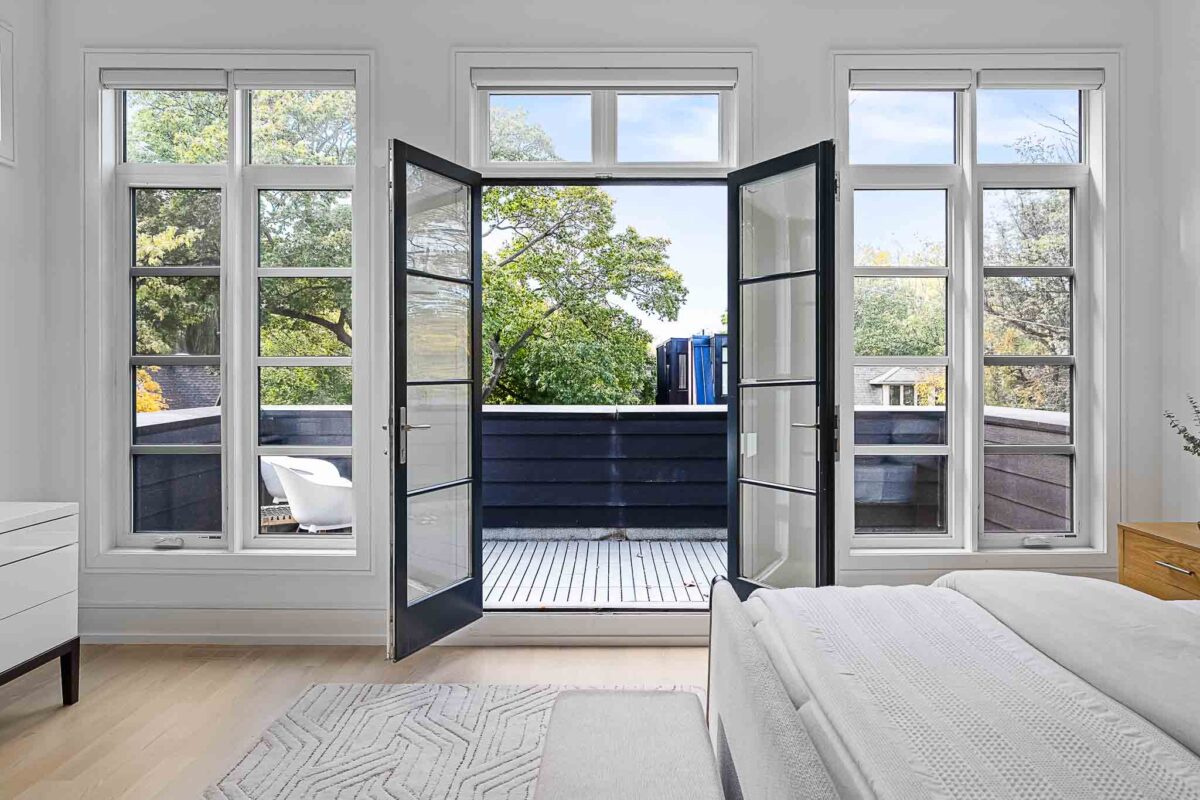 The third floor is dedicated entirely to the primary suite, and it is quite a retreat to enjoy. French doors open to the king-sized bedroom with a tandem seating area and a walk-out to one of two terraces on this floor. The walk-in dressing room is perfectly lined with carefully planned storage for each parent, with drawers, long hanging, short hanging and ample cupboard space. Carrying past this, more custom millwork and storage line the south wall before arriving at the gorgeous ensuite bathroom, outfitted with a huge walk-in shower, double vanity and deep soaking tub. Walk out to the second terrace with the most incredible treetop views, and relax amongst the canopy of birch and maple leaves fluttering in the wind.