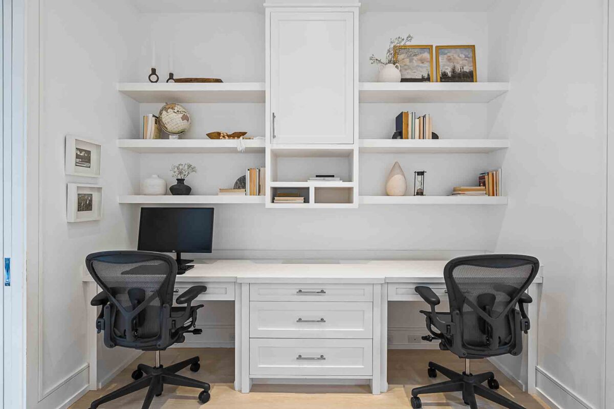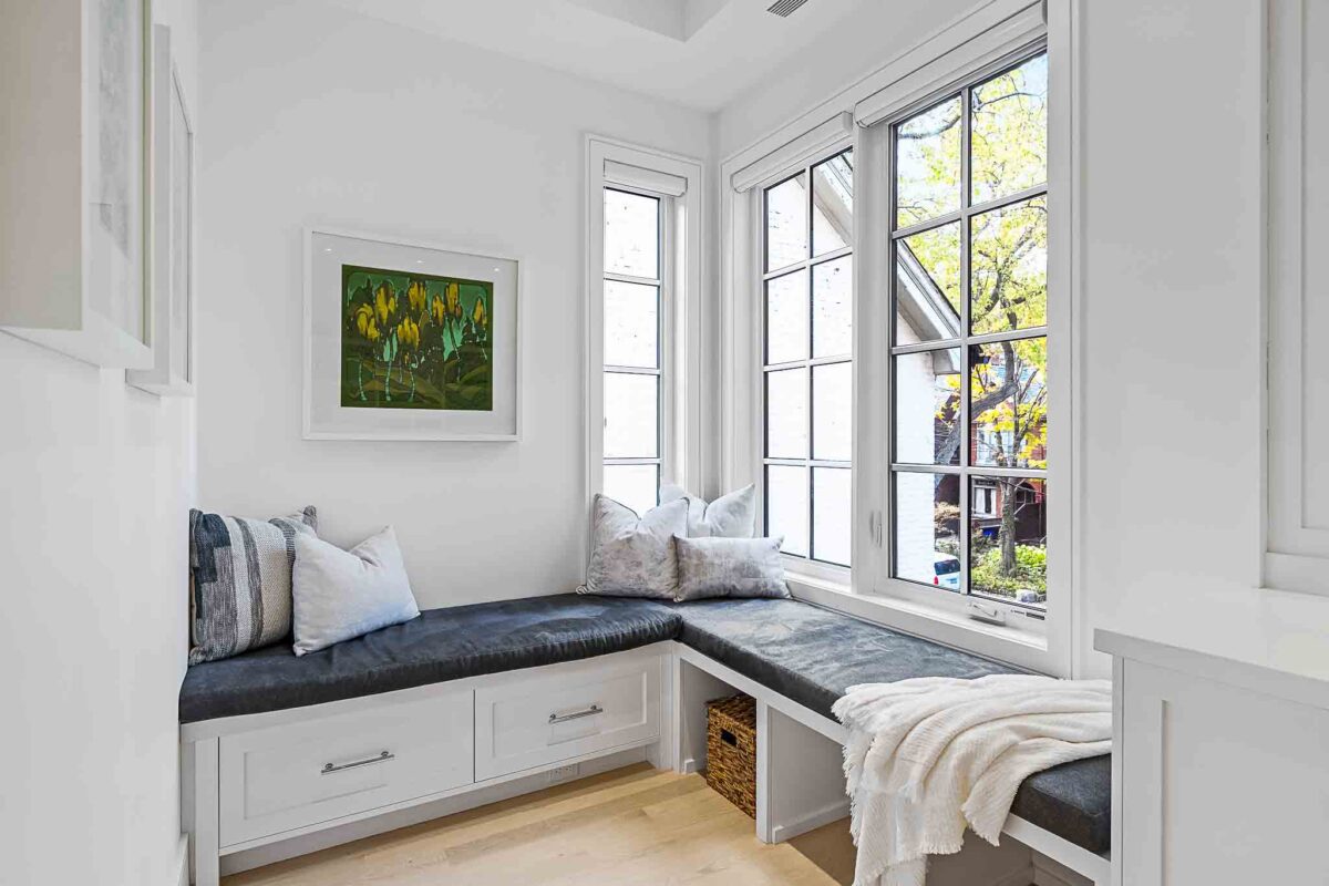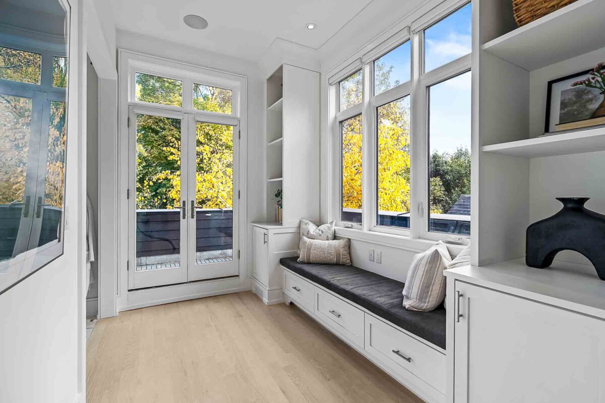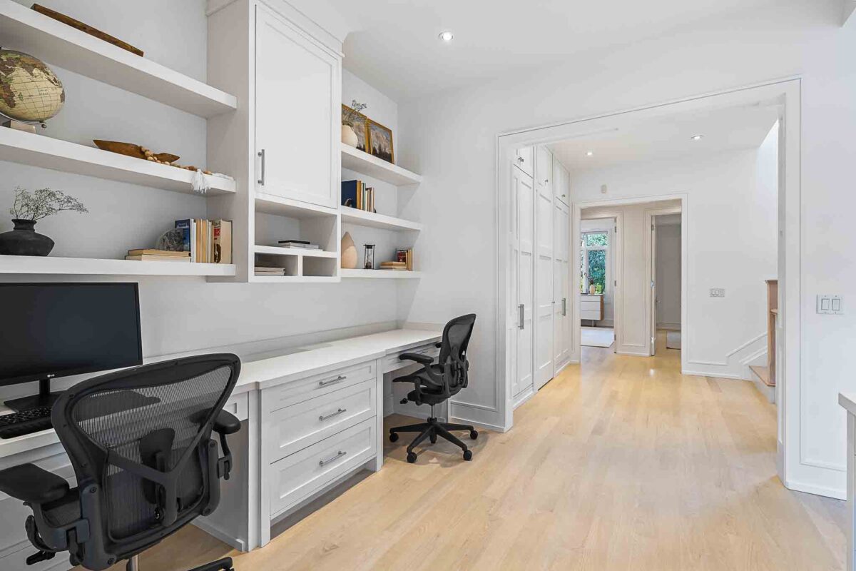 The footprint and design of the second floor were so thoughtfully planned. It holds three huge bedrooms, a built-in home office, and two large renovated bathrooms. The front bedroom is currently used as a second-floor family room and holds a four-piece ensuite bathroom. Children can bond more easily with connecting bedrooms, and each is outfitted with large walk-in closets. The second-floor office or homework area provides for two workstations, and a tandem window bench is framed under windows that face both south and west.