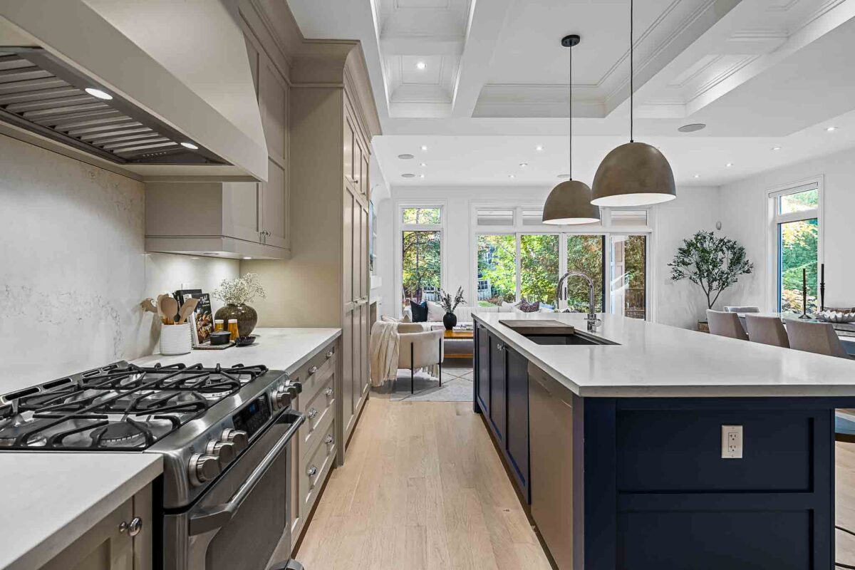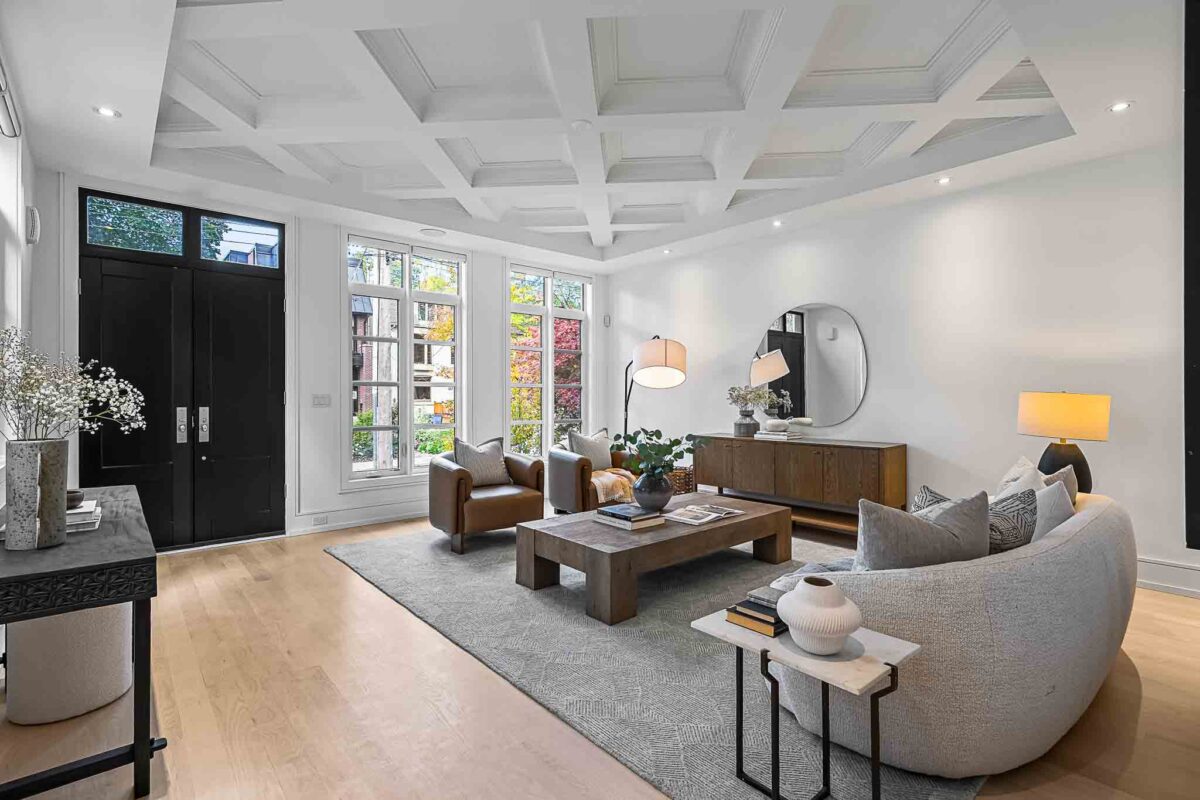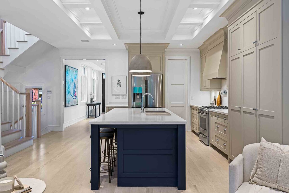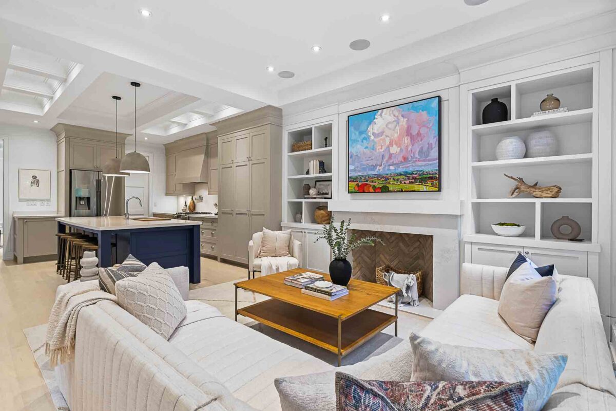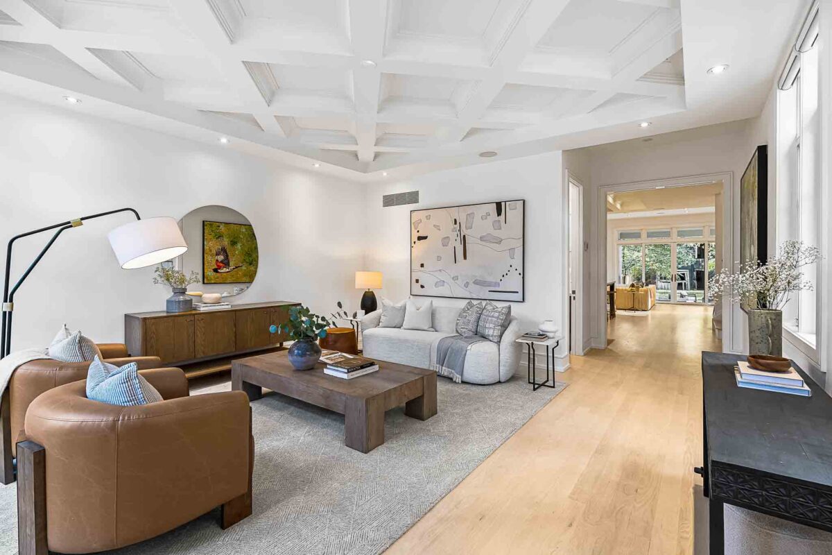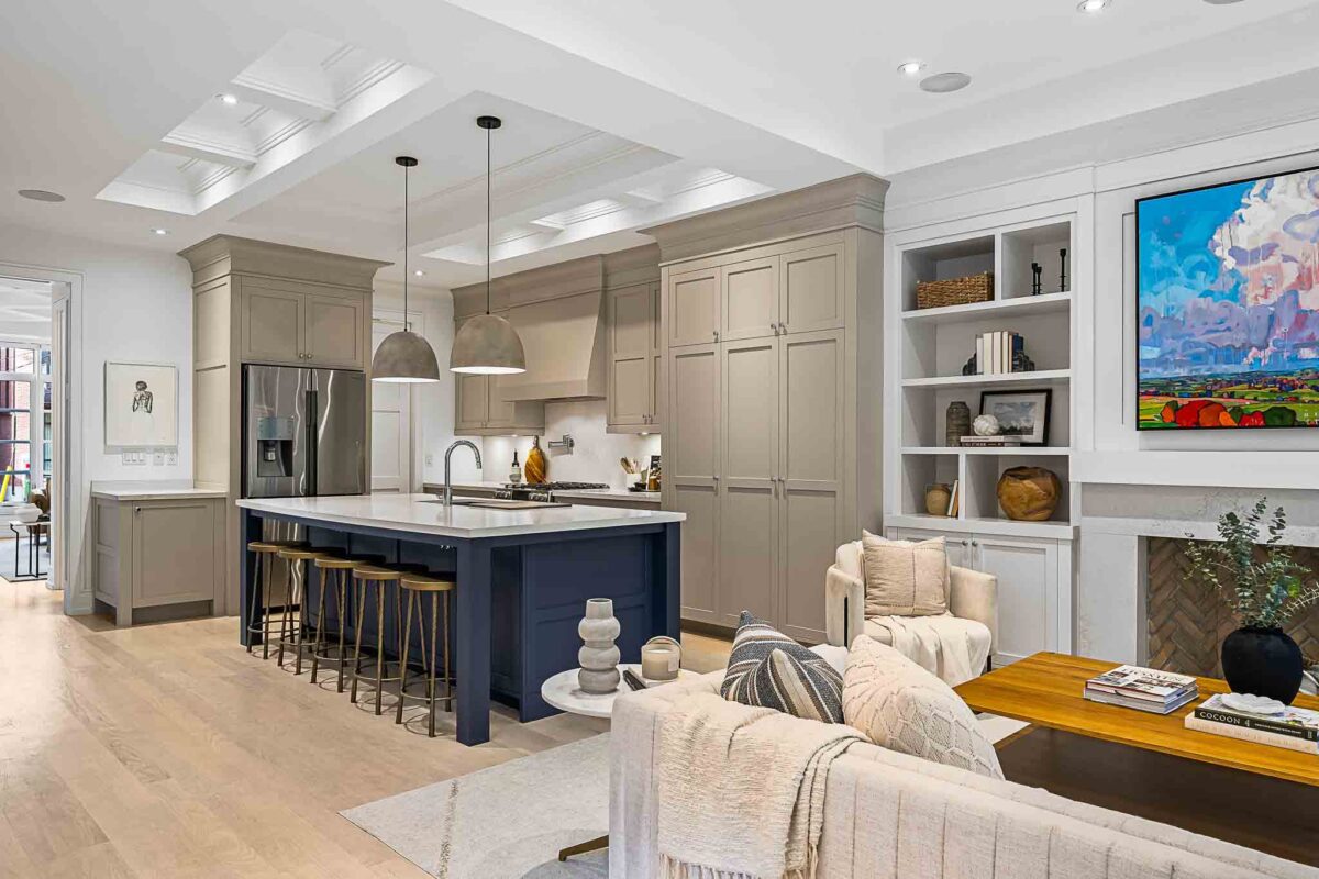 Within its walls, ceiling heights reach ten feet on the main floor, and the interior spaces impress with every corner you turn. Light plays an important role within the home, with oversized windows pouring natural light onto each level. The living room is beautifully appointed with coffered ceilings and impressive proportions. Pass by the discreetly positioned powder room with its lightbox art installation to reach the astounding open-concept interactive space where everyday lives are lived.