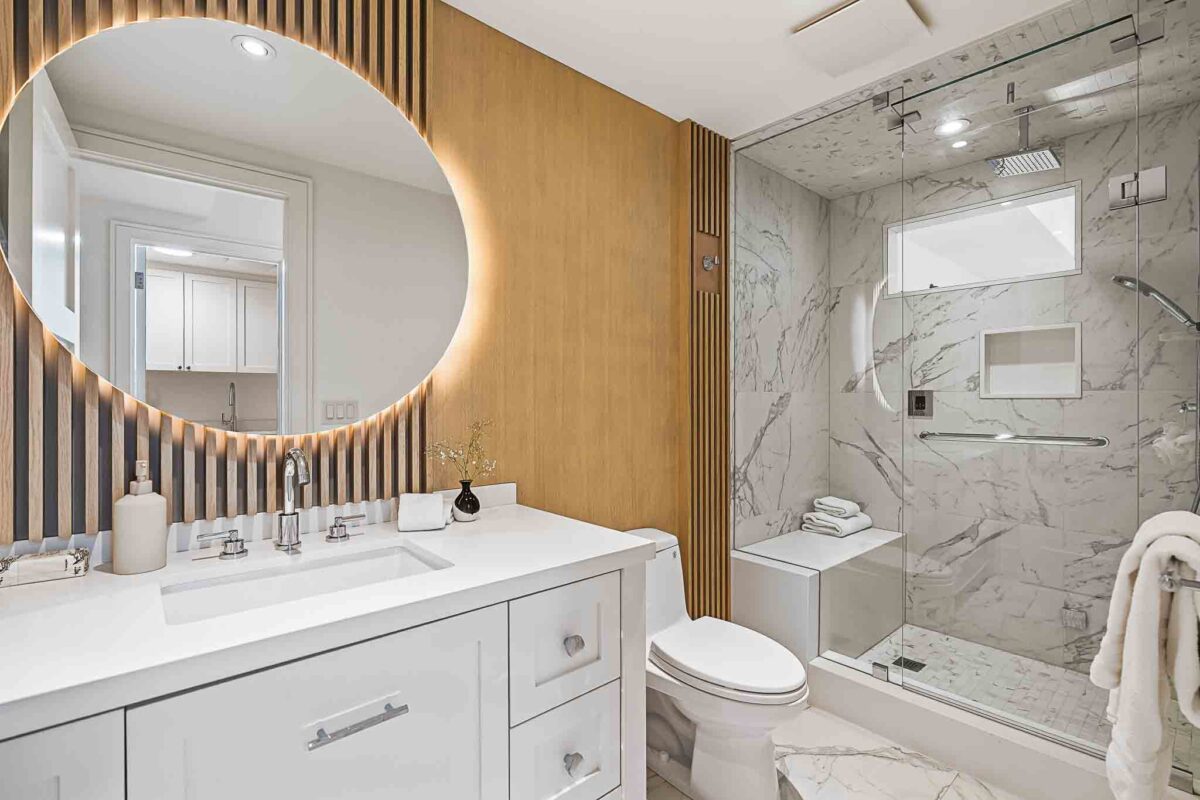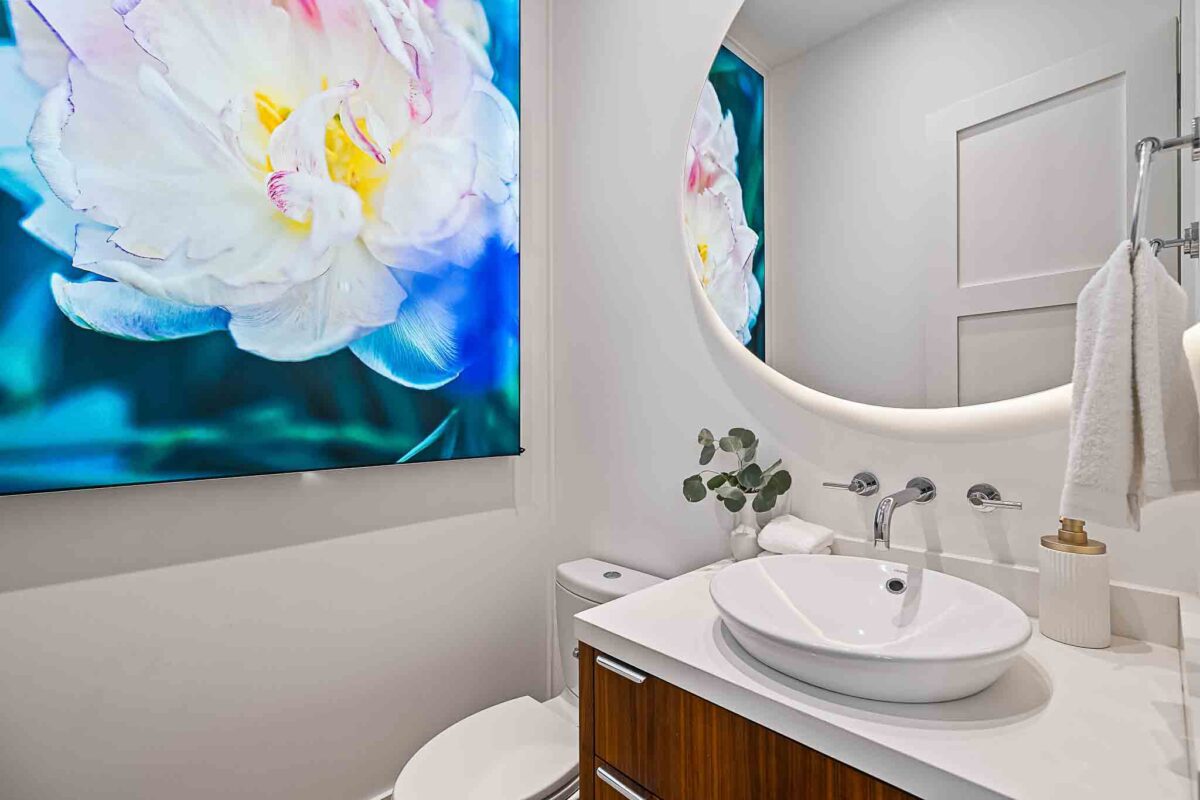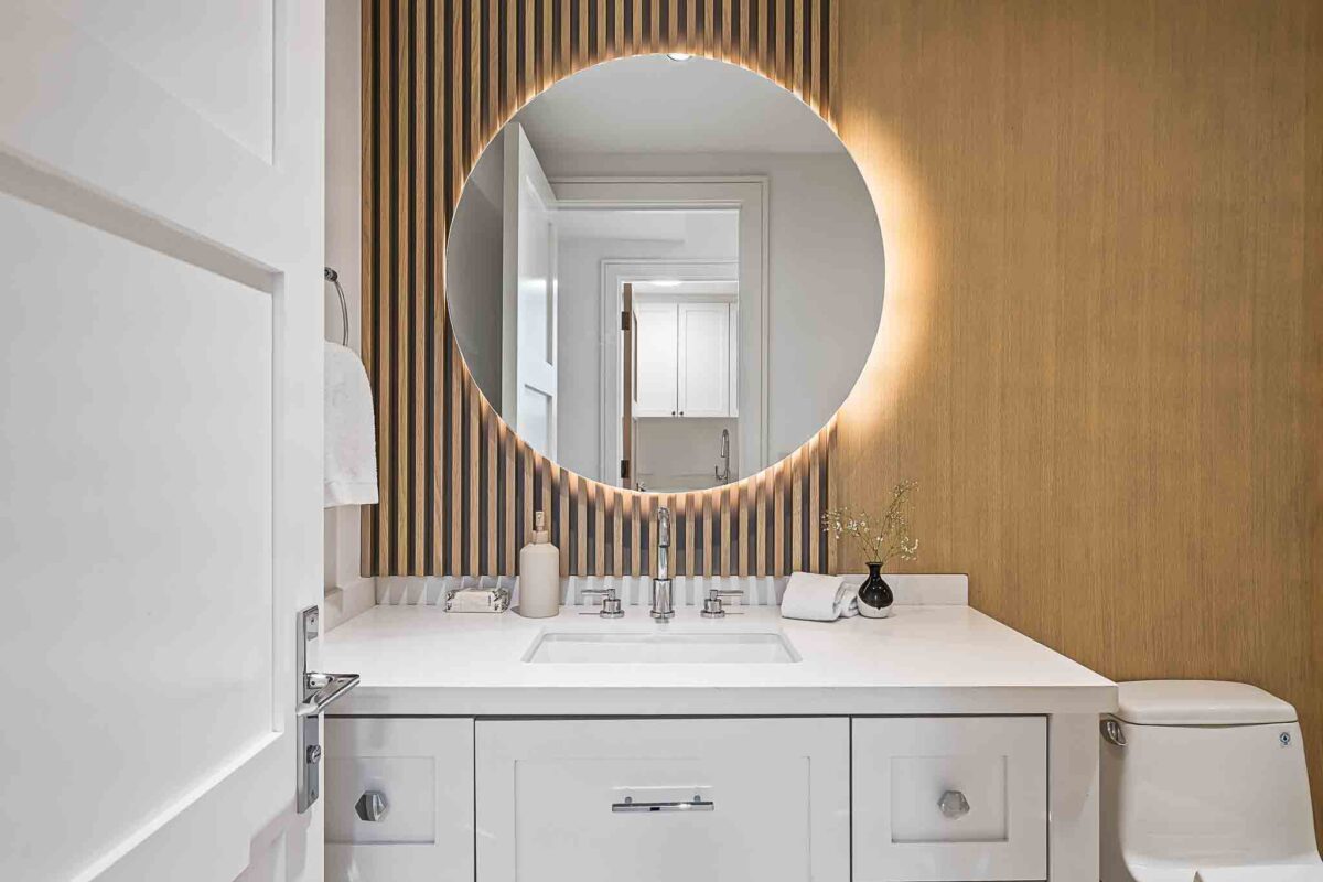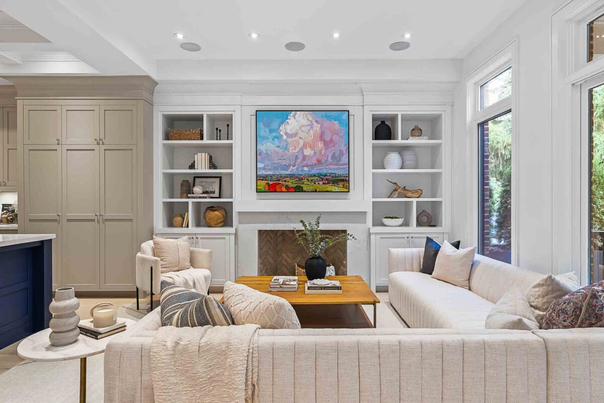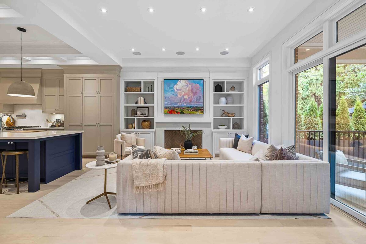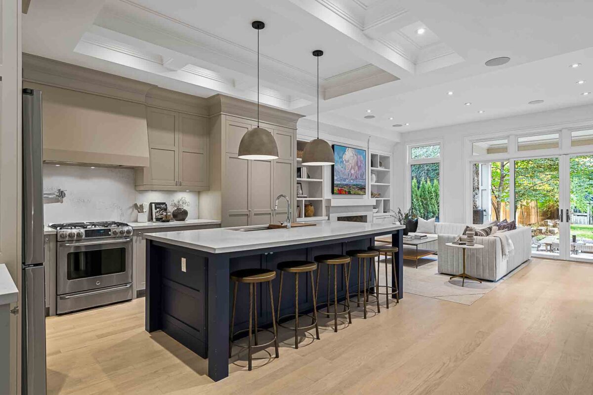 Within its walls, ceiling heights reach ten feet on the main floor, and the interior spaces impress with every corner you turn. Light plays an important role within the home, with oversized windows pouring natural light onto each level. The living room is beautifully appointed with coffered ceilings and impressive proportions. Pass by the discreetly positioned powder room with its lightbox art installation to reach the astounding open-concept interactive space where everyday lives are lived.