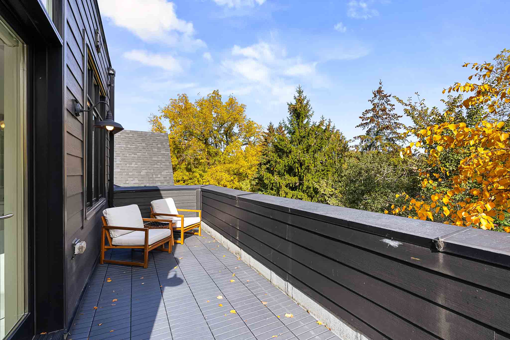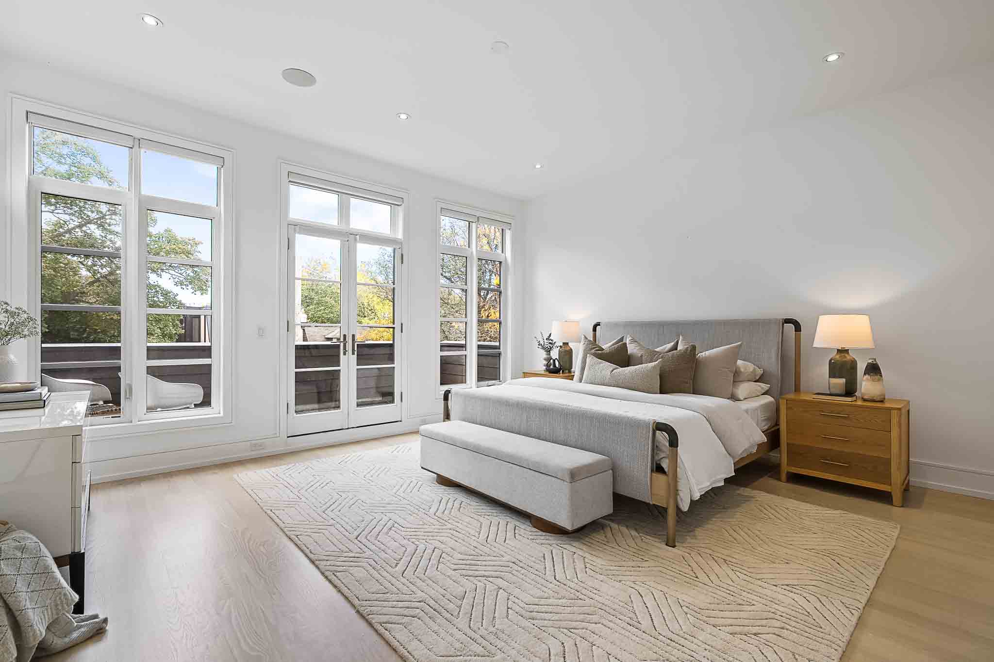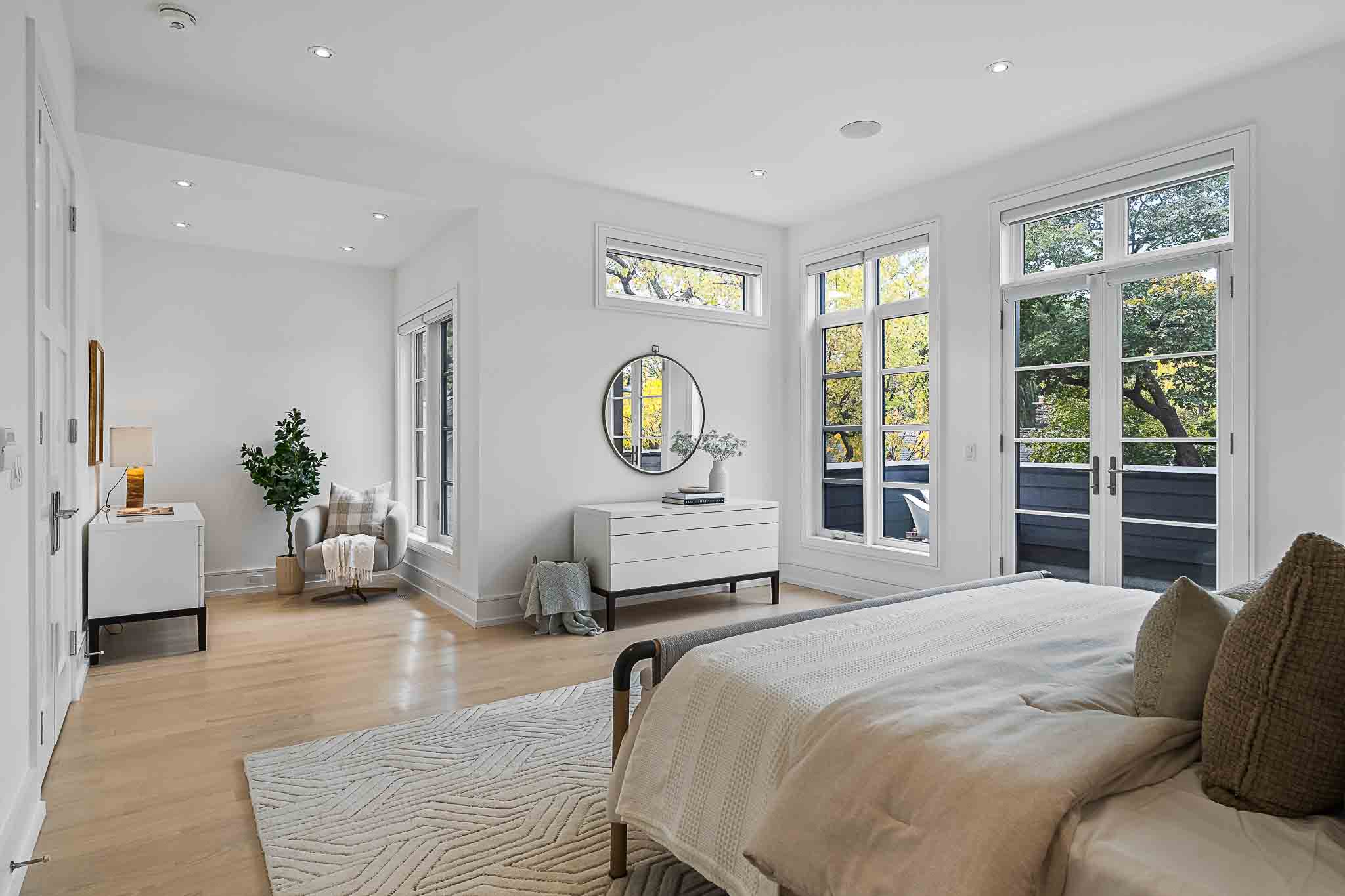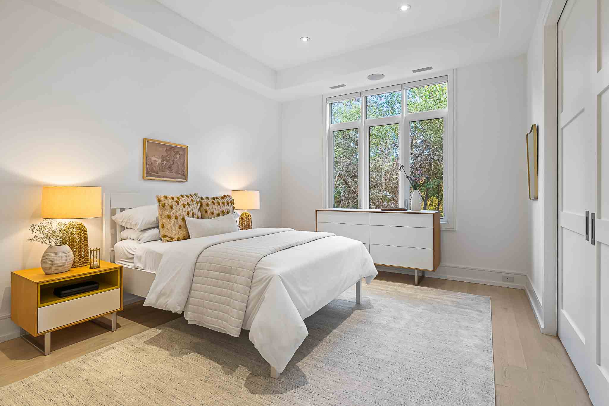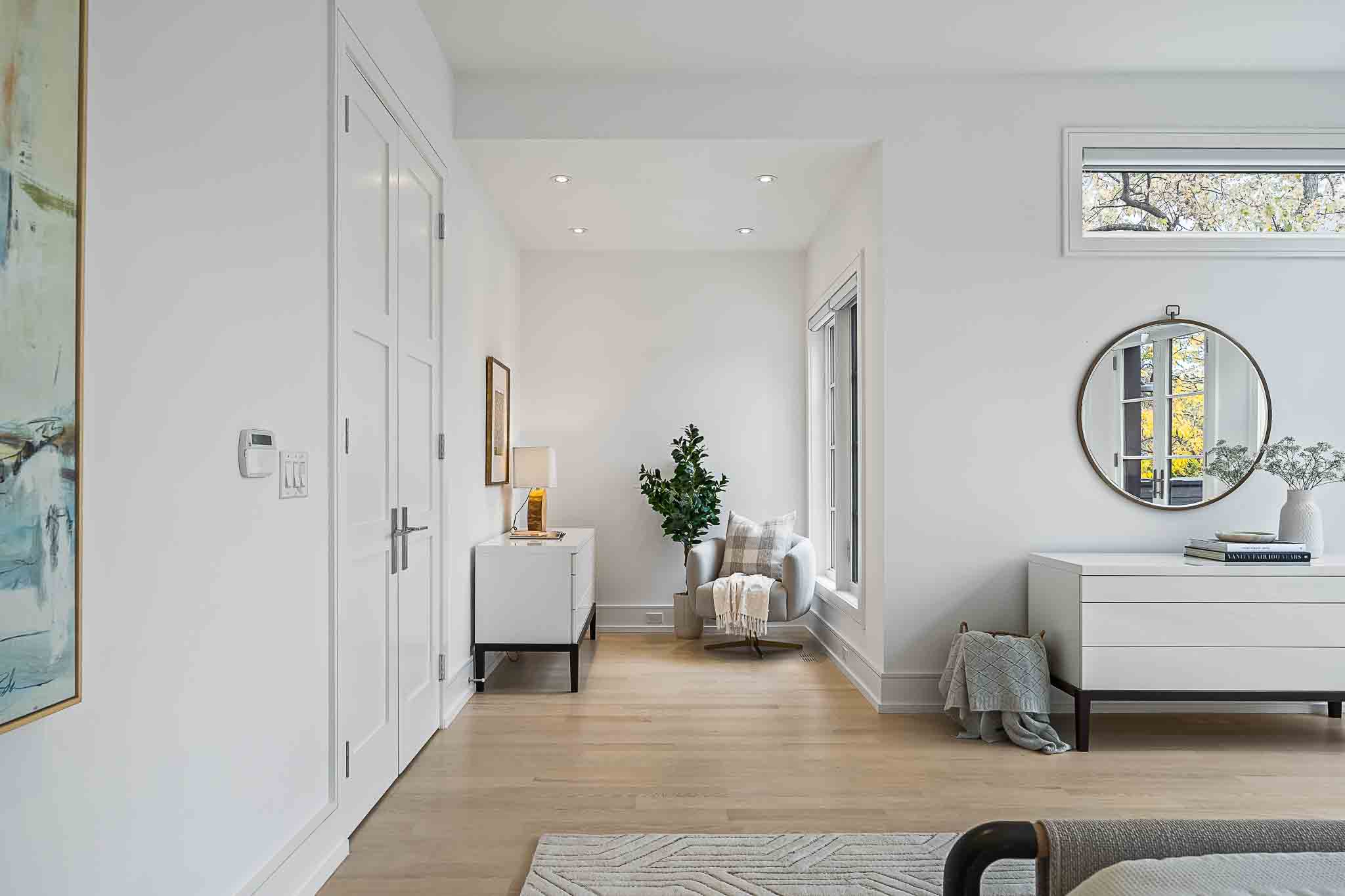 The third floor is dedicated entirely to the primary suite, and it is quite a retreat to enjoy. French doors open to the king-sized bedroom with a tandem seating area and a walk-out to one of two terraces on this floor. The walk-in dressing room is perfectly lined with carefully planned storage for each parent, with drawers, long hanging, short hanging and ample cupboard space. Carrying past this, more custom millwork and storage line the south wall before arriving at the gorgeous ensuite bathroom, outfitted with a huge walk-in shower, double vanity and deep soaking tub. Walk out to the second terrace with the most incredible treetop views, and relax amongst the canopy of birch and maple leaves fluttering in the wind.