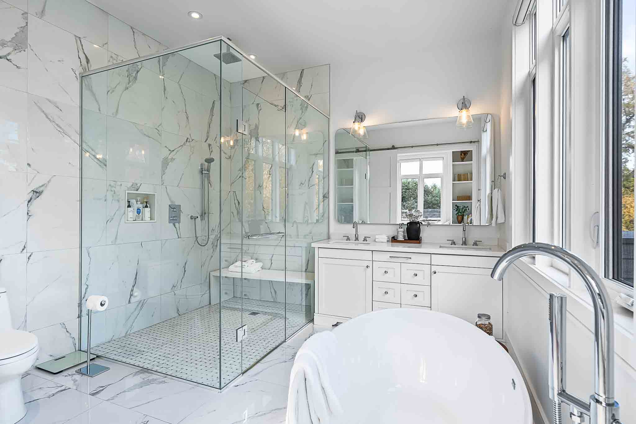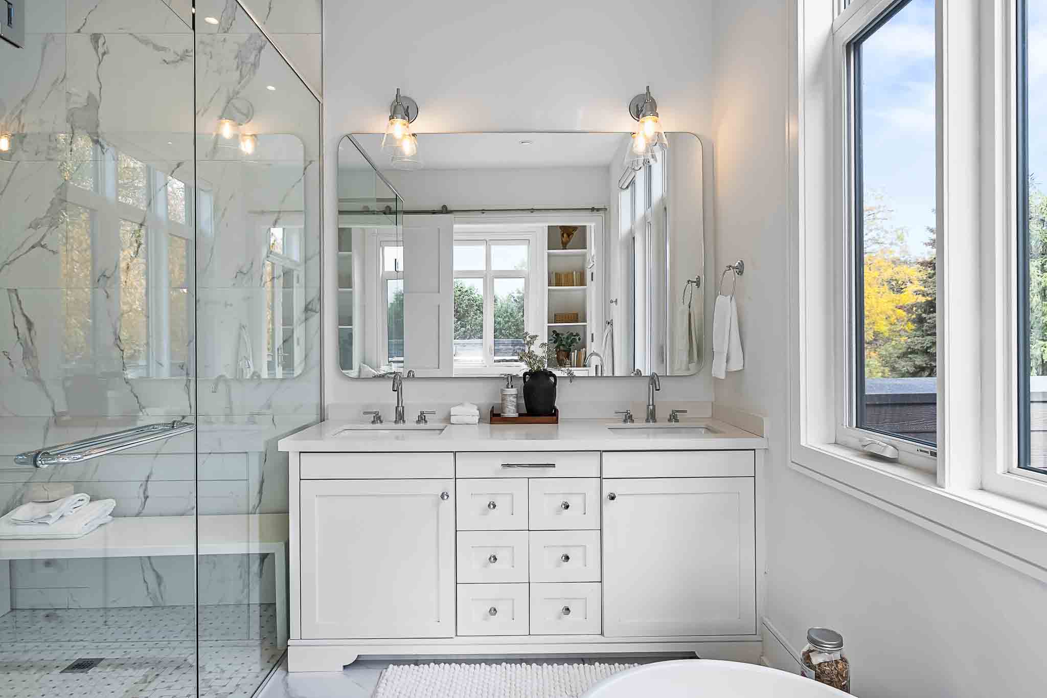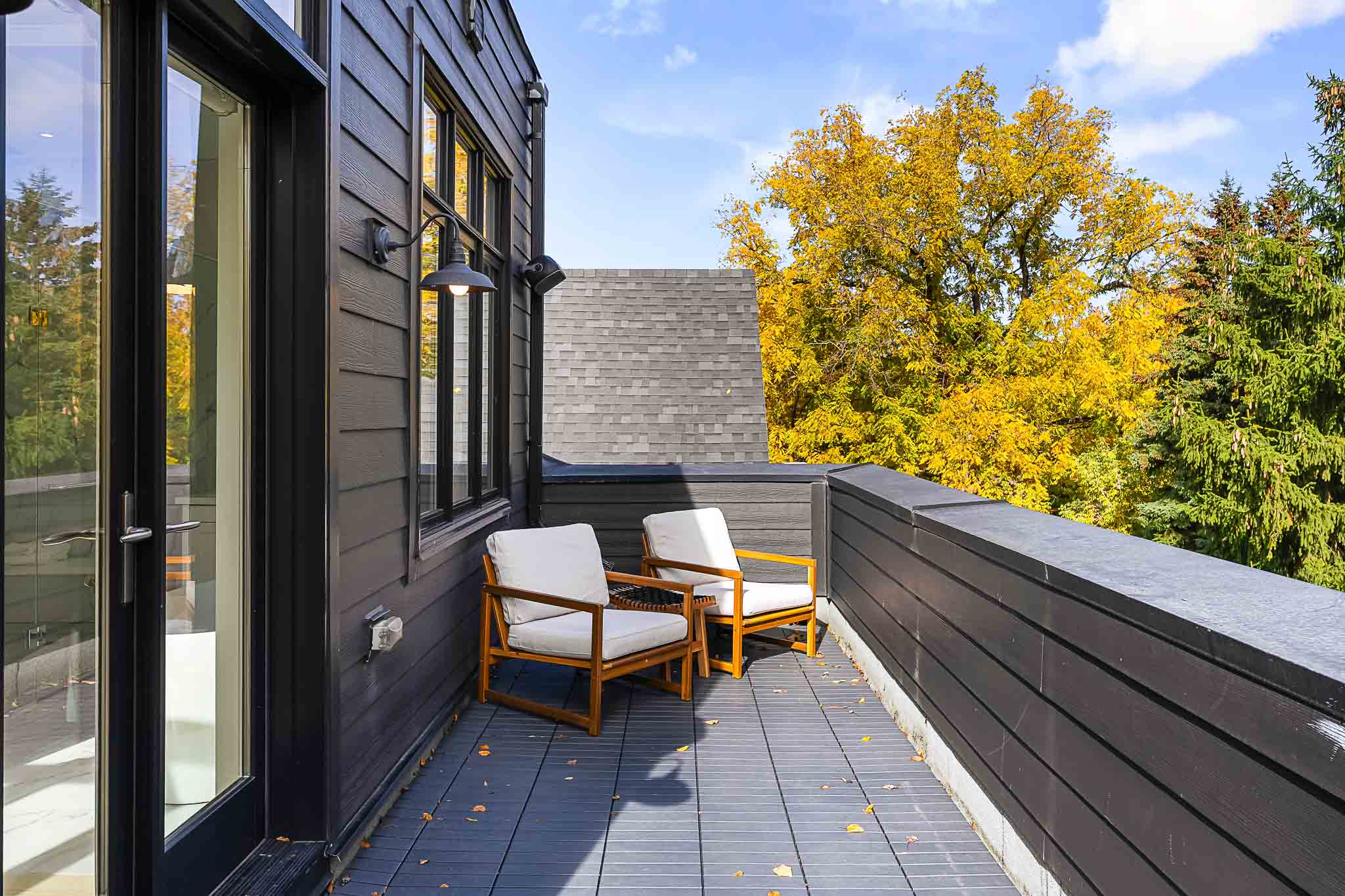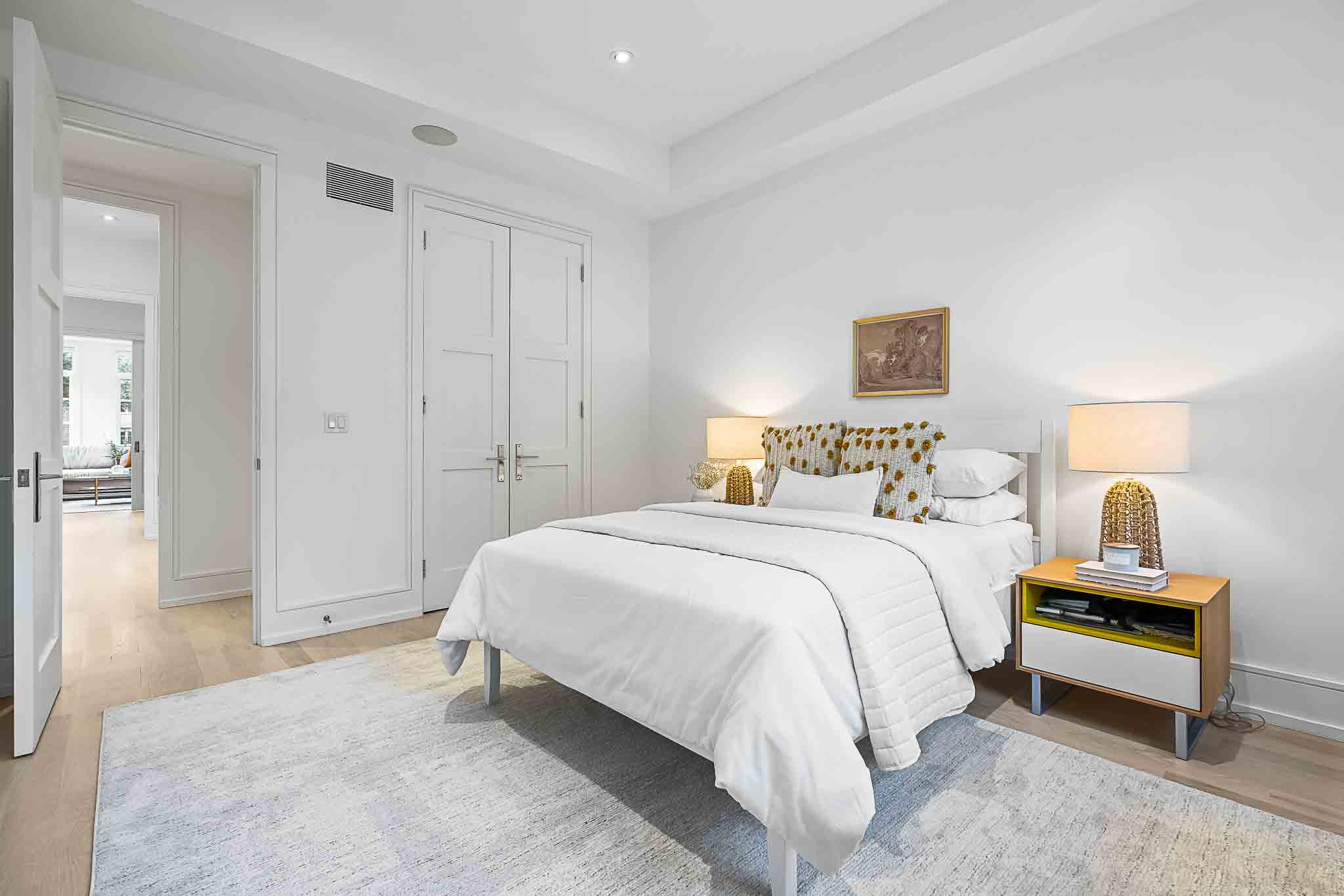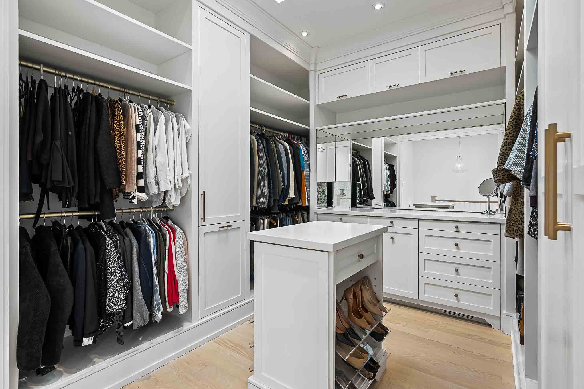 The third floor is dedicated entirely to the primary suite, and it is quite a retreat to enjoy. French doors open to the king-sized bedroom with a tandem seating area and a walk-out to one of two terraces on this floor. The walk-in dressing room is perfectly lined with carefully planned storage for each parent, with drawers, long hanging, short hanging and ample cupboard space. Carrying past this, more custom millwork and storage line the south wall before arriving at the gorgeous ensuite bathroom, outfitted with a huge walk-in shower, double vanity and deep soaking tub. Walk out to the second terrace with the most incredible treetop views, and relax amongst the canopy of birch and maple leaves fluttering in the wind.