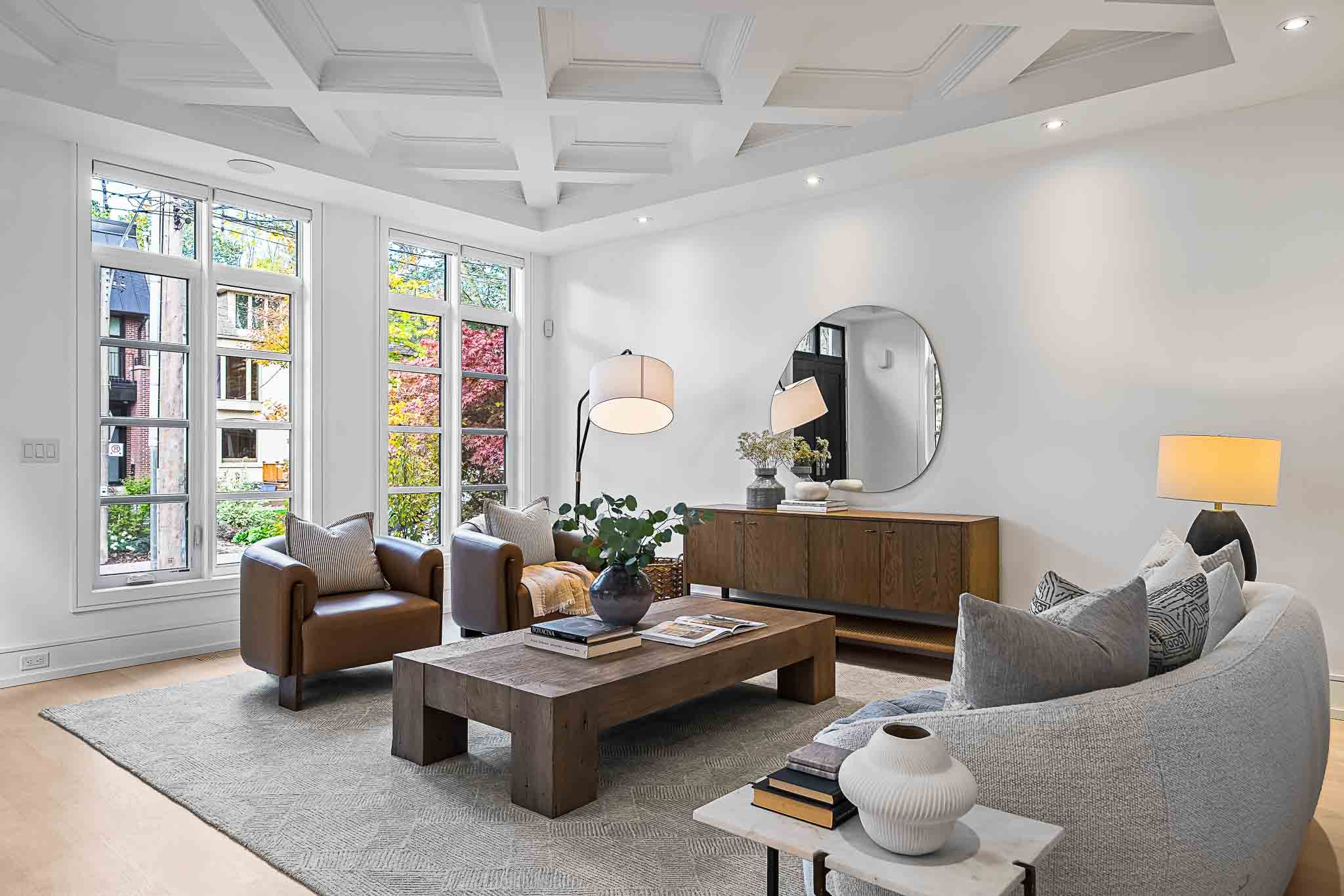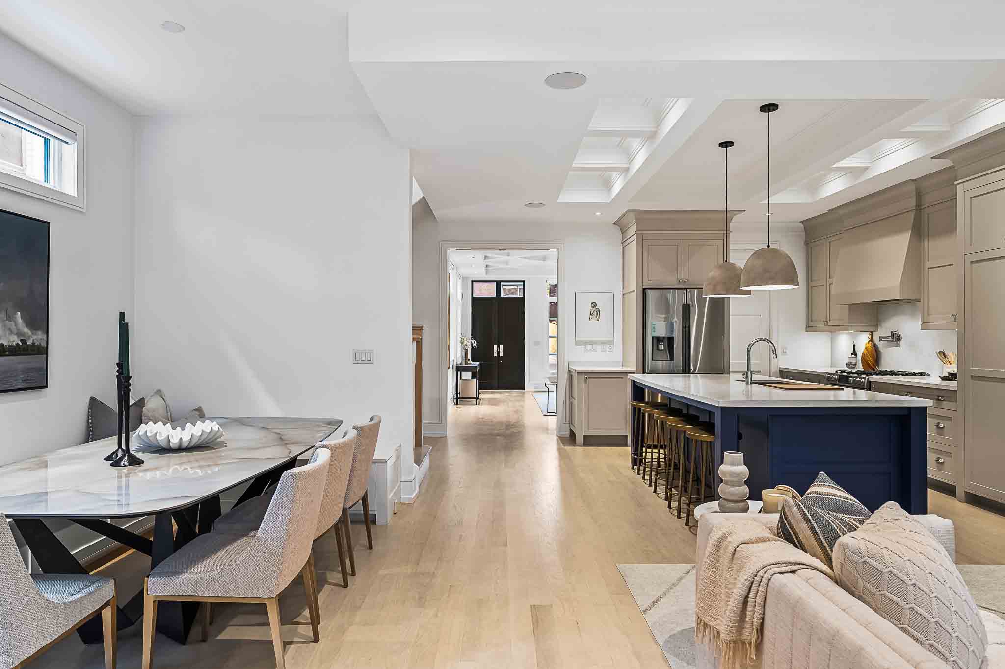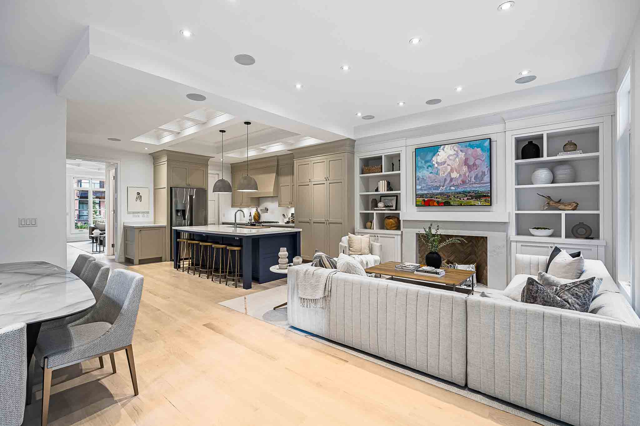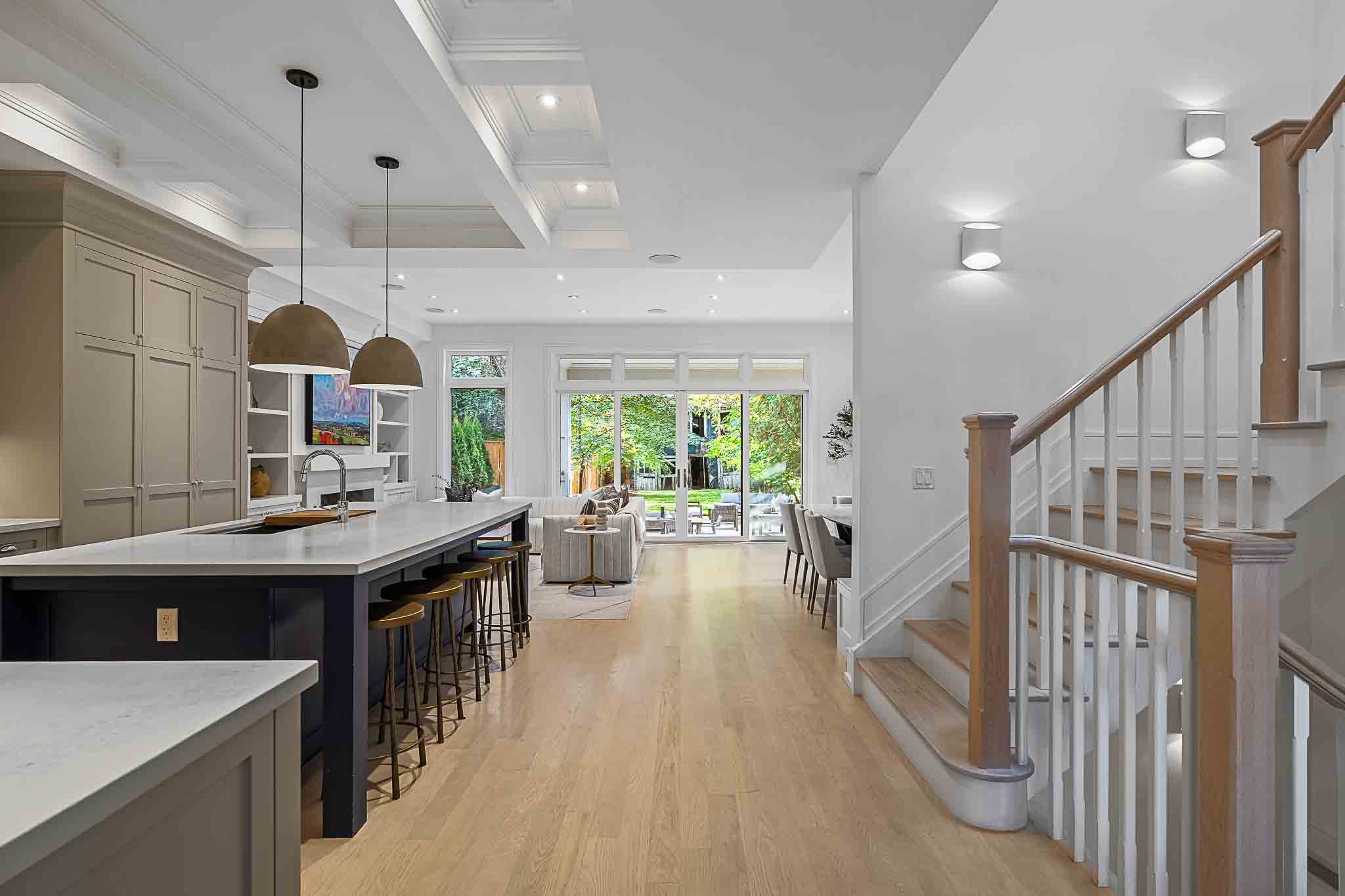 Within its walls, ceiling heights reach ten feet on the main floor, and the interior spaces impress with every corner you turn. Light plays an important role within the home, with oversized windows pouring natural light onto each level. The living room is beautifully appointed with coffered ceilings and impressive proportions. Pass by the discreetly positioned powder room with its lightbox art installation to reach the astounding open-concept interactive space where everyday lives are lived.