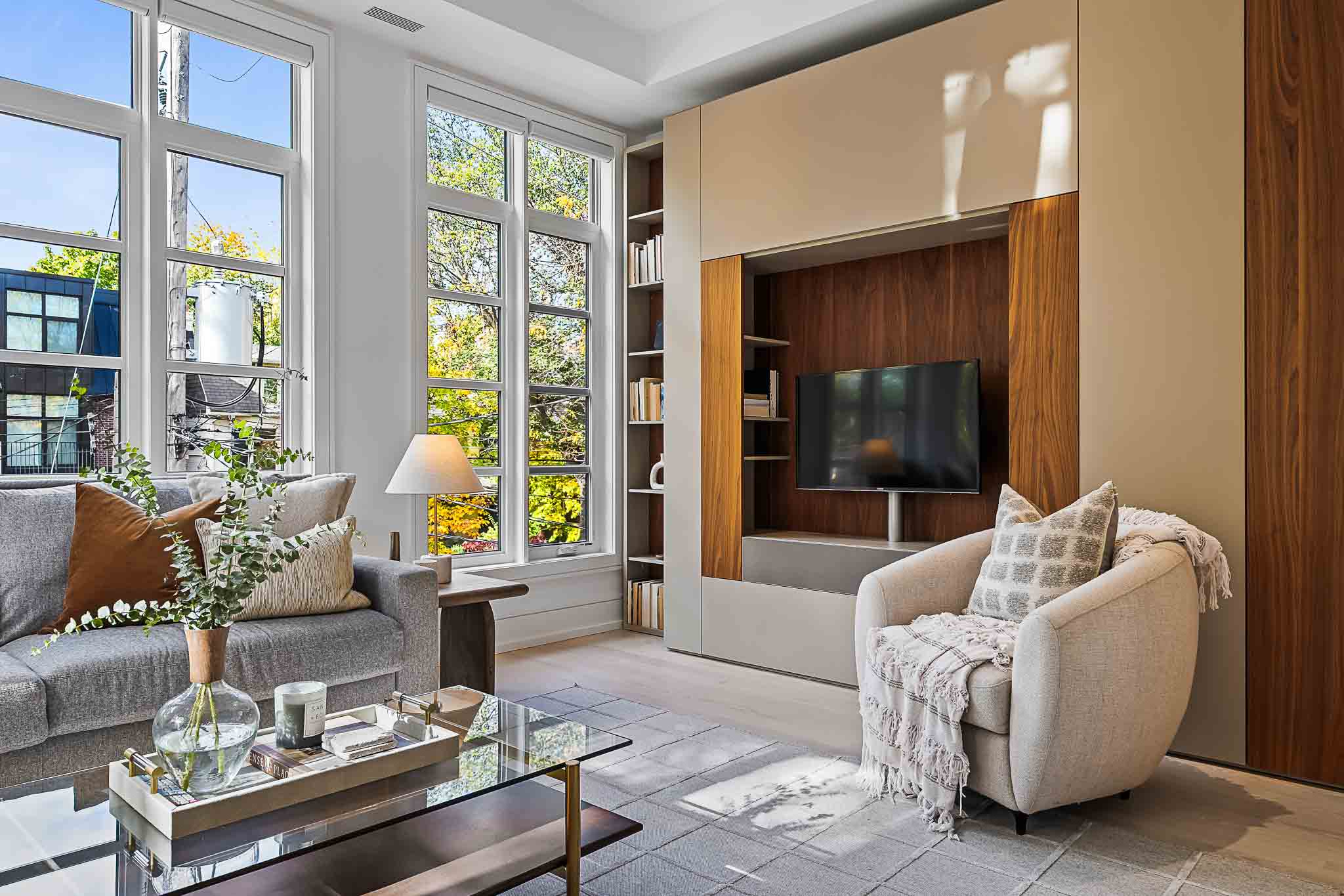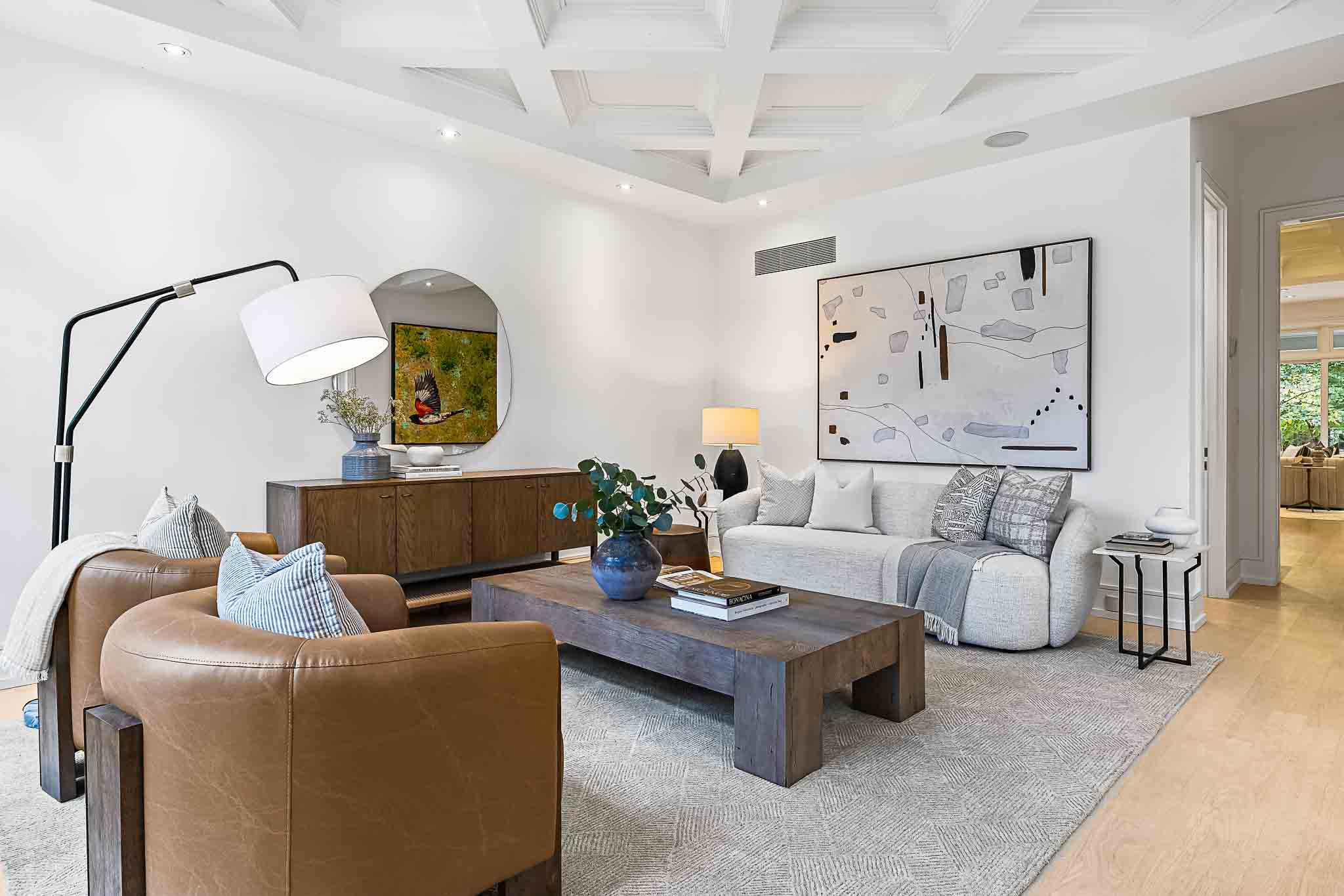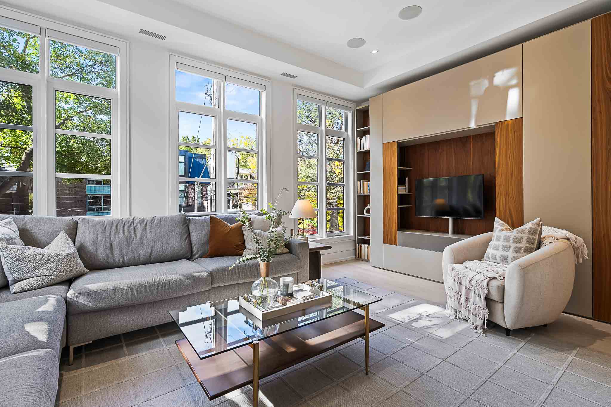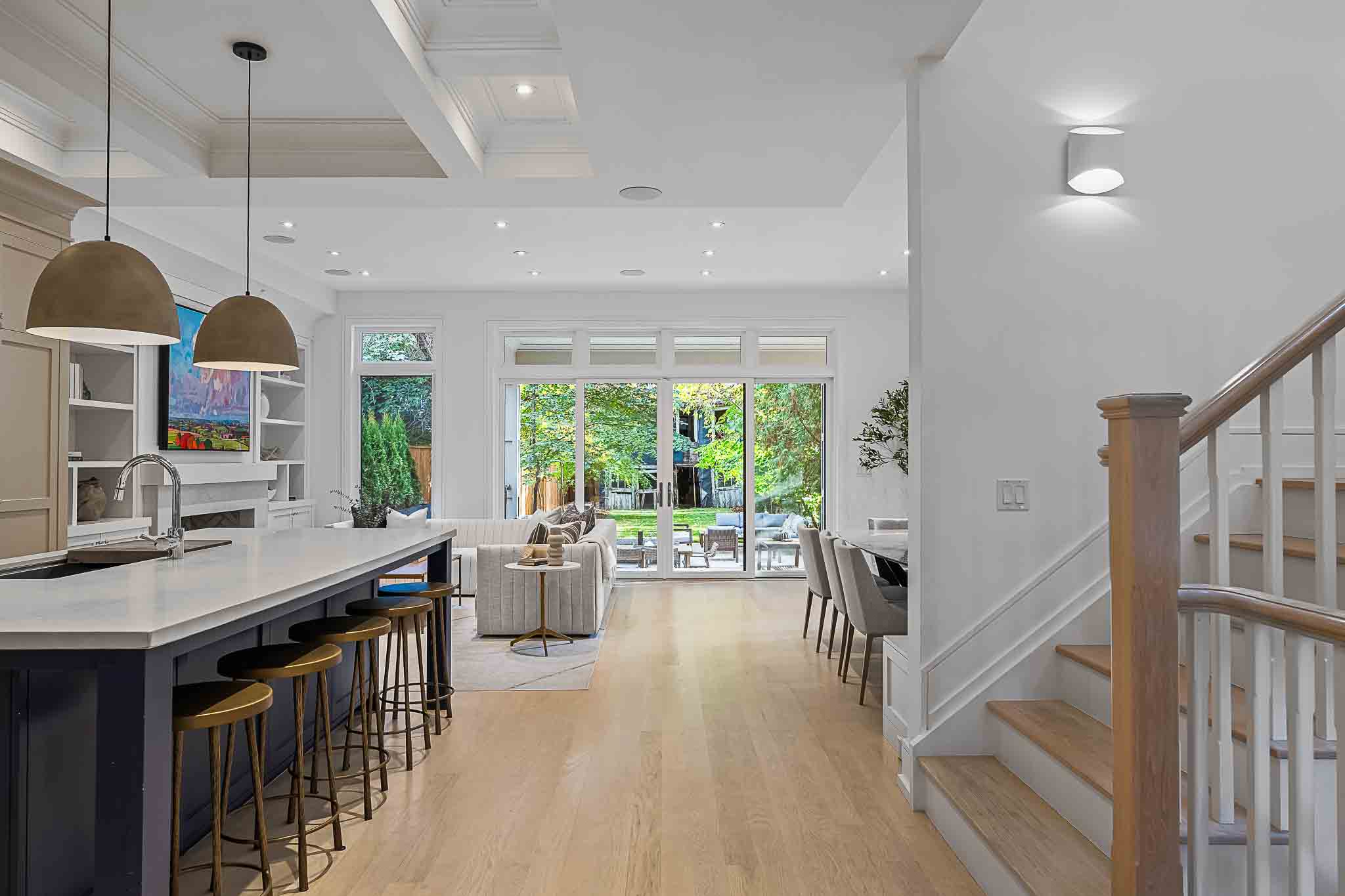 Within its walls, ceiling heights reach ten feet on the main floor, and the interior spaces impress with every corner you turn. Light plays an important role within the home, with oversized windows pouring natural light onto each level. The living room is beautifully appointed with coffered ceilings and impressive proportions. Pass by the discreetly positioned powder room with its lightbox art installation to reach the astounding open-concept interactive space where everyday lives are lived.