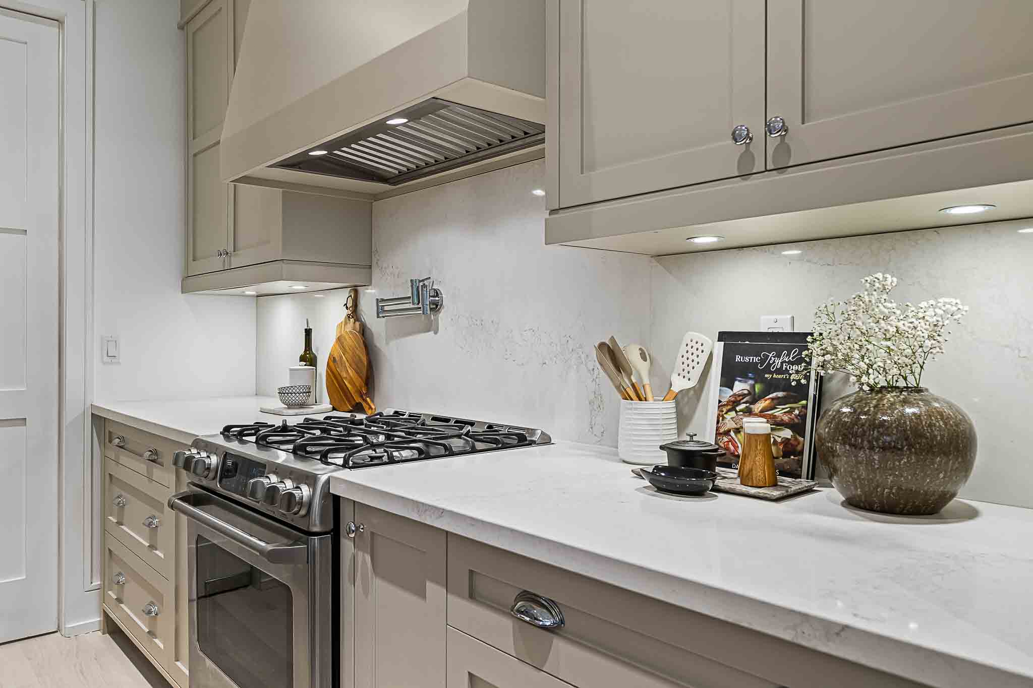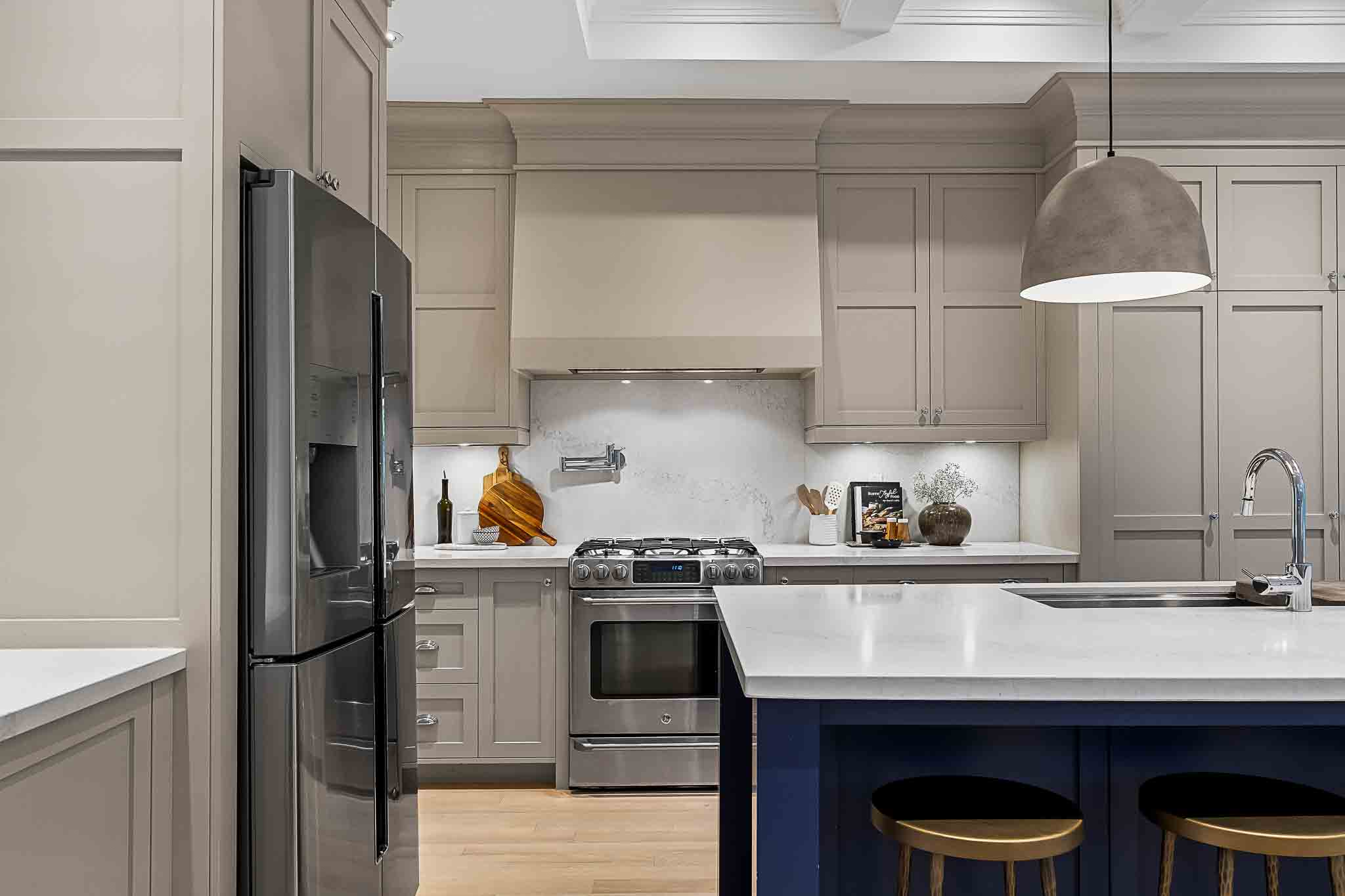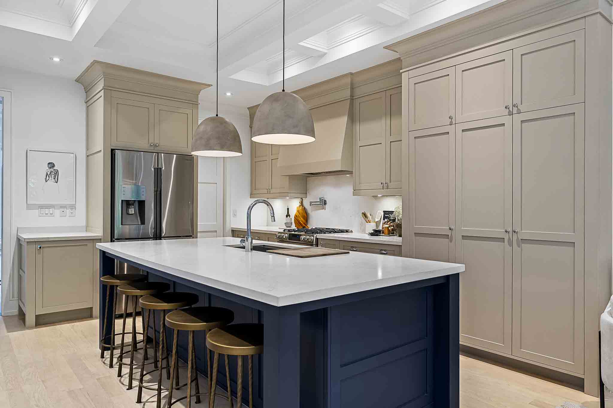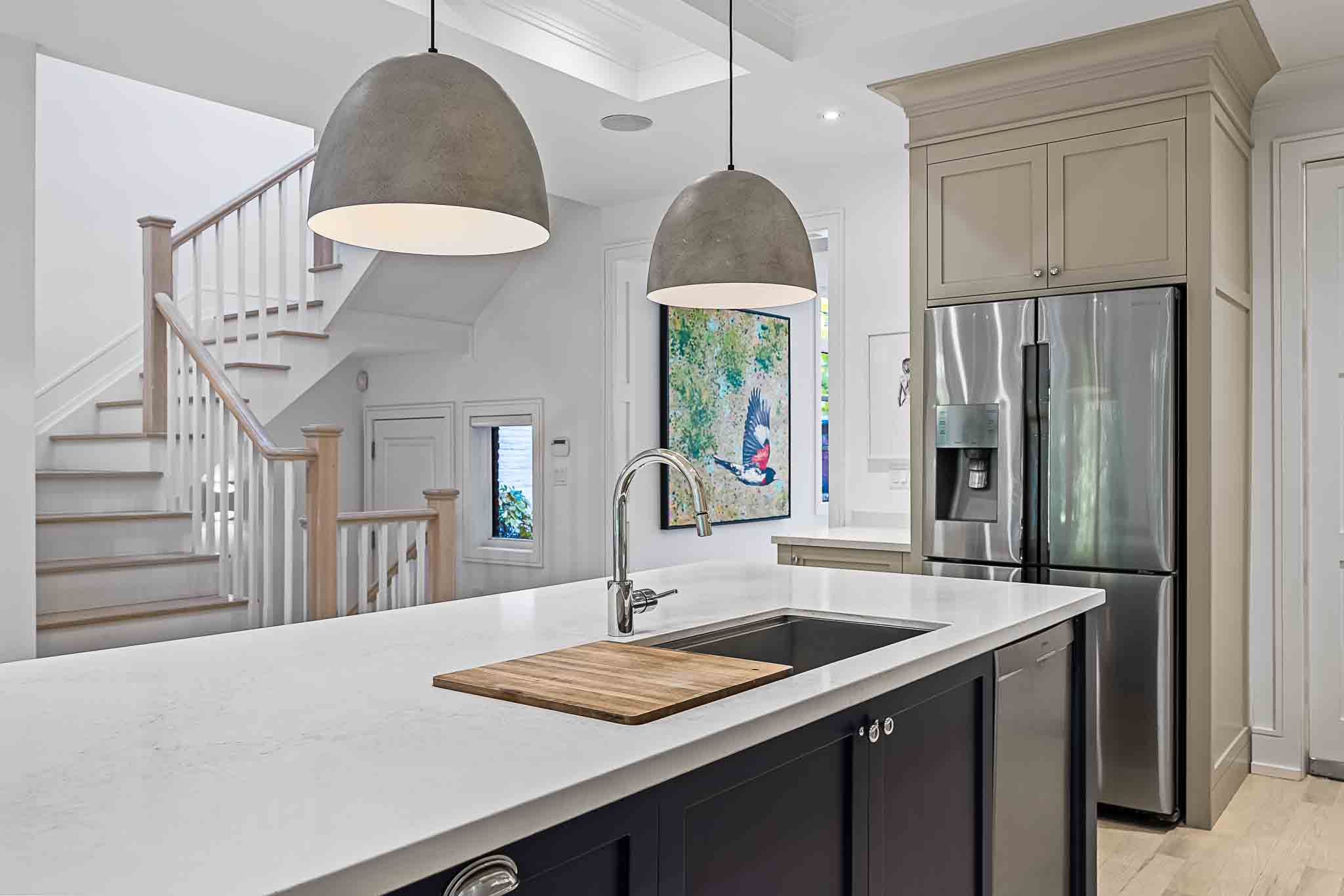 Within its walls, ceiling heights reach ten feet on the main floor, and the interior spaces impress with every corner you turn. Light plays an important role within the home, with oversized windows pouring natural light onto each level. The living room is beautifully appointed with coffered ceilings and impressive proportions. Pass by the discreetly positioned powder room with its lightbox art installation to reach the astounding open-concept interactive space where everyday lives are lived.