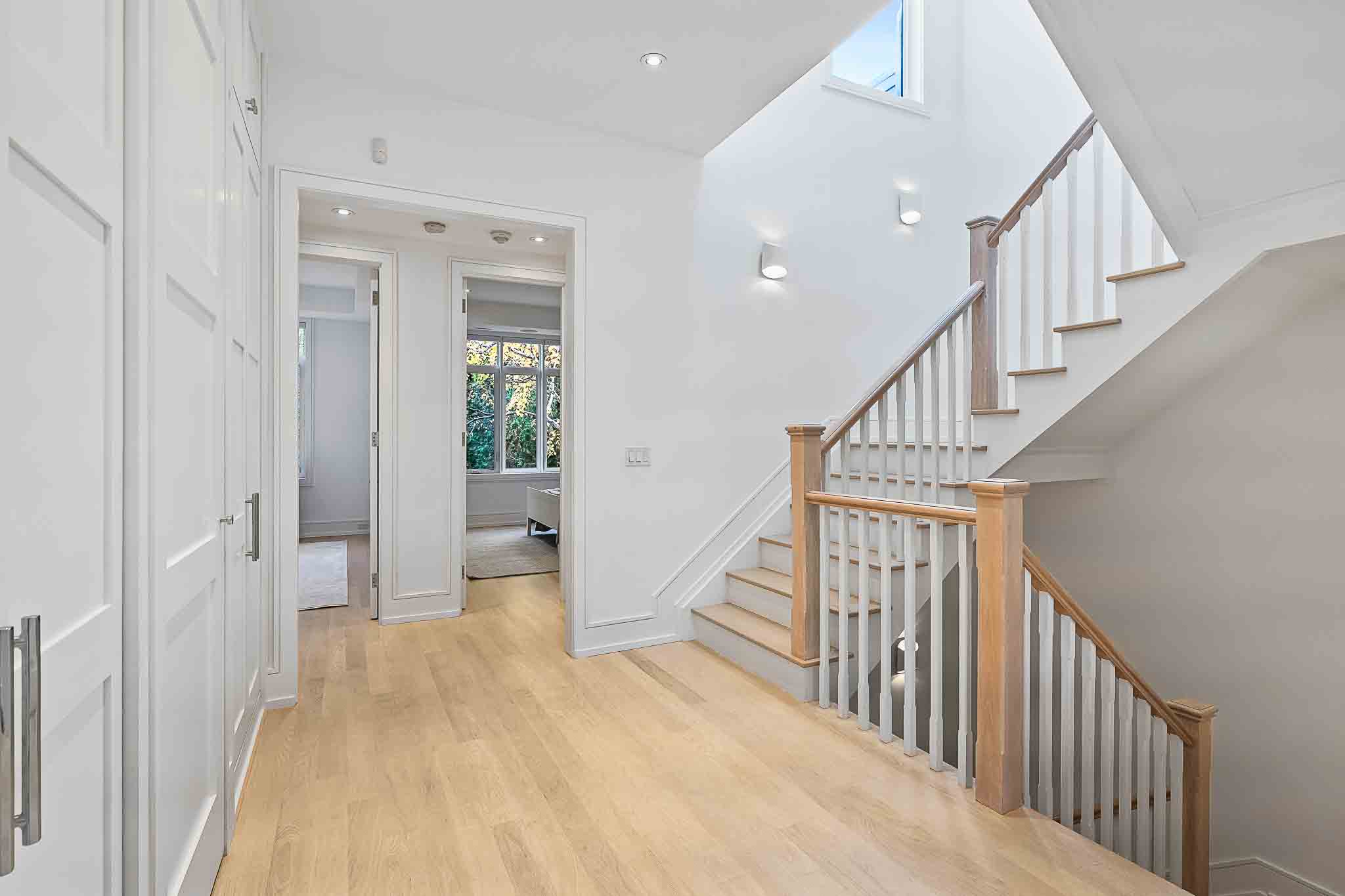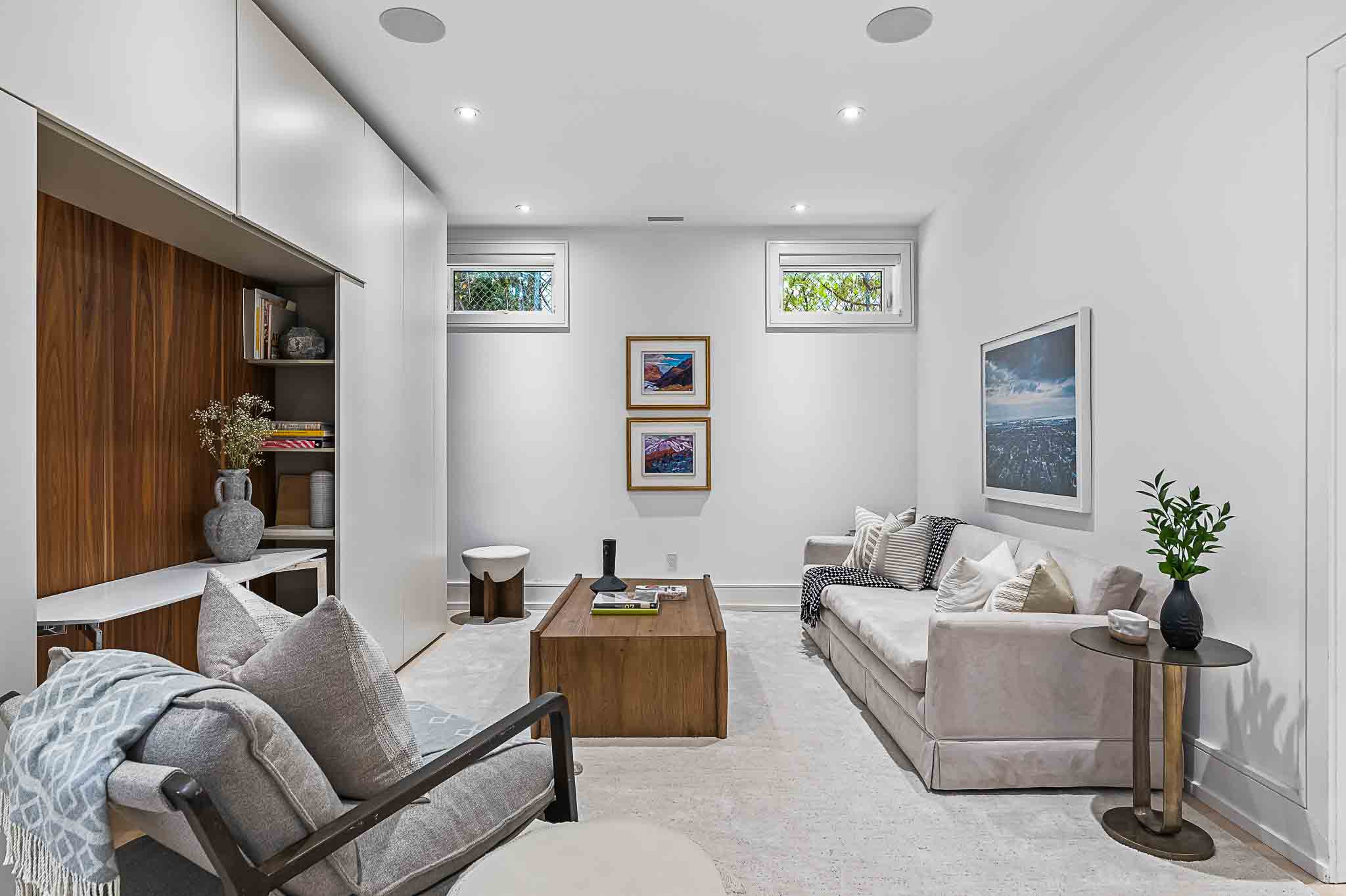 The home is serviced by a very rare private driveway with parking for up to two cars. A side room entrance from the private driveway connects quickly to the mud room that lies at the base of the stairs, with built-in cubbies for all family members. The recreation room expands to the full width of the home, allowing for multiple zones of entertainment and with a direct walk-out to the garden. An in-law or guest suite is set at the front of the basement and has access to a beautifully appointed four-piece bathroom with a custom oak wall feature and a large steam shower. The laundry room holds full-sized machines, a stainless steel soaking sink and built-in cabinets for extra storage. Storage opportunities continue in the two huge closets on this floor, as well as the two cavities underneath the staircase. Outside the walk-out from the basement is a massive storage room underneath the covered porch above, serving as a concealed storage room for outdoor furniture, landscaping items, winter tires and seasonal items.