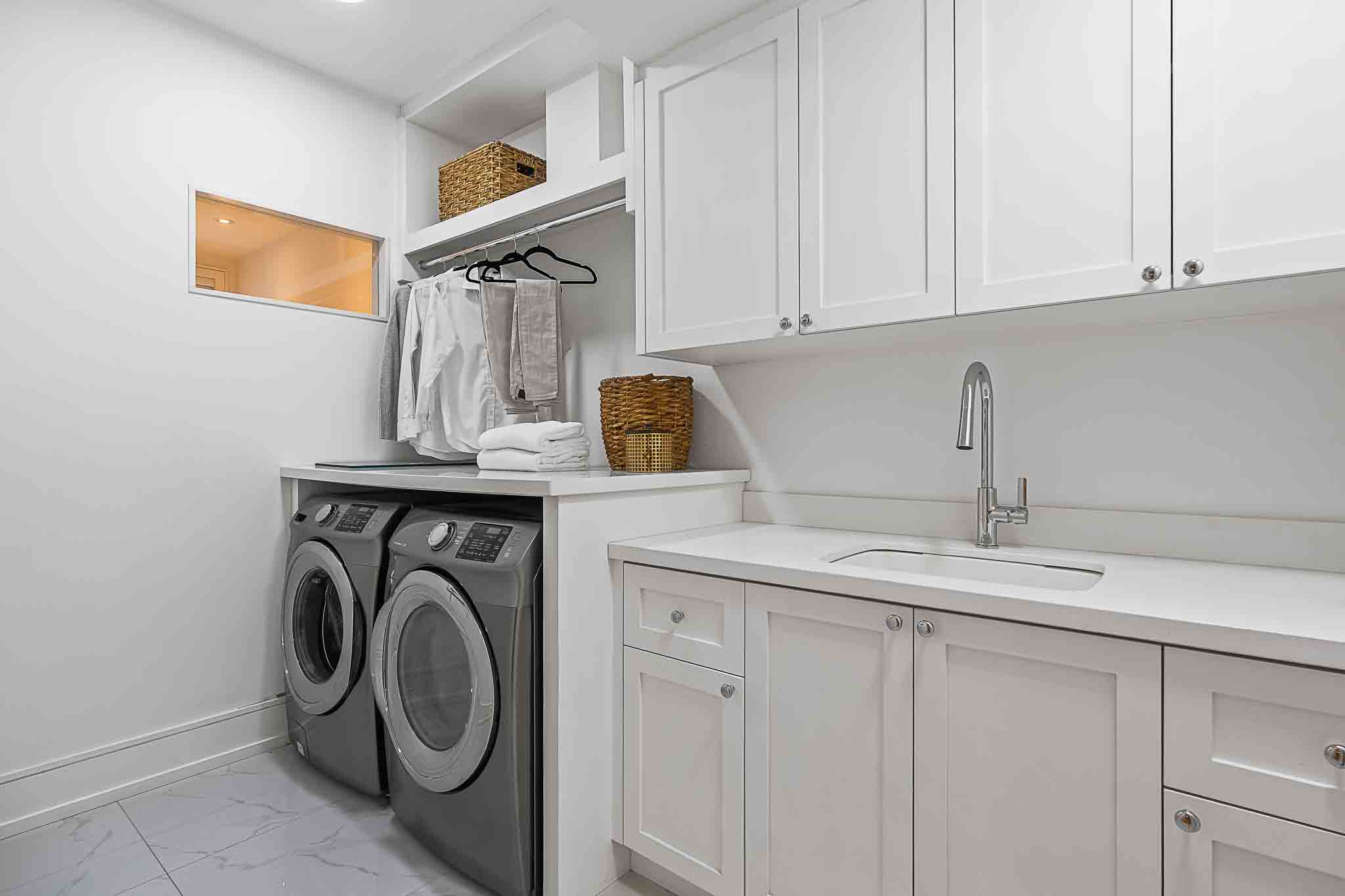 The kitchen holds two walls of customized solid wooden storage, stainless steel appliances and is anchored by a huge centre island with breakfast bar seating for the whole family. A concealed pantry is tucked away with room for a household of groceries. Storage is an ongoing theme in this house, as it was maximized during the design phase of its conception.