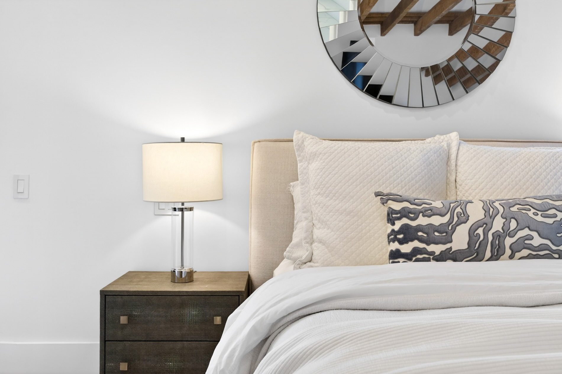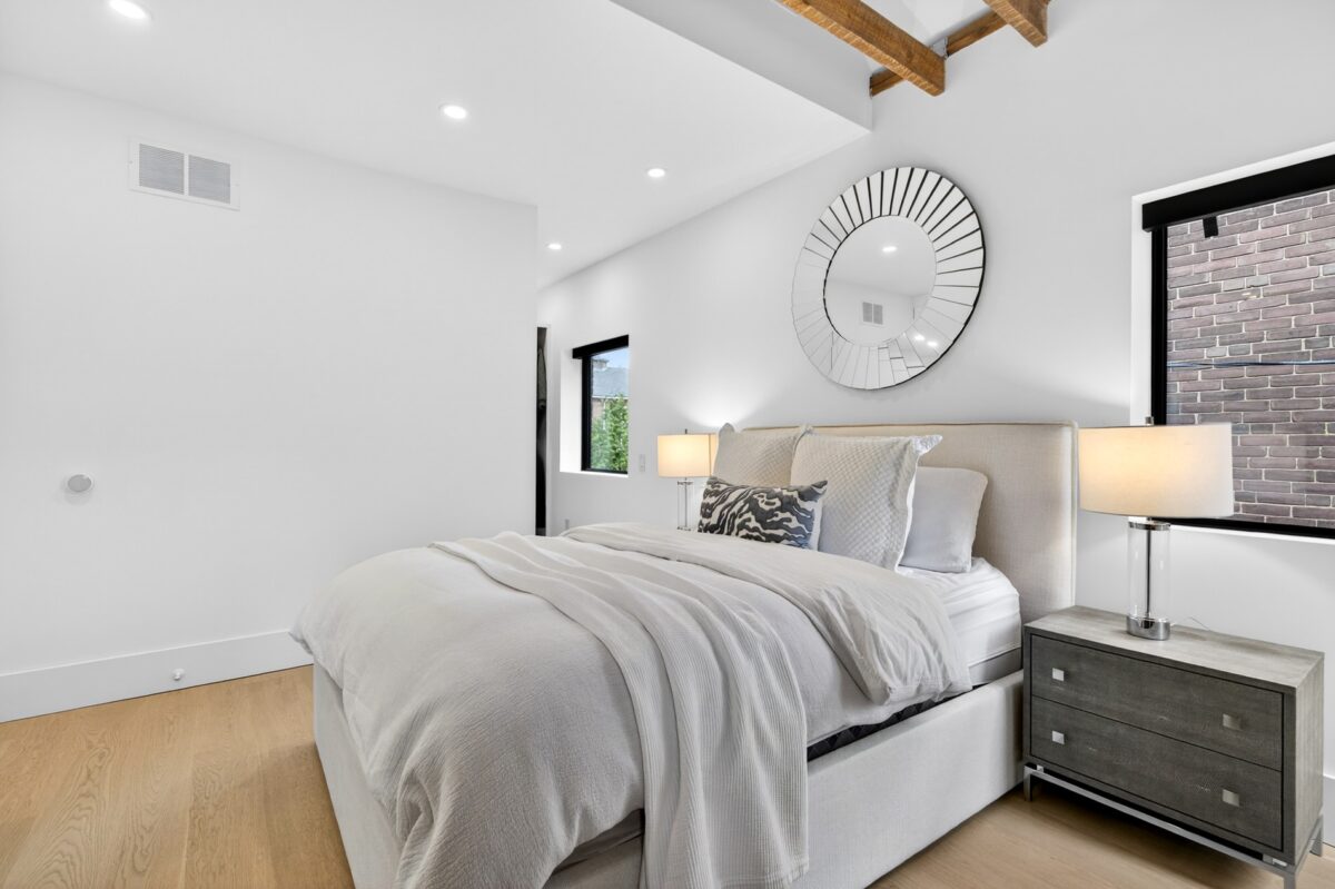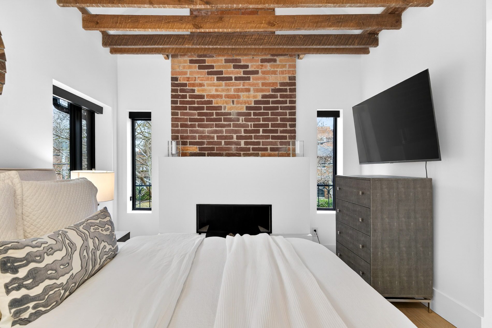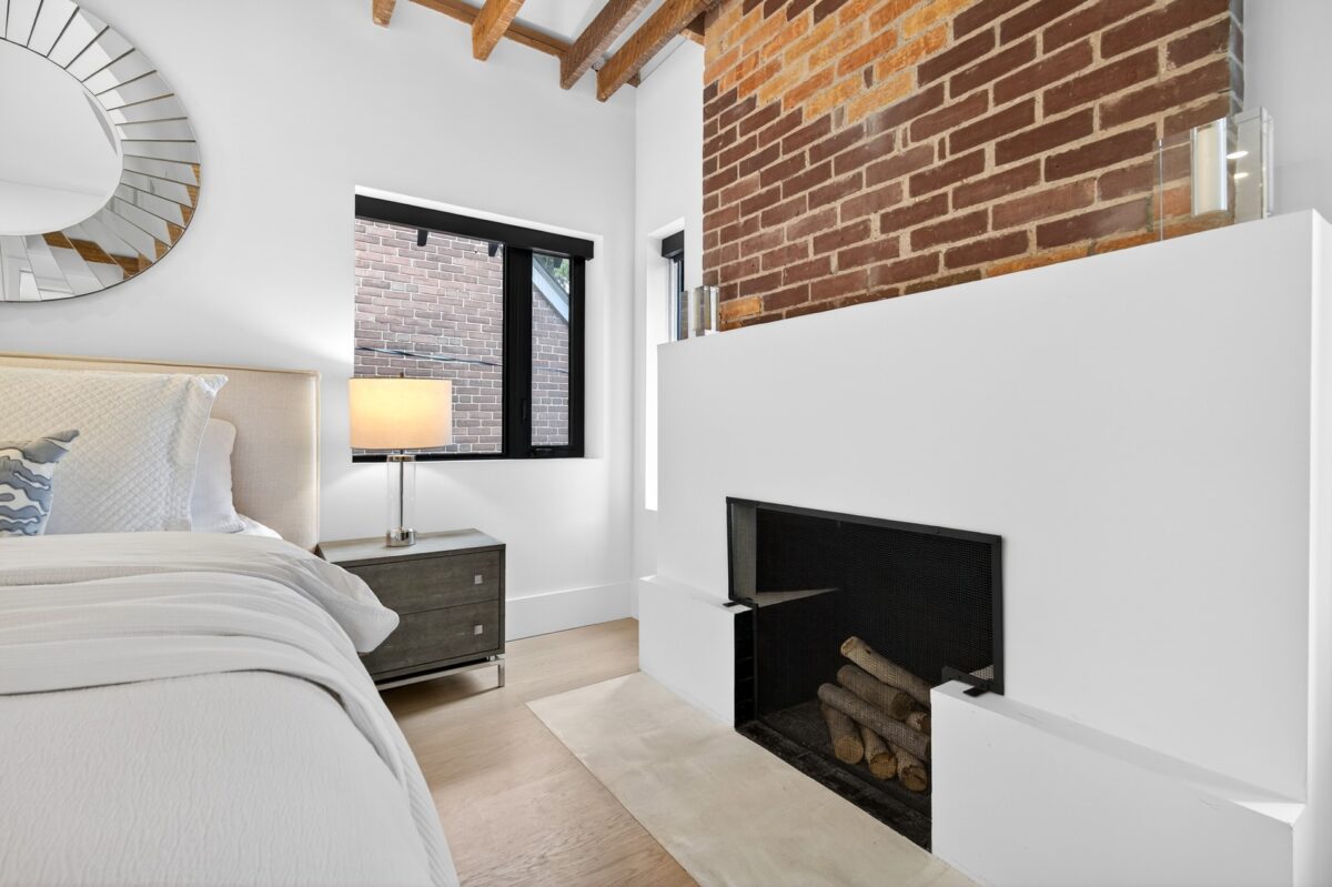 On the second floor, the primary bedroom dazzles with vaulted, beamed ceilings, a wood-burning fireplace, a huge walk-in dressing room with custom storage, and a perfectly appointed four-piece ensuite with a walk-in shower and double vanity. This room has windows on two sides of the home, again inviting the outdoor light in.