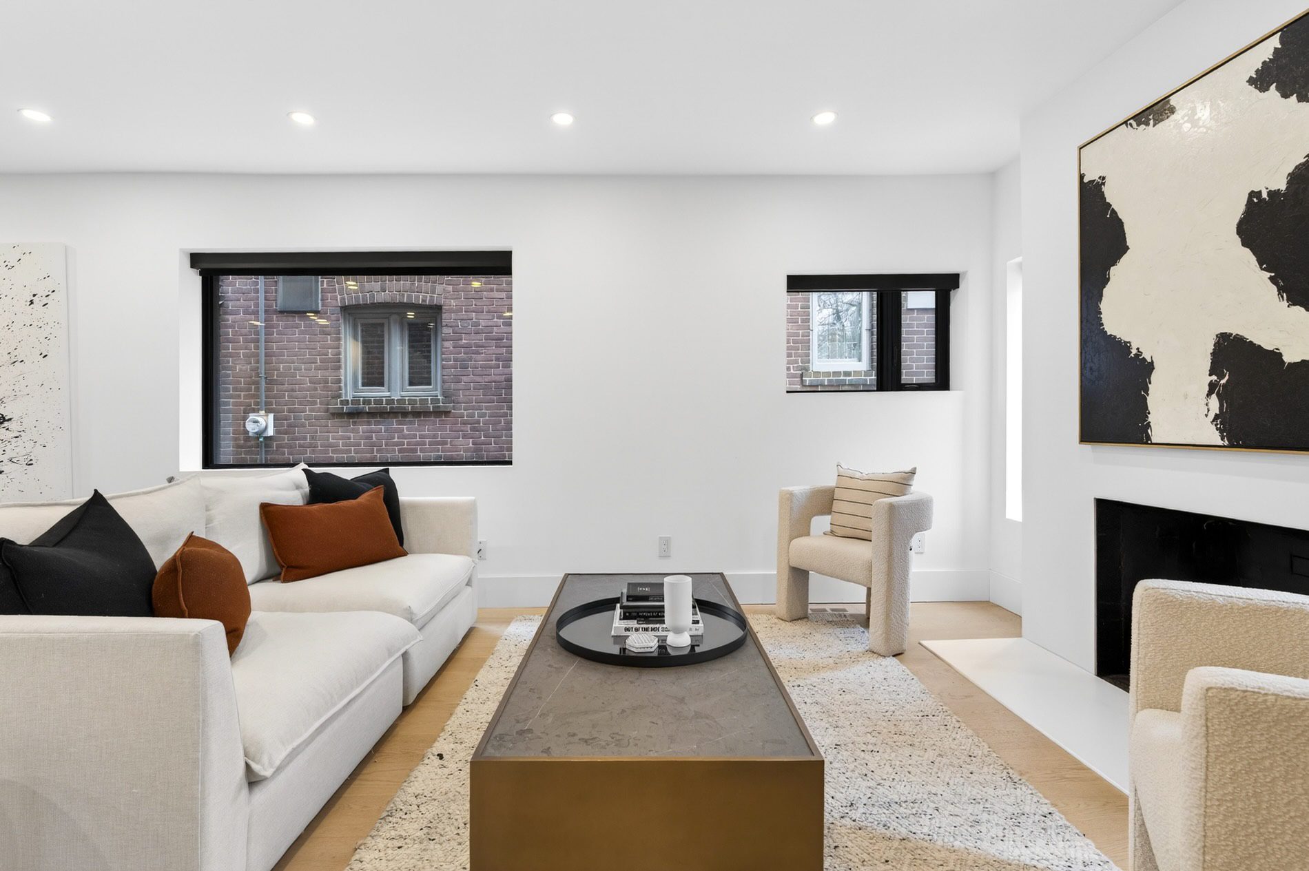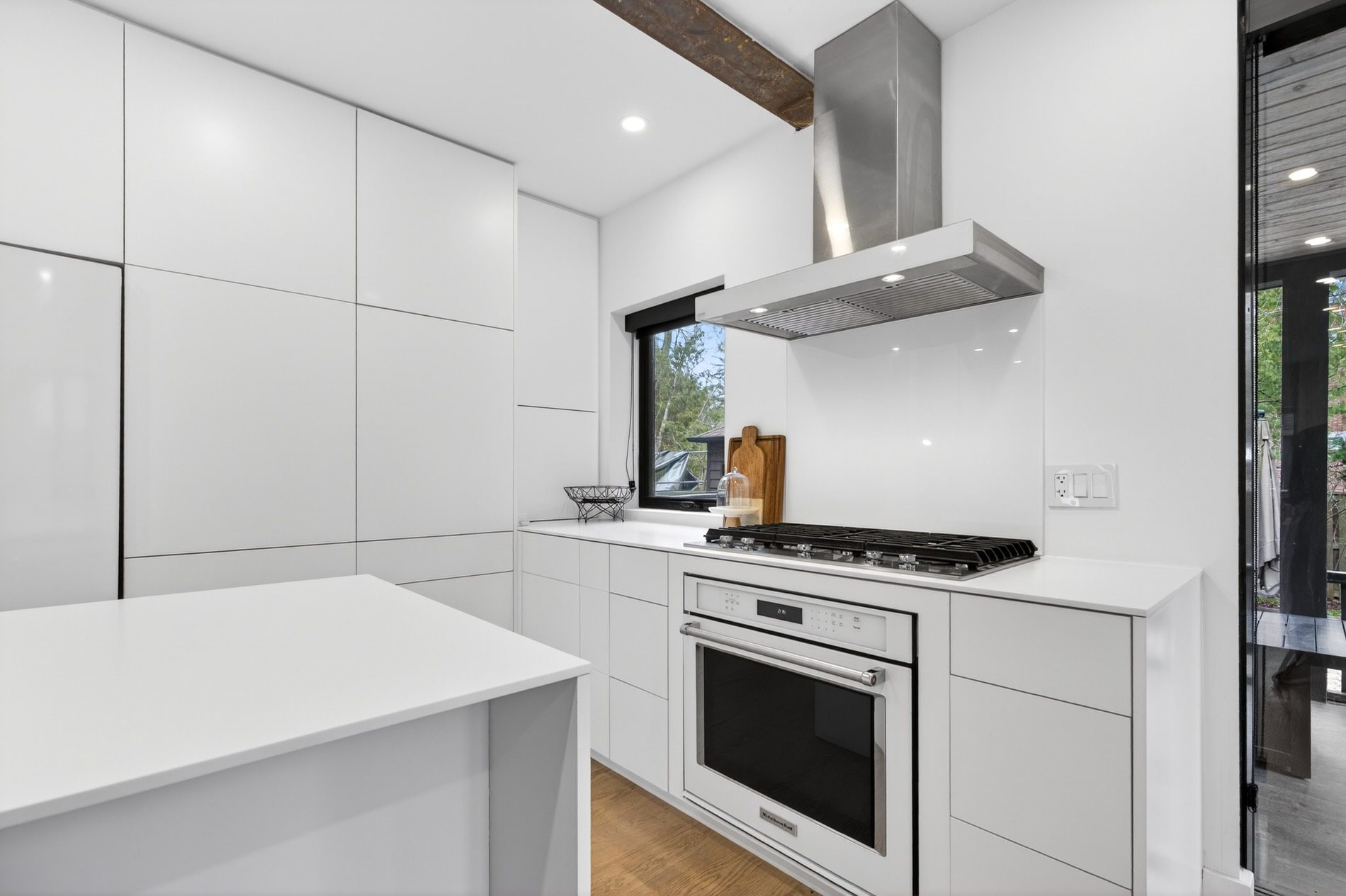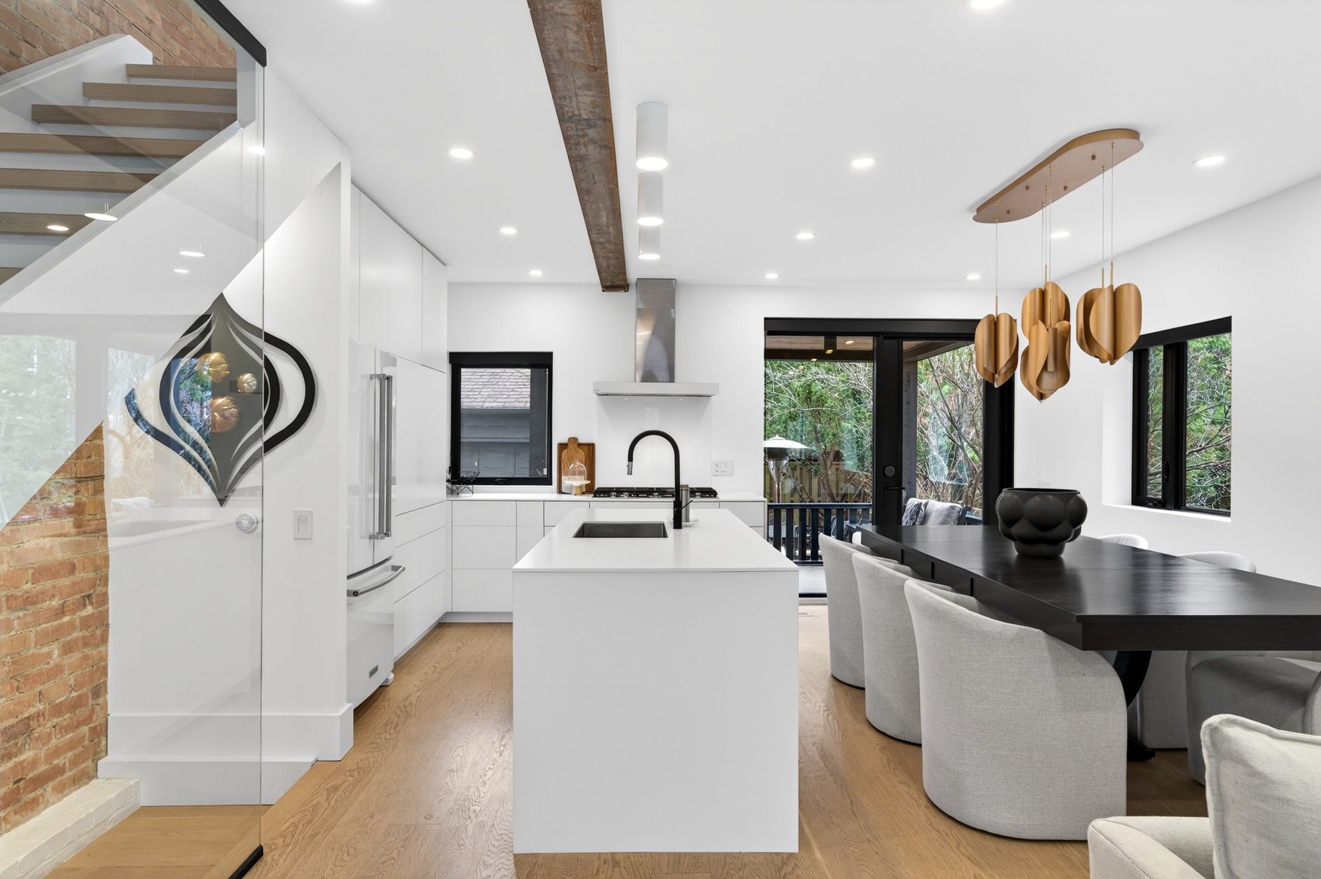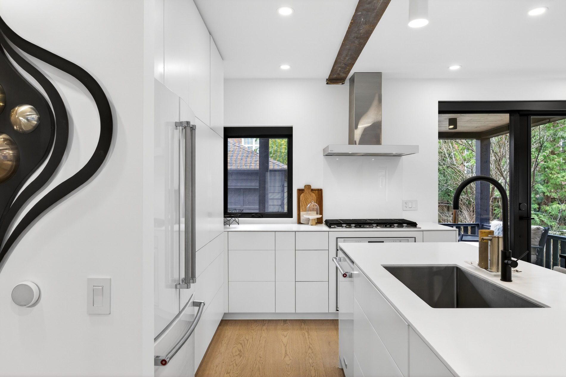Individually defined garden beds and custom floating concrete steps lead to the entry, where the foyer is defined by a tile inlay, and the front hall closet captures all your outdoor wear. The open-concept main floor then immediately draws your attention to the gorgeous interiors, with wide-plank white oak flooring, crisp white walls, and windows that line all four walls, filling the space with natural light.