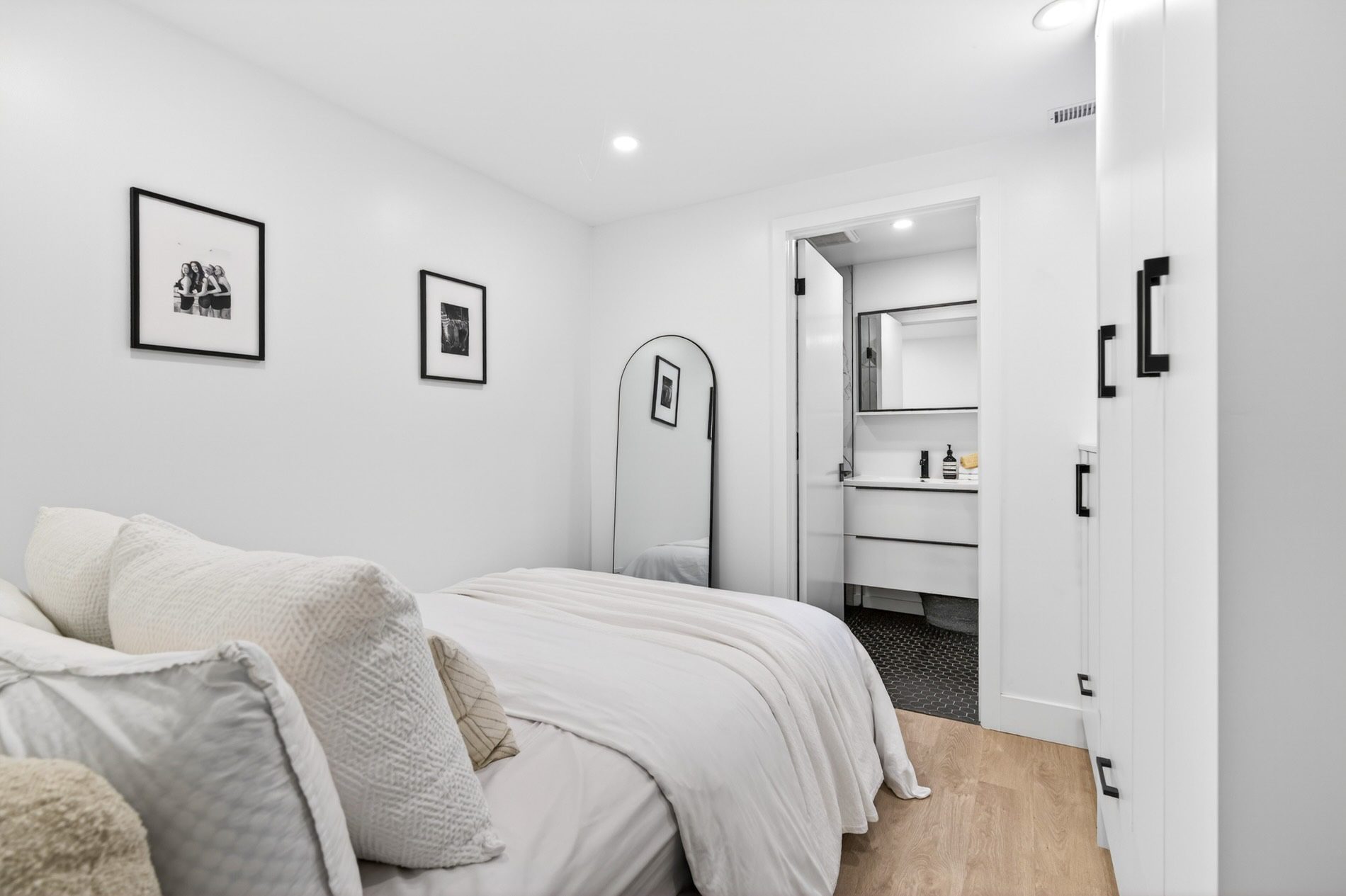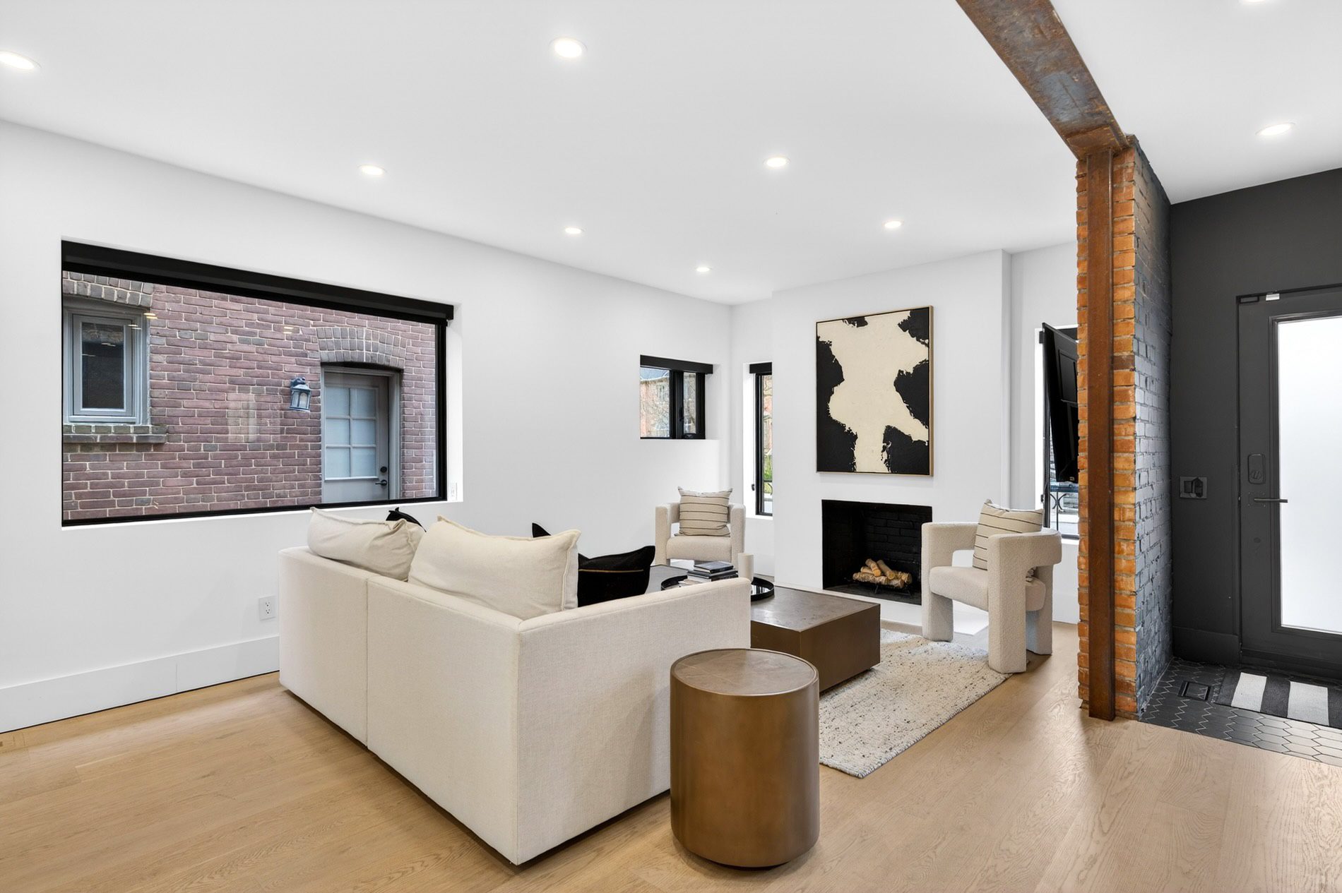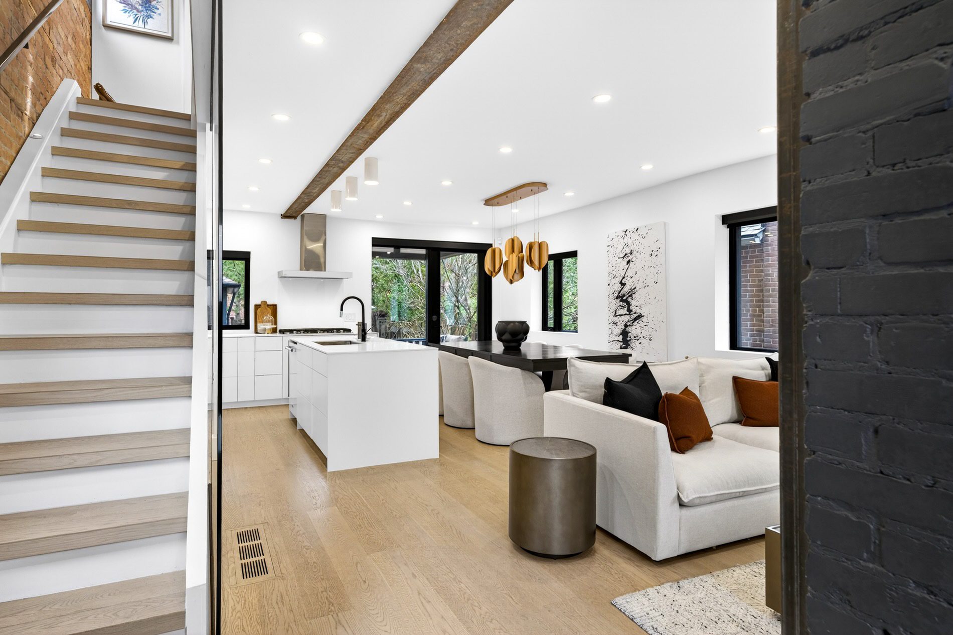 Individually defined garden beds and custom floating concrete steps lead to the entry, where the foyer is defined by a tile inlay, and the front hall closet captures all your outdoor wear. The open-concept main floor then immediately draws your attention to the gorgeous interiors, with wide-plank white oak flooring, crisp white walls, and windows that line all four walls, filling the space with natural light.