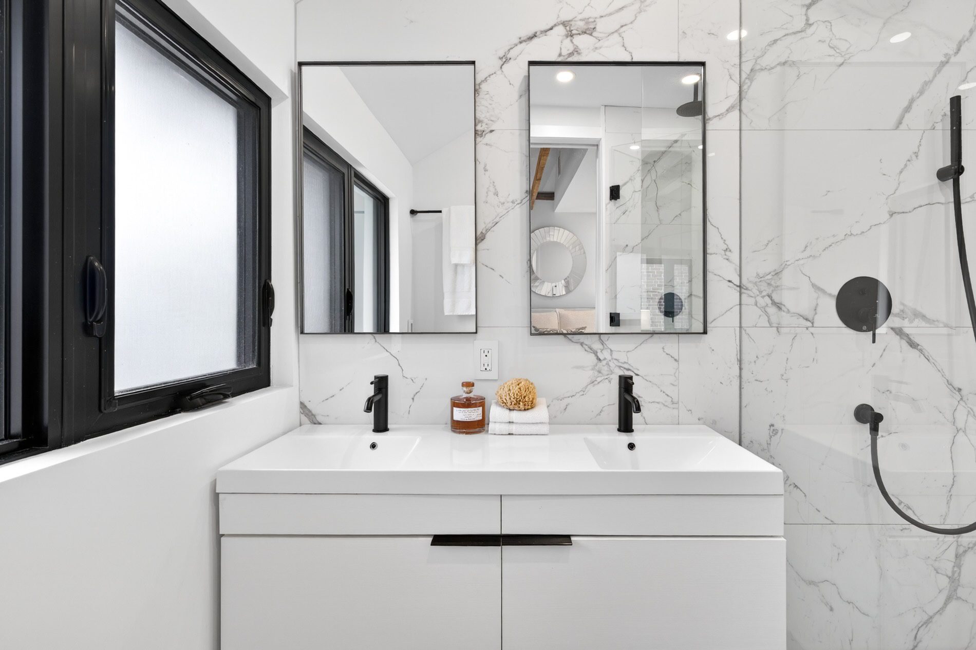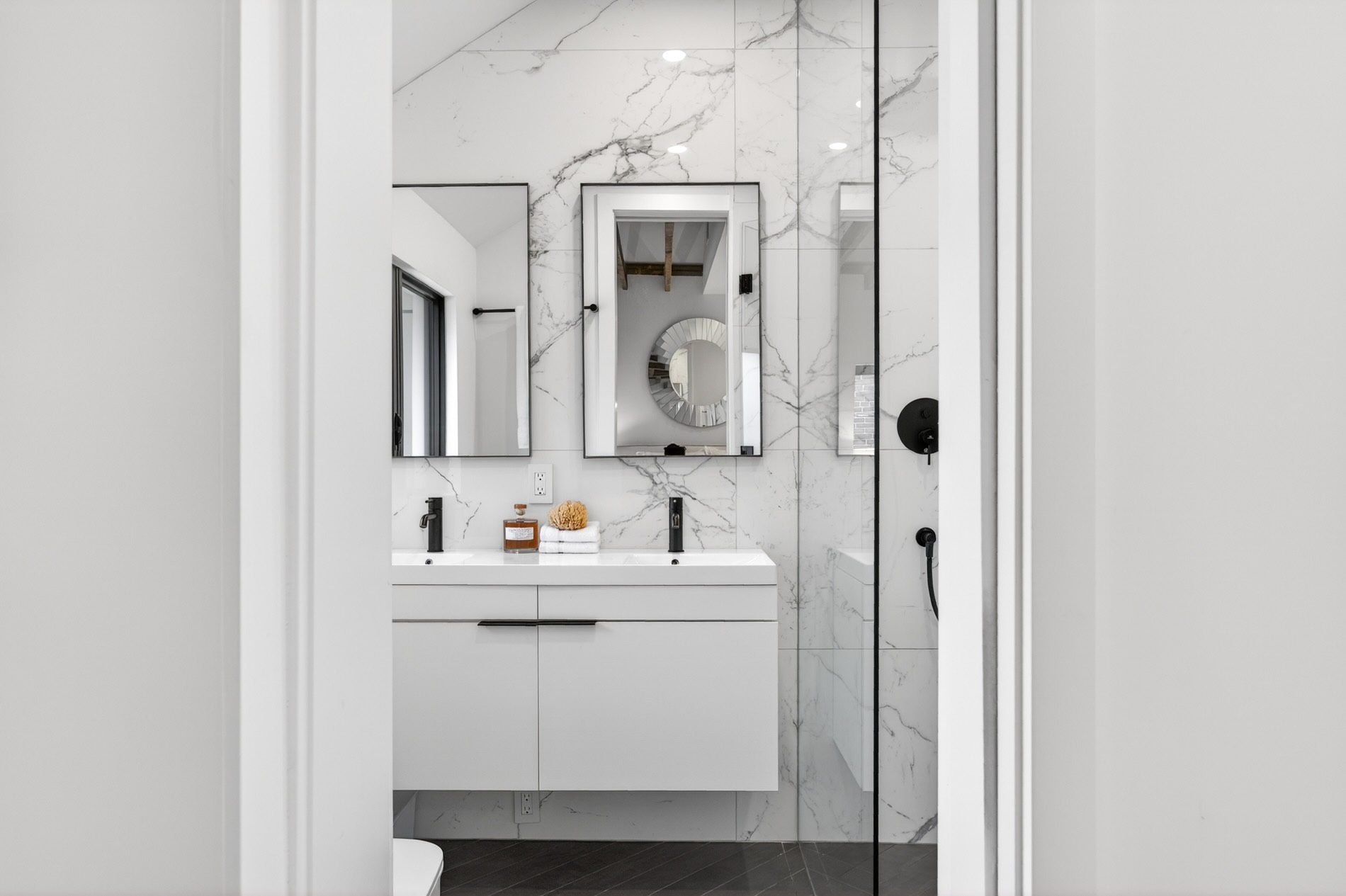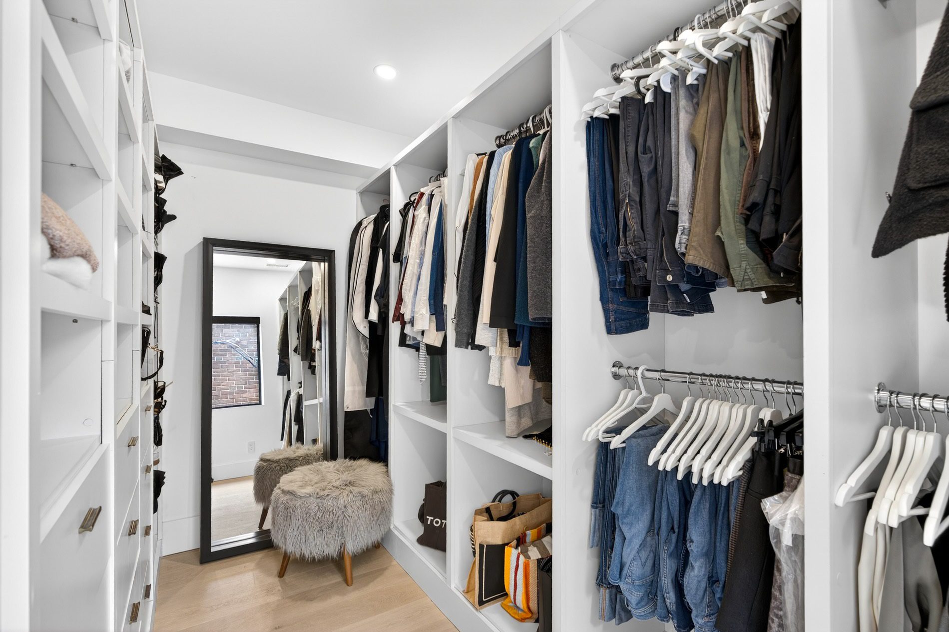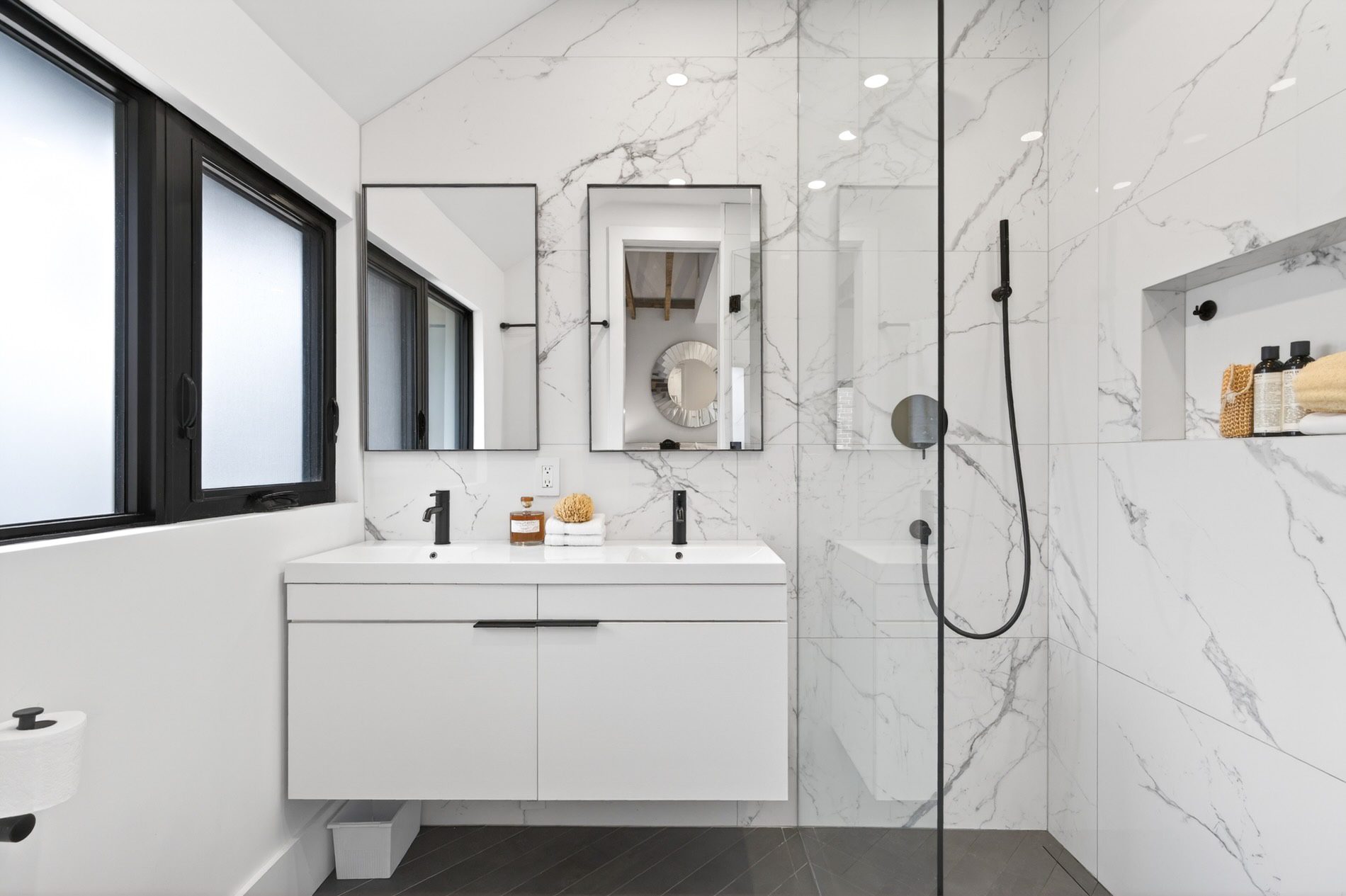 Individually defined garden beds and custom floating concrete steps lead to the entry, where the foyer is defined by a tile inlay, and the front hall closet captures all your outdoor wear. The open-concept main floor then immediately draws your attention to the gorgeous interiors, with wide-plank white oak flooring, crisp white walls, and windows that line all four walls, filling the space with natural light.