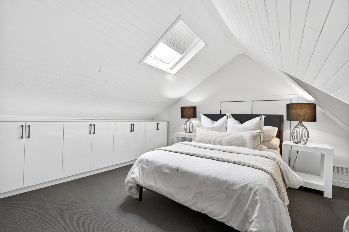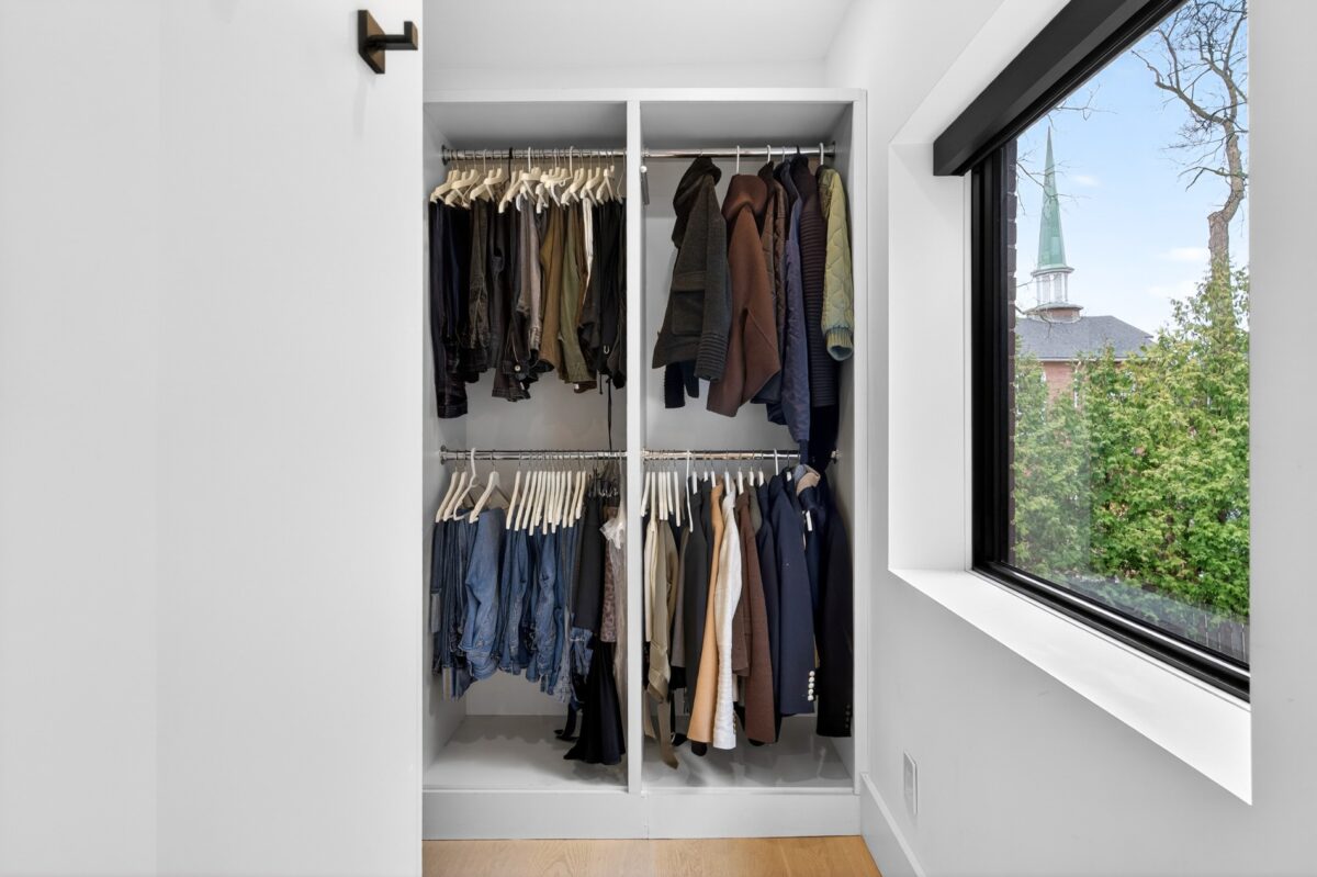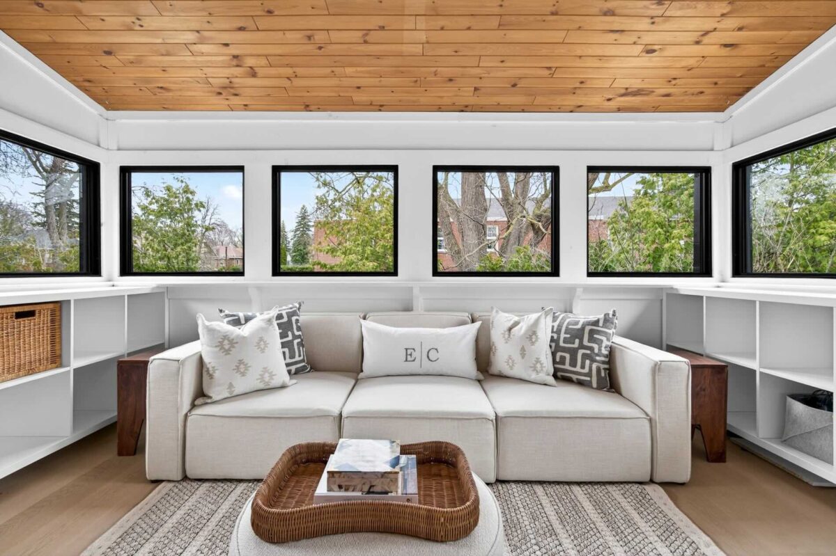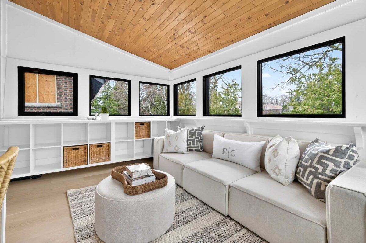 The second bedroom has a closet and quickly connects to the renovated four-piece bathroom. It benefits from the addition of a tandem room that is lined on three sides with windows. It has historically been a welcome sanctuary for teenagers for both homework and gaming.
