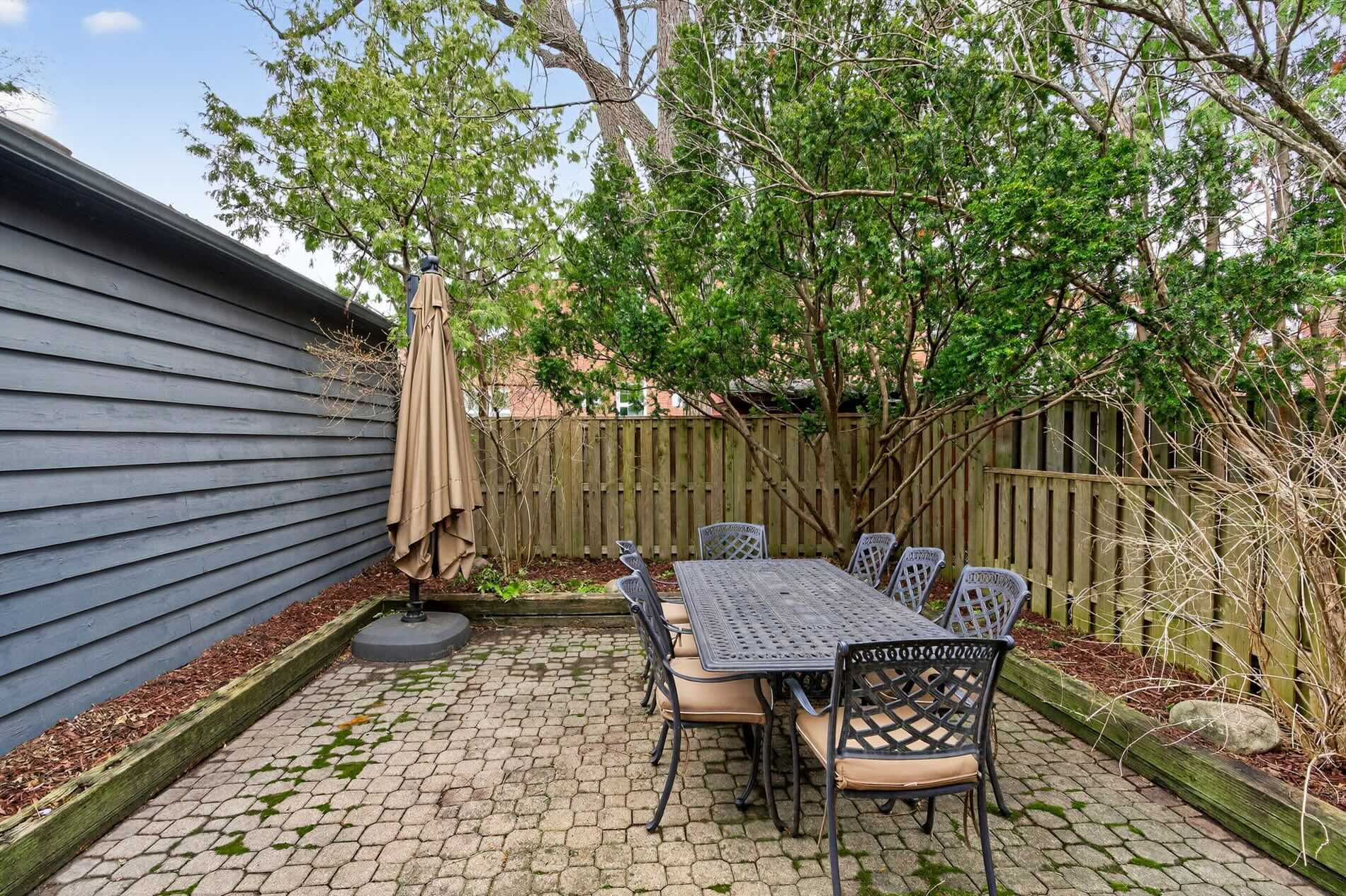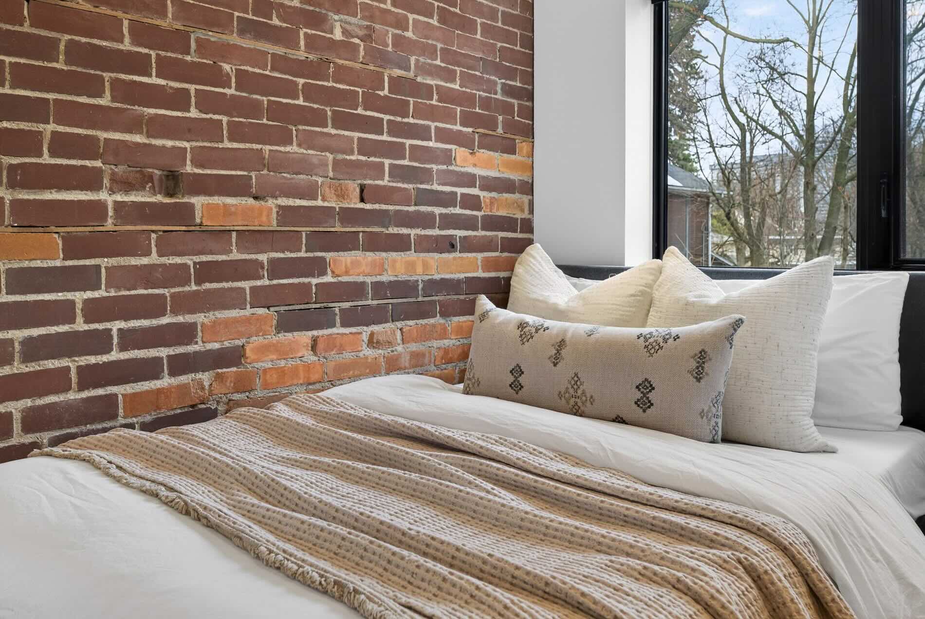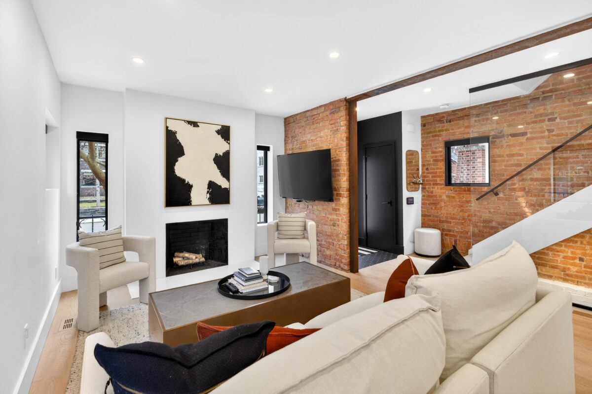 The living room is centered on a wood-burning fireplace and overlooks the quiet streetscape of St. Hilda’s. Adjacent to this, the dining room comfortably holds seating for eight guests, and enjoys views of the featured brick wall on the north side of the home. A walk-out to the covered porch expands the functional living space of this home as it is an amazing outdoor living room to be enjoyed no matter what the weather. The gardens beyond it are lined with perennial plantings and mature cedars, giving this entertaining space total privacy.