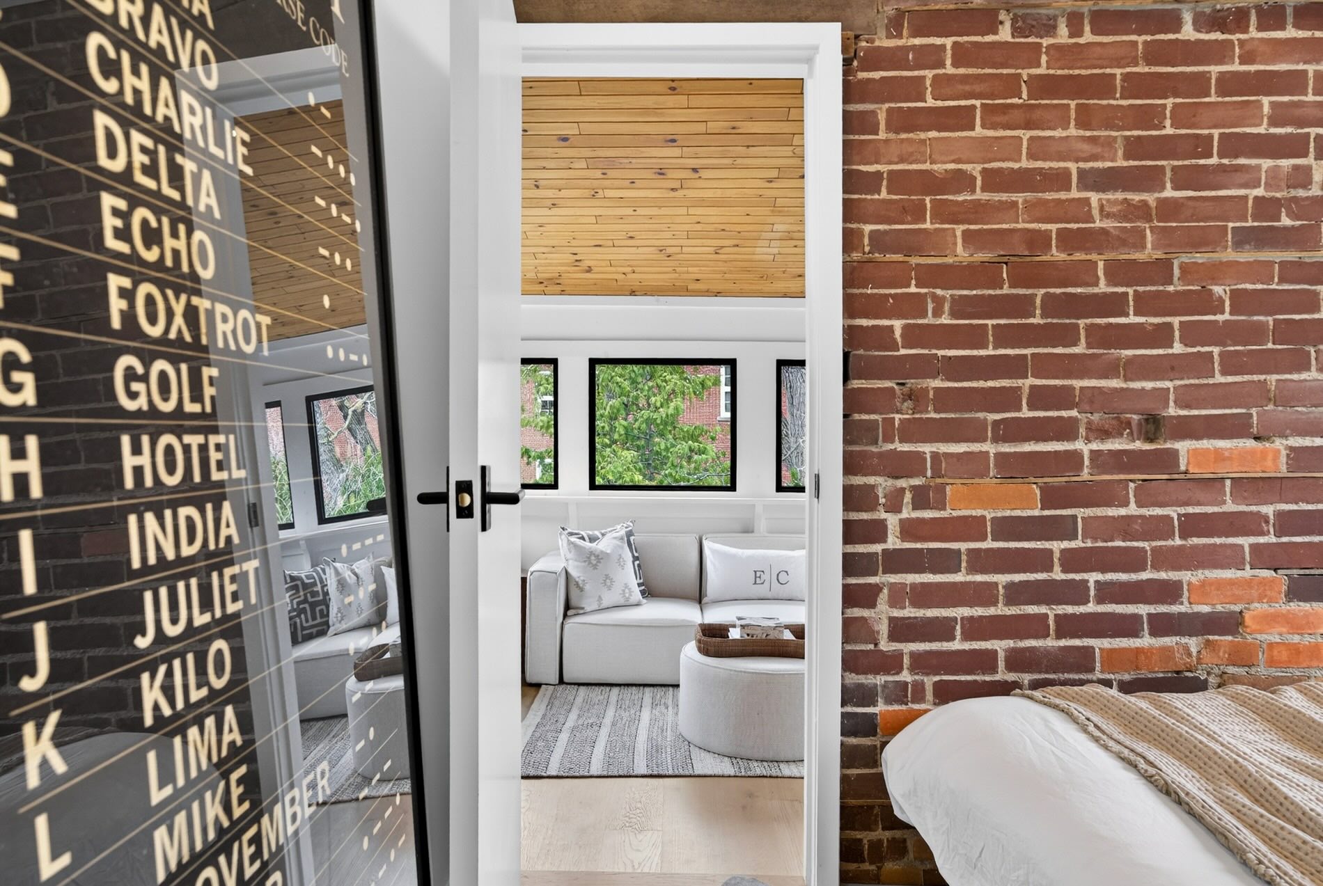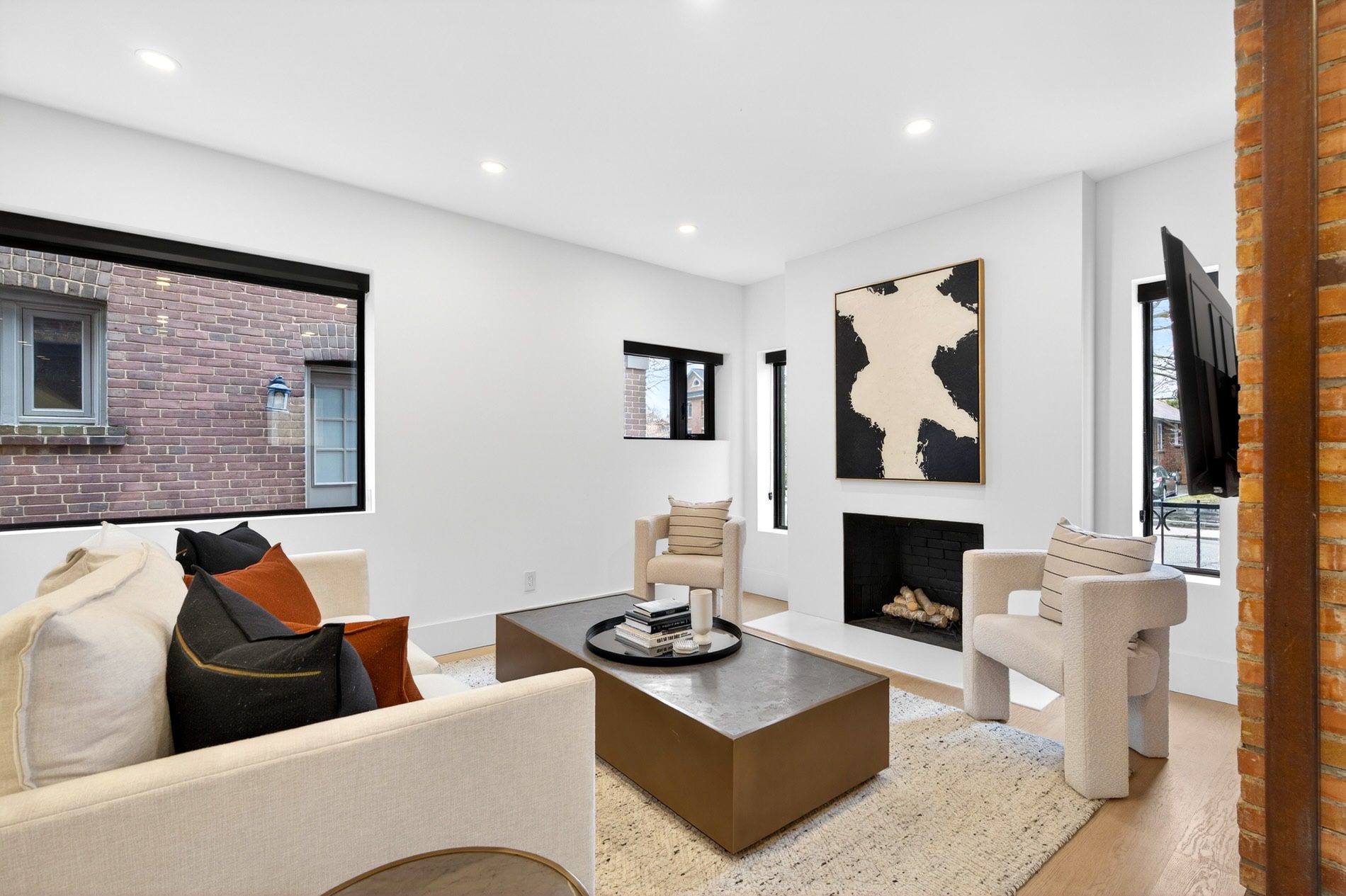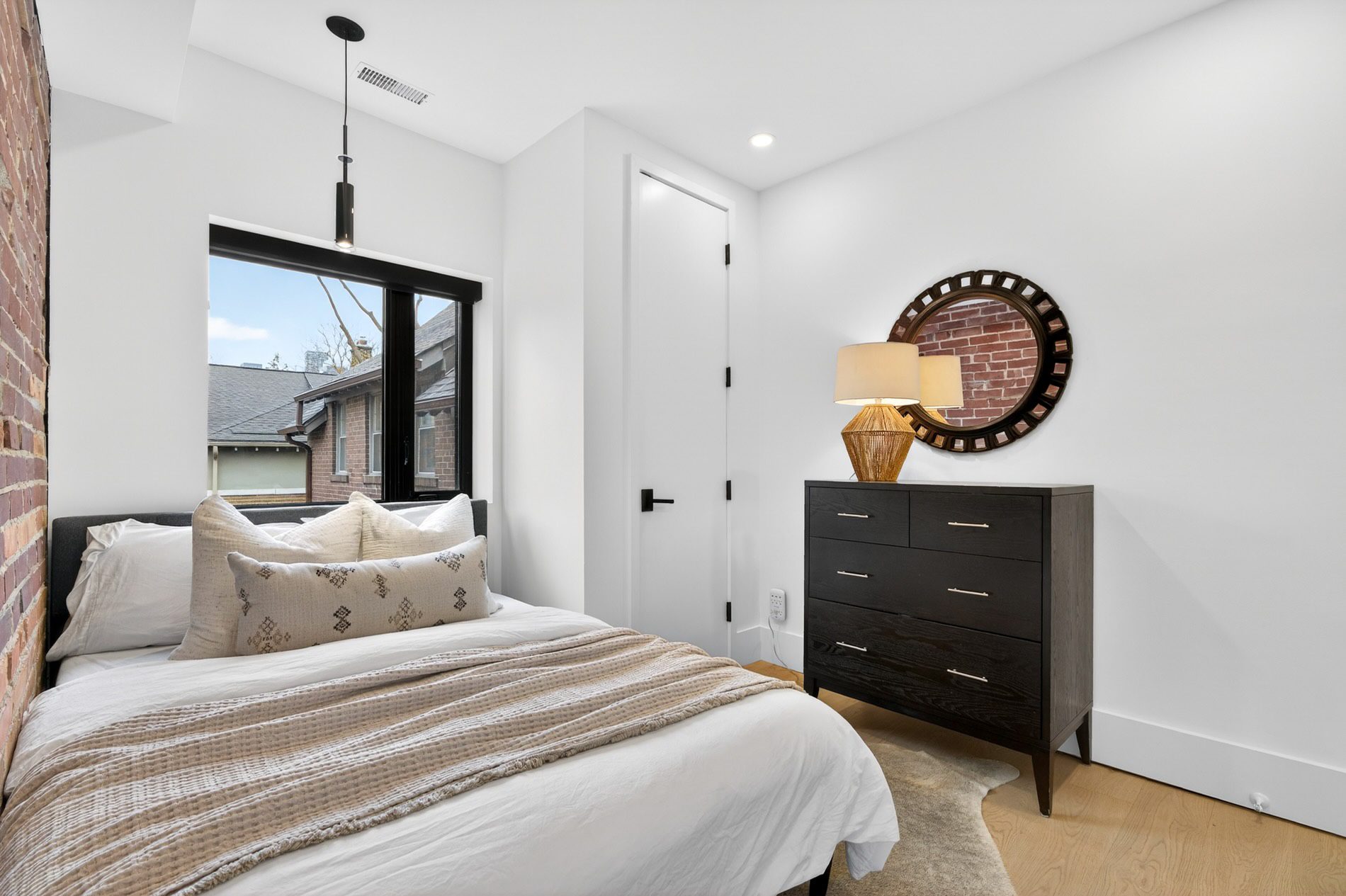 The living room is centered on a wood-burning fireplace and overlooks the quiet streetscape of St. Hilda’s. Adjacent to this, the dining room comfortably holds seating for eight guests, and enjoys views of the featured brick wall on the north side of the home. A walk-out to the covered porch expands the functional living space of this home as it is an amazing outdoor living room to be enjoyed no matter what the weather. The gardens beyond it are lined with perennial plantings and mature cedars, giving this entertaining space total privacy.