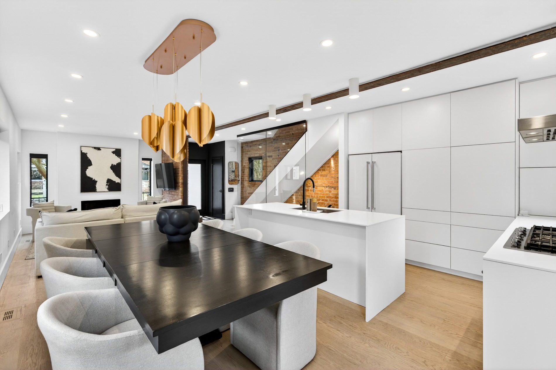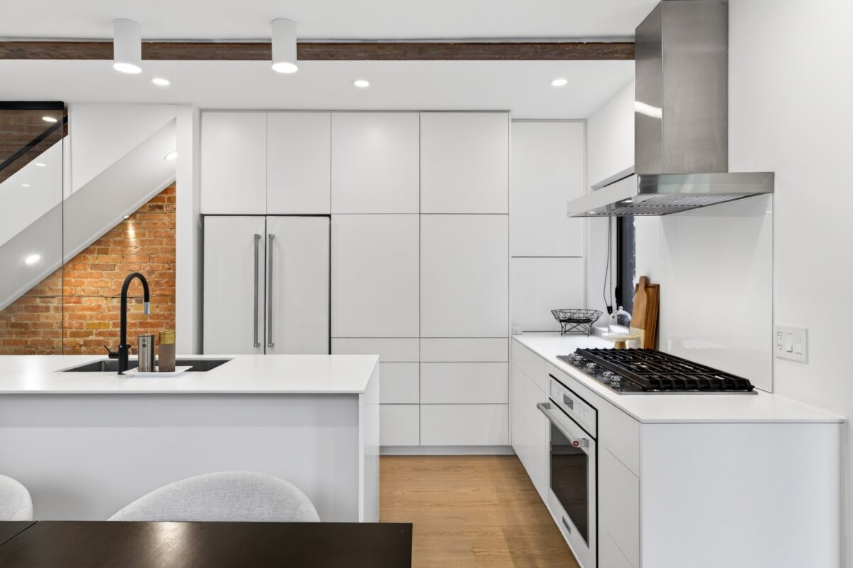 The completely custom kitchen features a large waterfall Quartz island with breakfast bar seating and multiple workspaces for meal preparation. Appliances have been colour coordinated to the aesthetic of this space, and hidden storage is revealed with the push of the cabinets lining the perimeter.