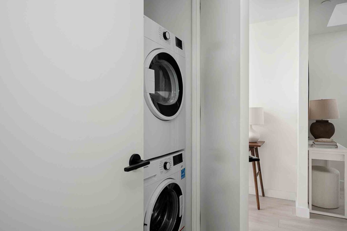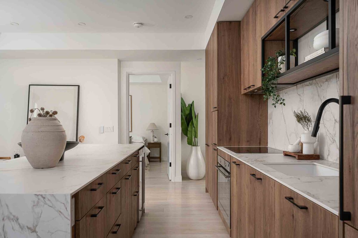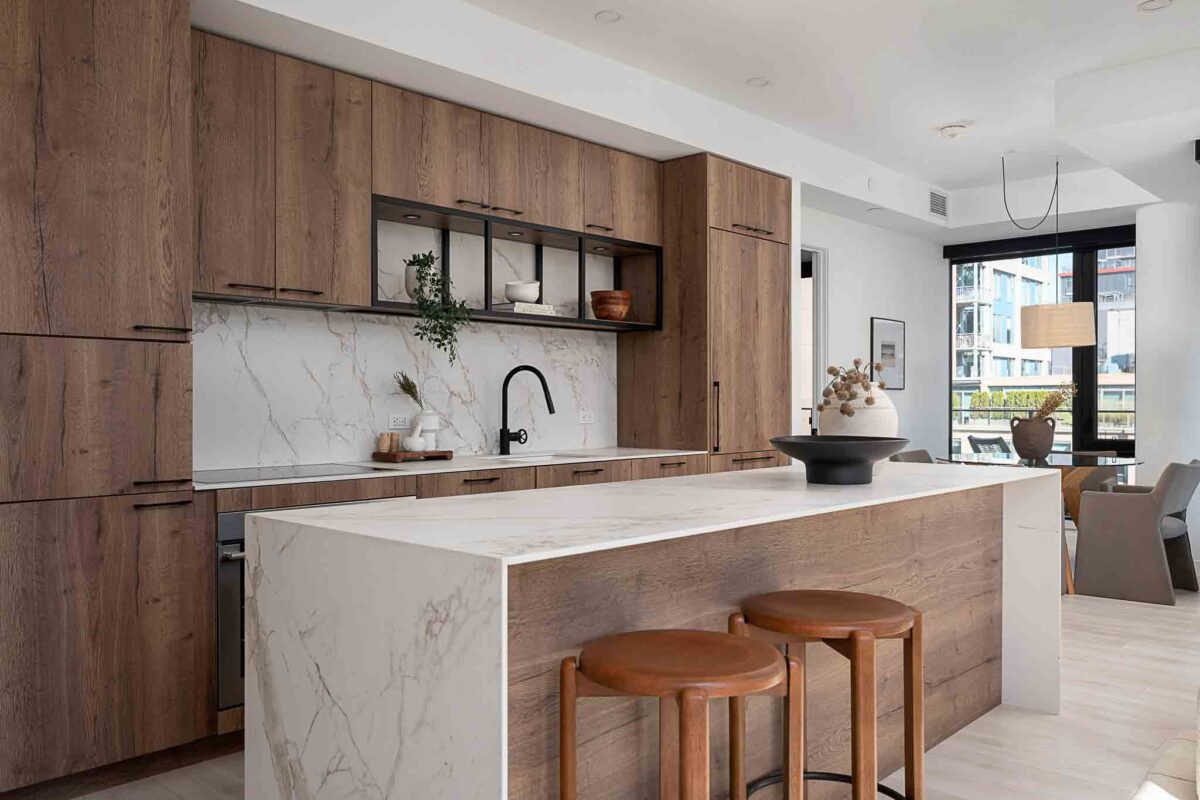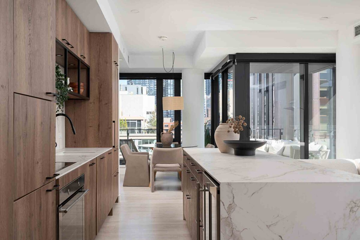 At the heart of the home lies a custom nine-foot island with a waterfall edge, integrated wine fridge, serving as a sculptural centrepiece that anchors the living area. The gourmet kitchen pairs premium Dekton countertops and a full-height backsplash with 30-inch integrated appliances, including oven and cooktop, with a panel-integrated fridge and dishwasher. Full-height custom millwork cabinetry and a bespoke pantry with built-in organizers deliver the storage and function expected of a world-class urban residence.
