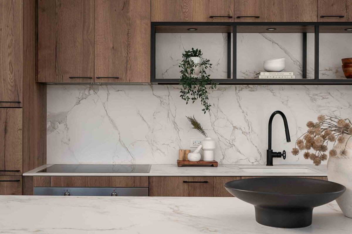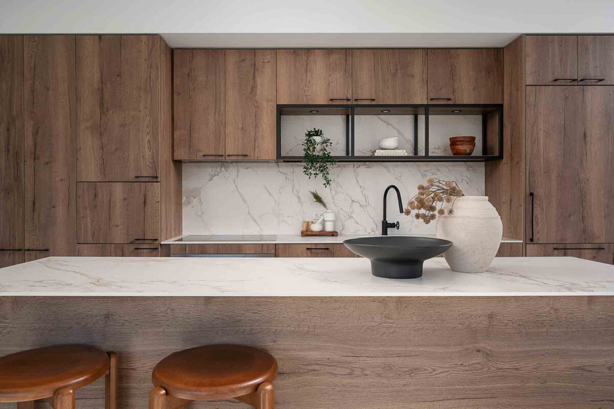 - Custom 9-foot waterfall island with integrated wine fridge.