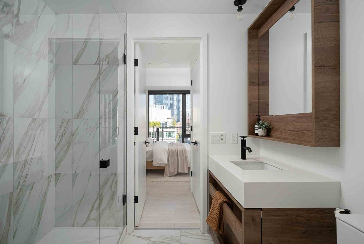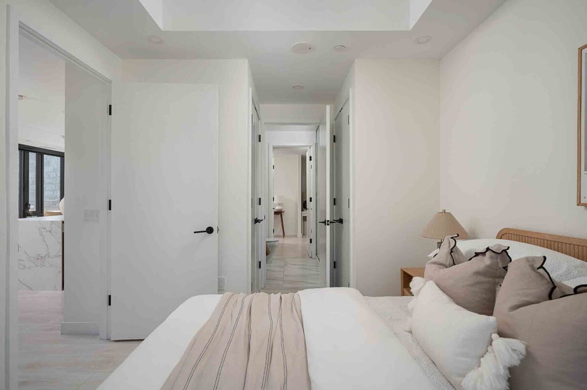 The secondary bedroom, bathed in morning light through its east-facing windows, offers a serene retreat with his-and-hers closets and access to a three-piece semi-ensuite appointed in refined modern finishes.