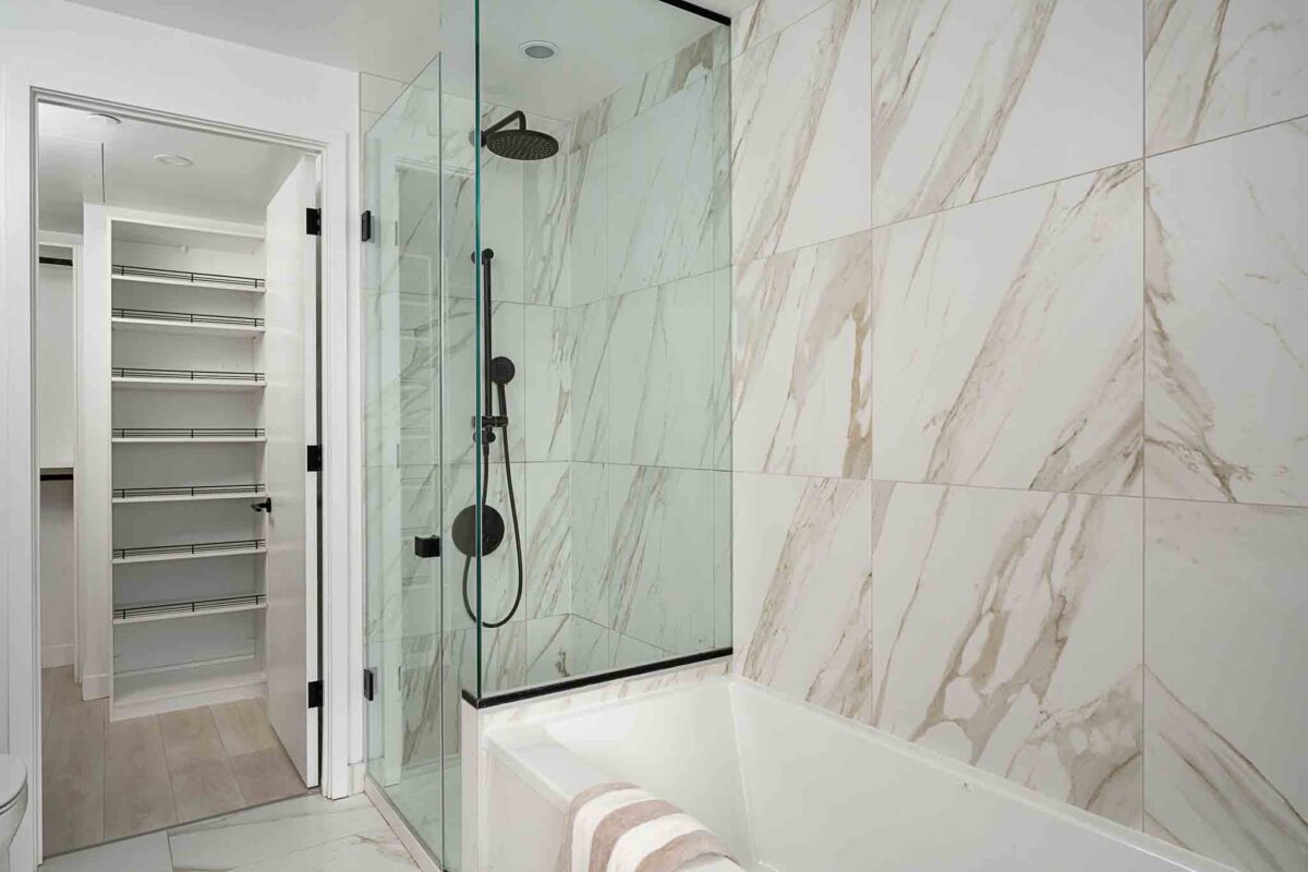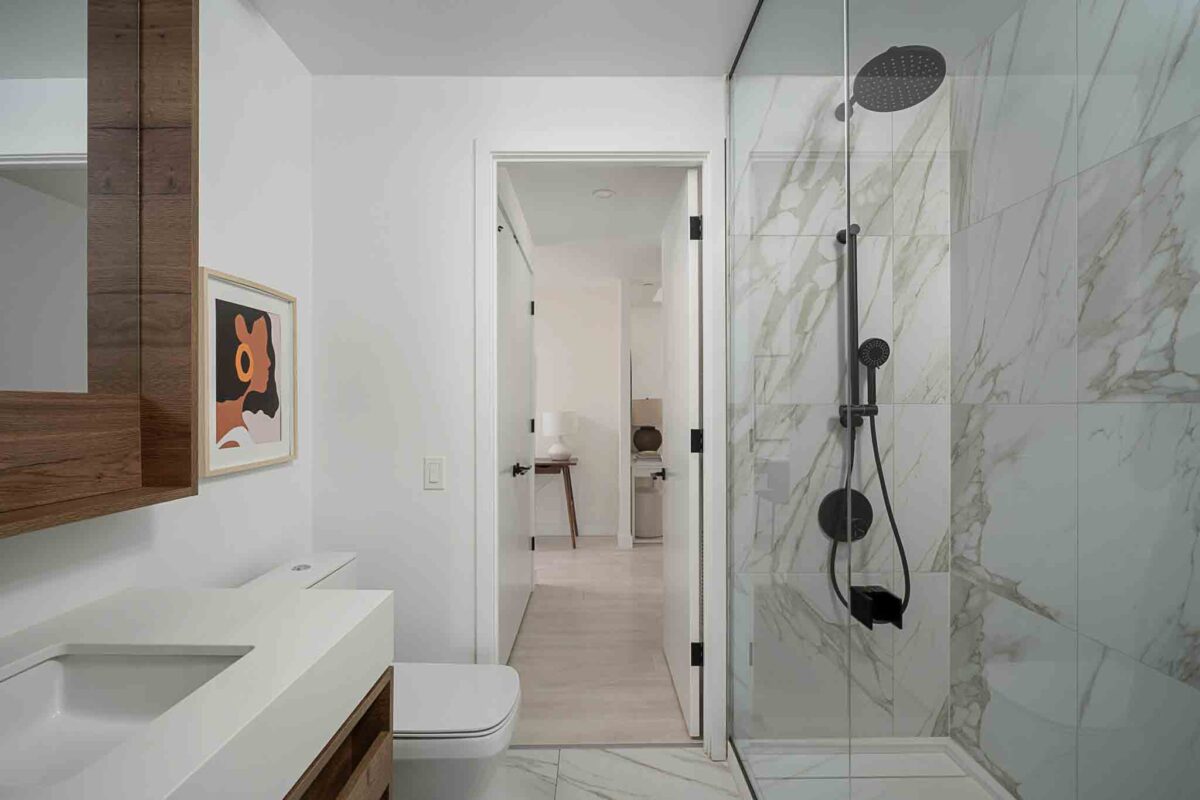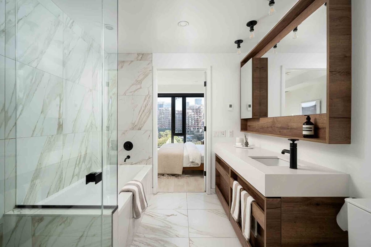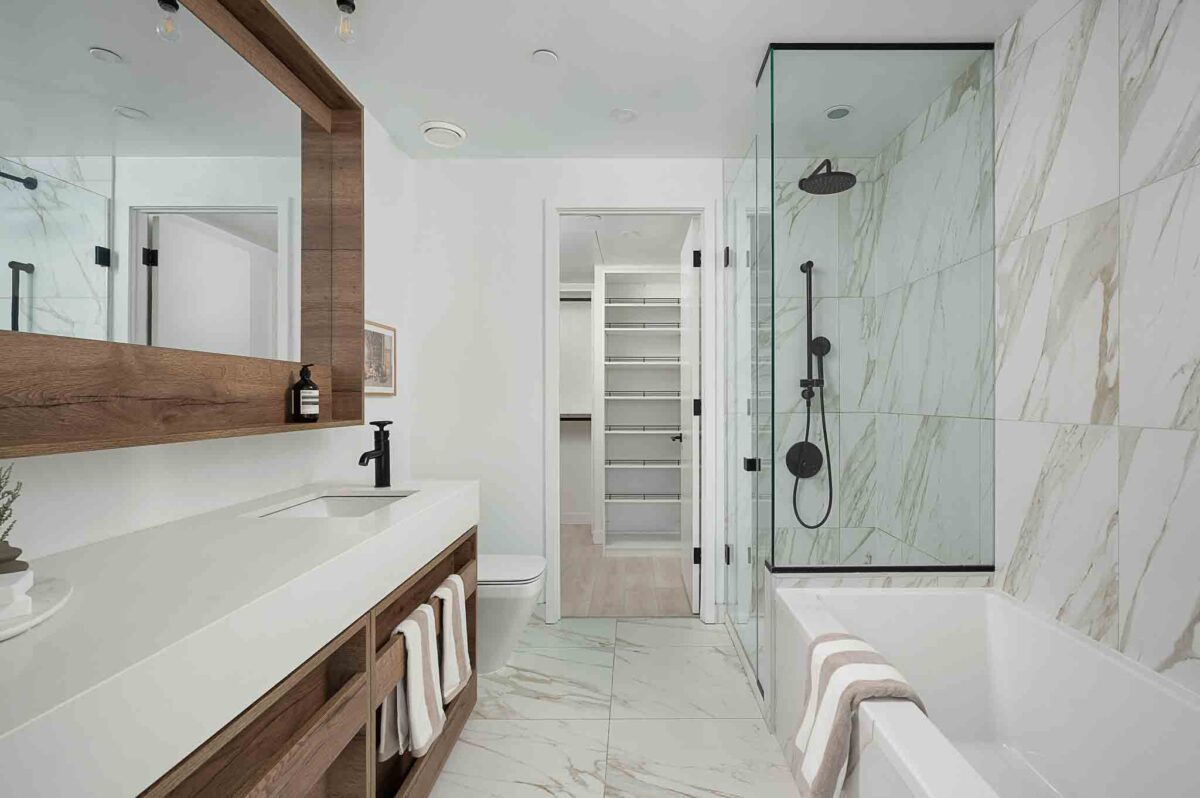 The primary suite extends along the south façade, overlooking the park through walls of glass. A king-sized bedroom flows into a spa-inspired ensuite with heated floors, dual under-counter stone vanity, walk-in glass shower, and bathtub, all finished with quiet precision. An expansive walk-in closet with custom full-height organizers and shoe storage completes the suite’s tailored character.