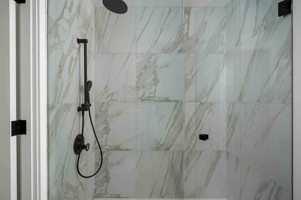 - Glass-enclosed walk-in shower with rain fixture and separate bathtub.