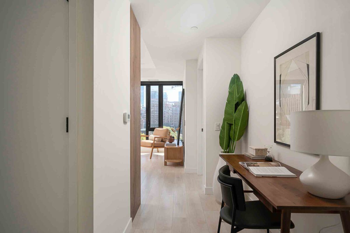Stepping inside, the home opens to a light-filled expanse of floor-to-ceiling glass framing lush treetop views to the south and east. The split two-bedroom layout enhances both privacy and proportion, balancing intimate retreats with open social space. Wide-plank flooring extends throughout, and motorized blinds in every room provide effortless control over light and privacy.