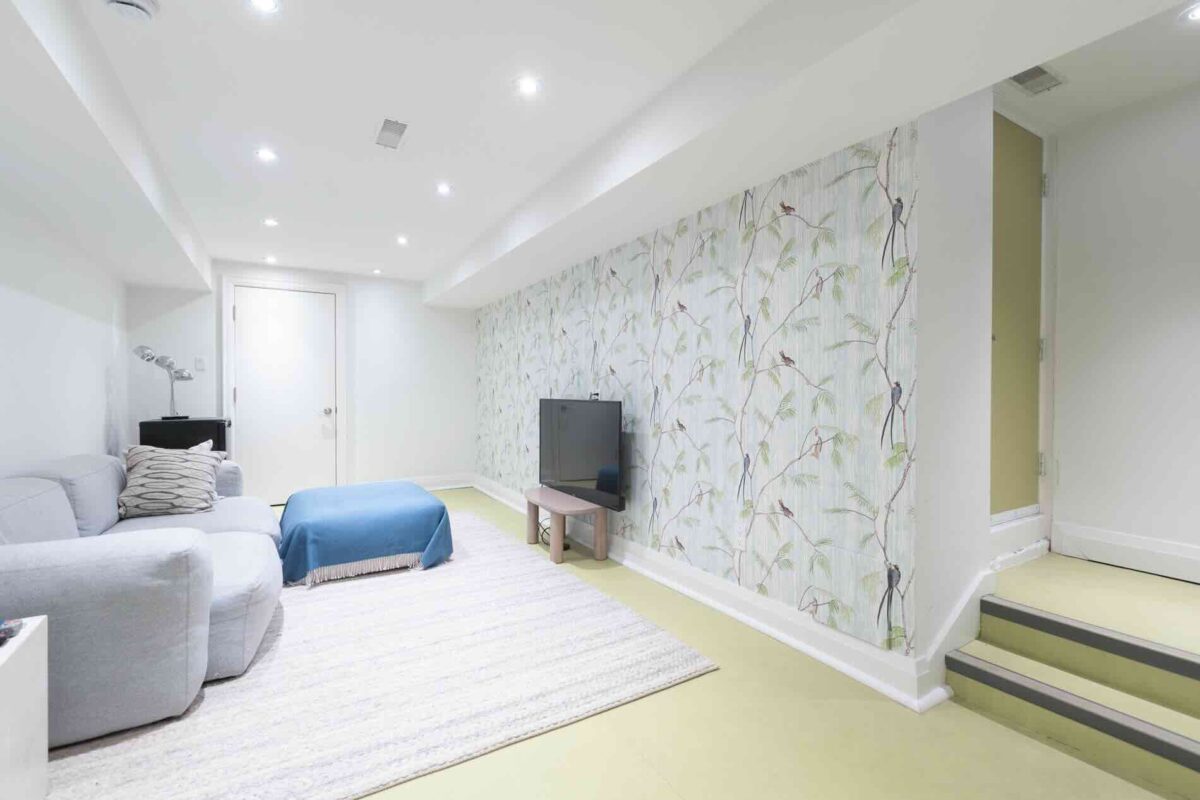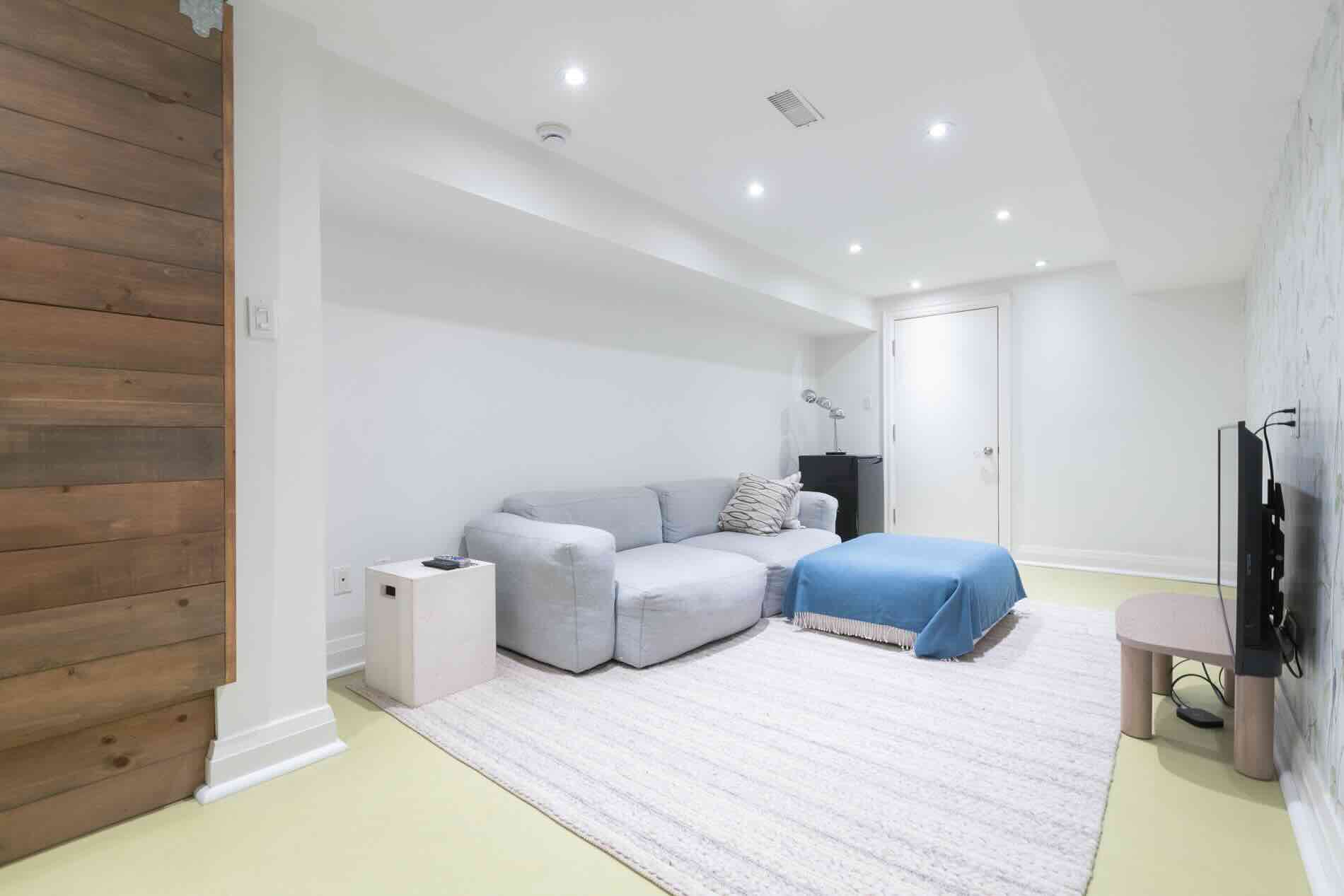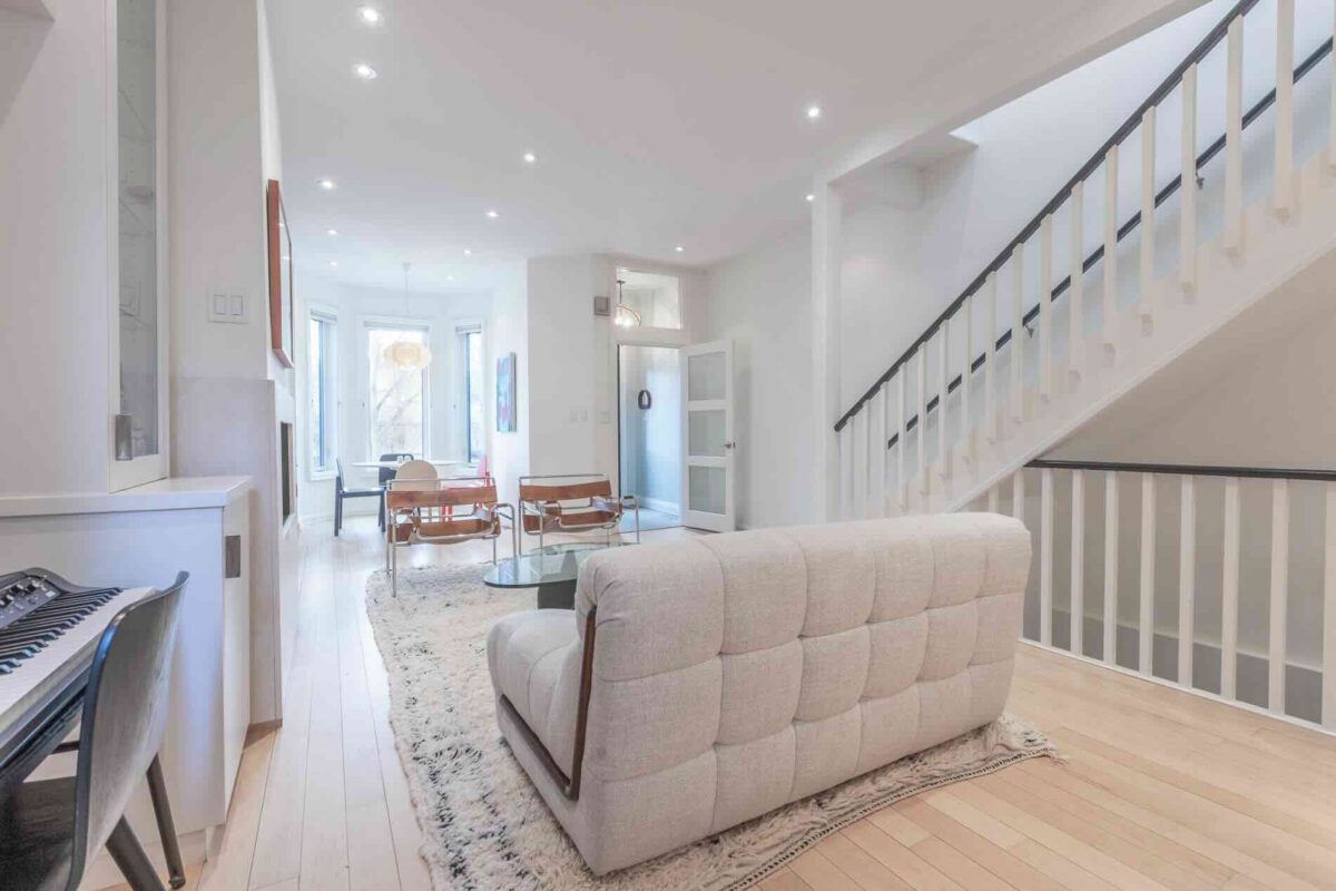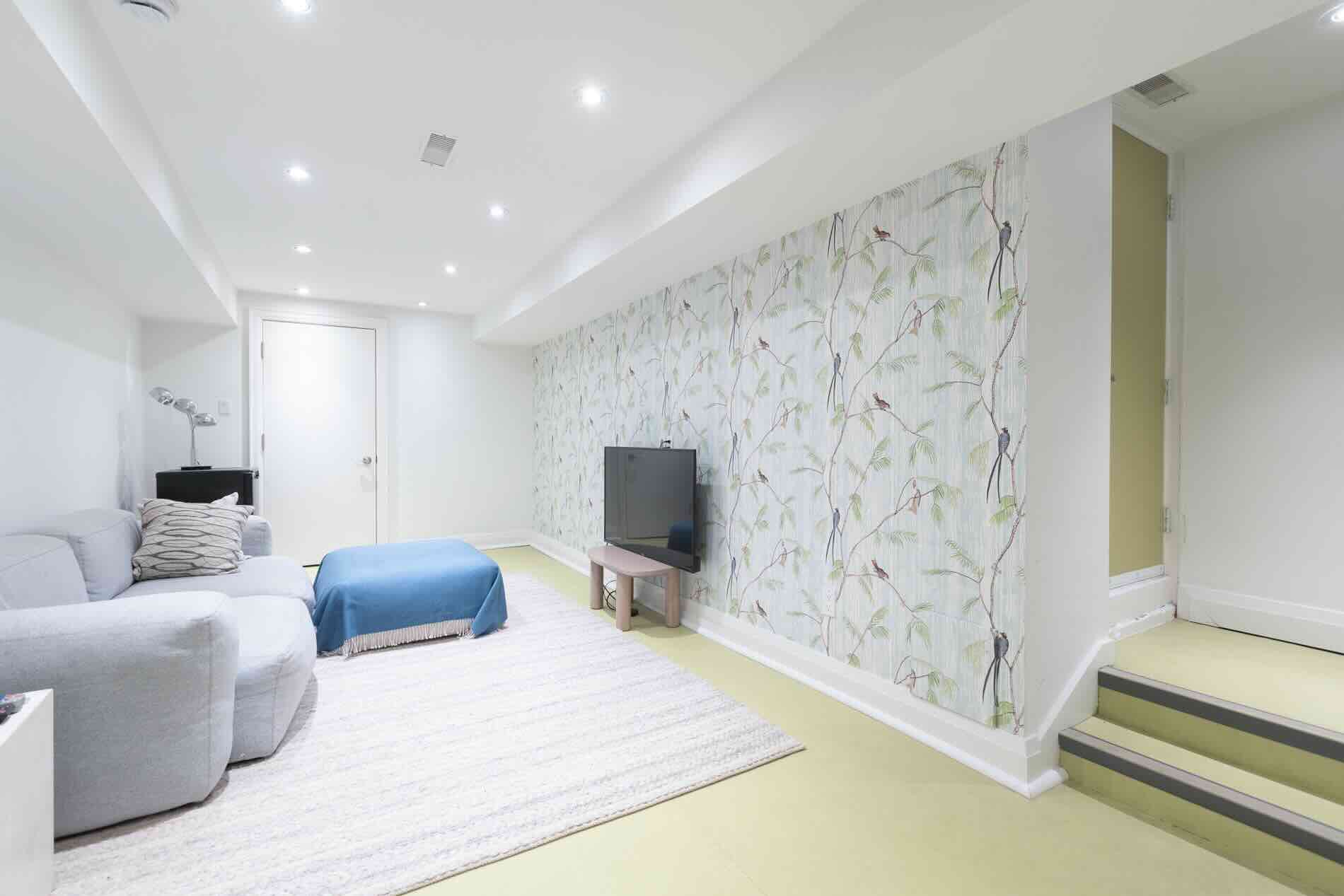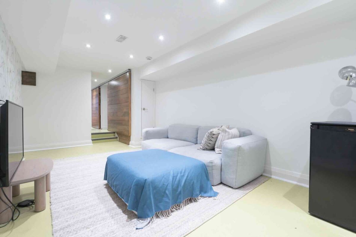 The lower level awards a third bedroom, an additional renovated bathroom, a sauna, and a large recreation space with tall ceiling heights. There is a large laundry/utility room as well as a separate entrance to the rear garden for added connectivity and convenience.