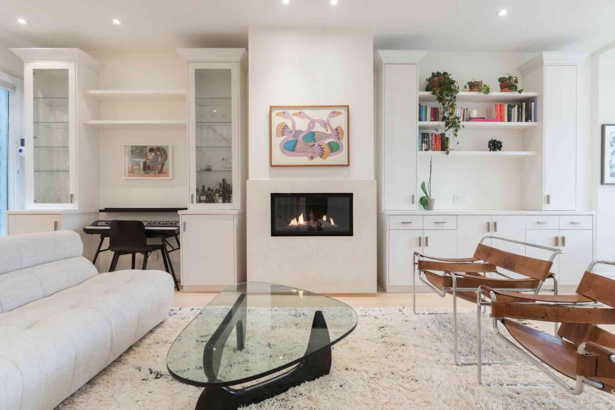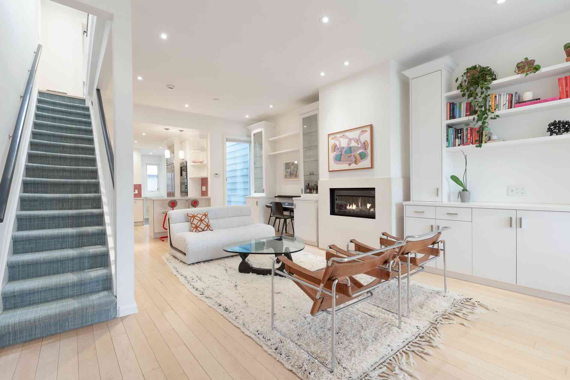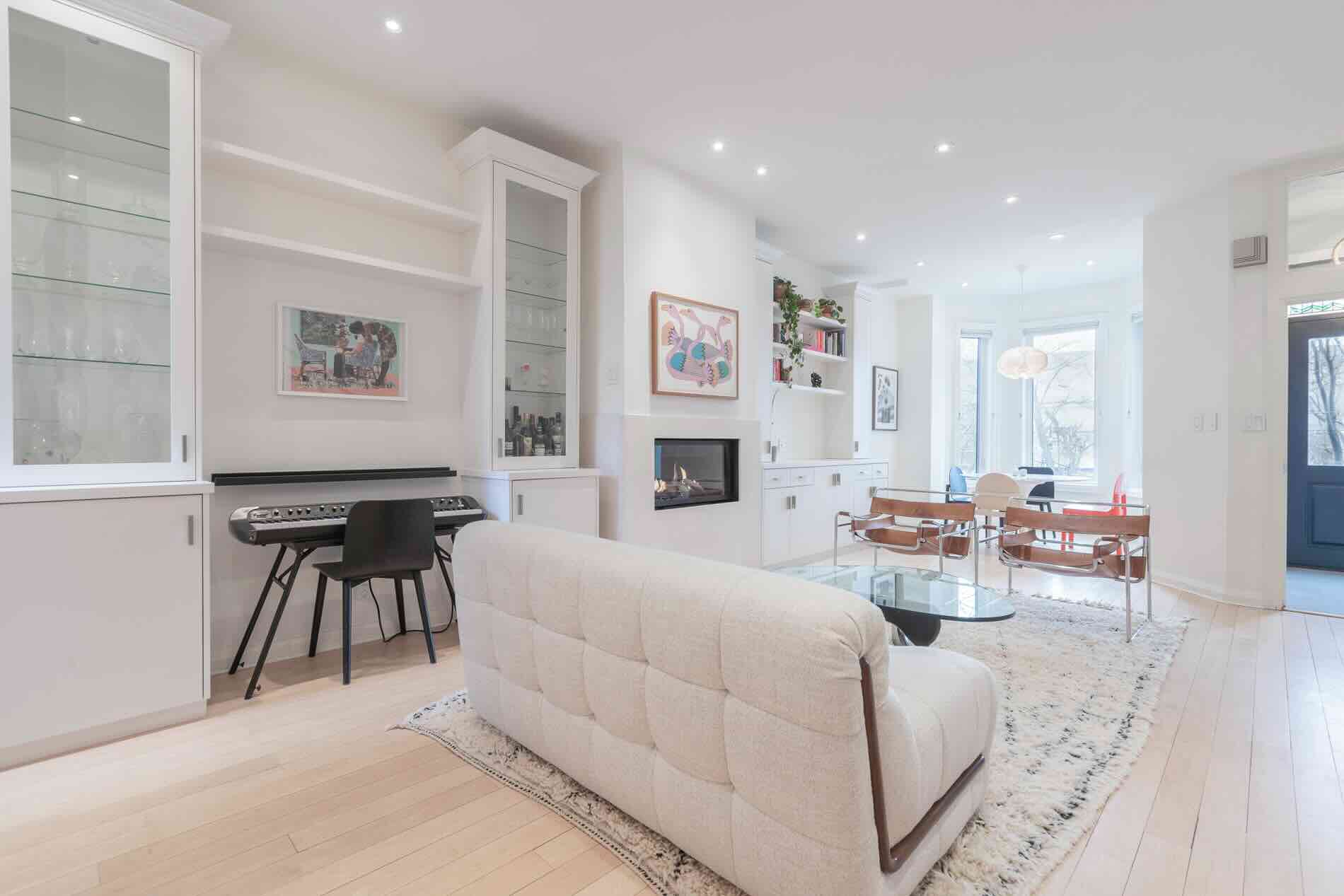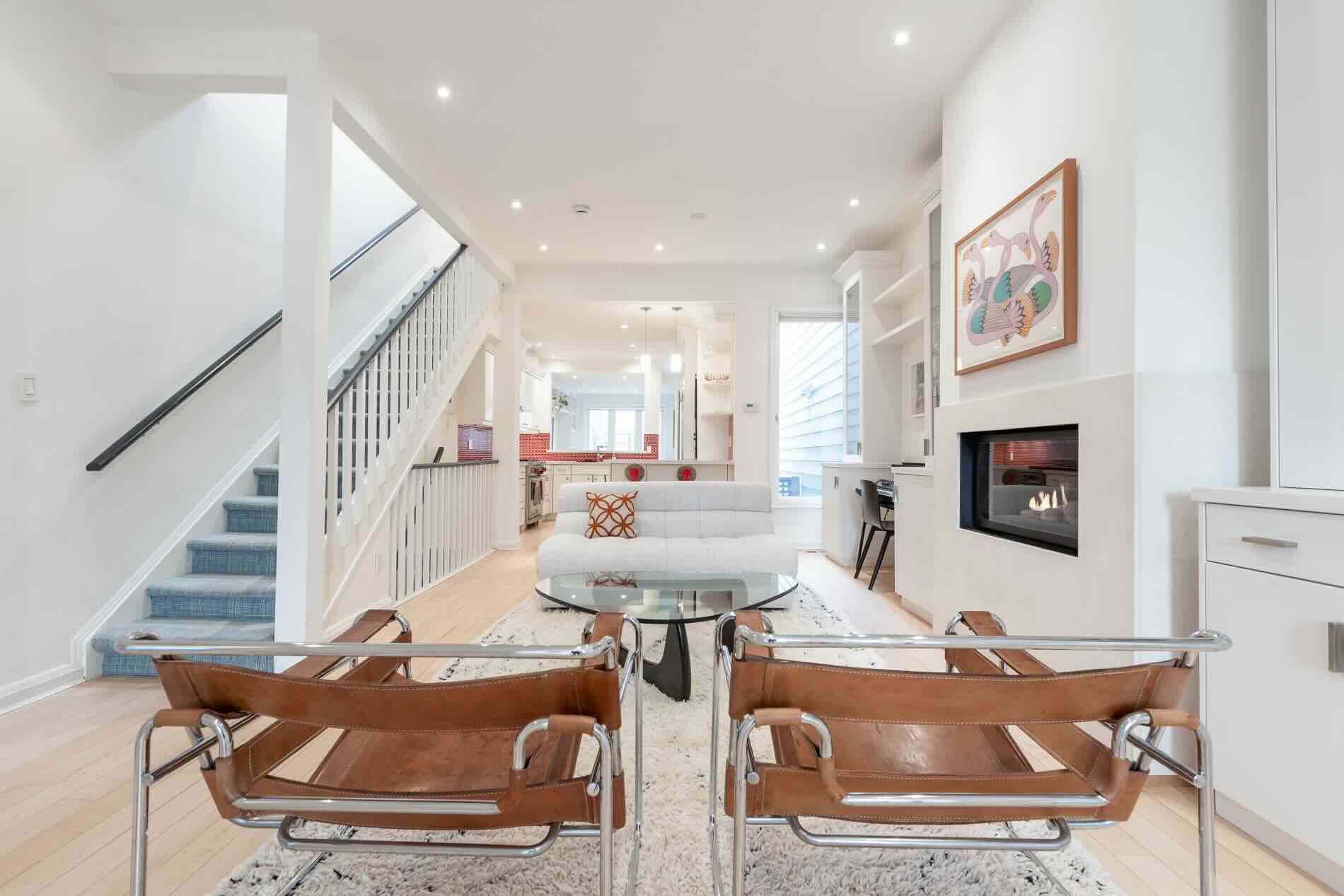 The lower level awards a third bedroom, an additional renovated bathroom, a sauna, and a large recreation space with tall ceiling heights. There is a large laundry/utility room as well as a separate entrance to the rear garden for added connectivity and convenience.