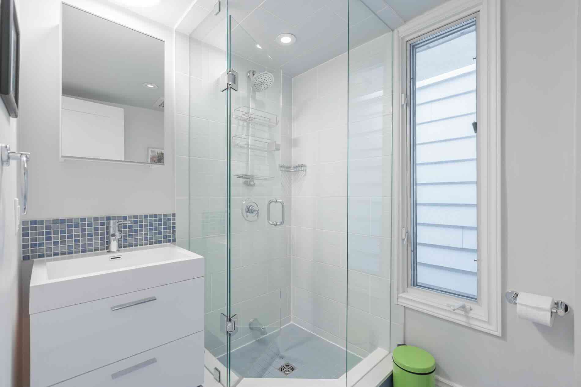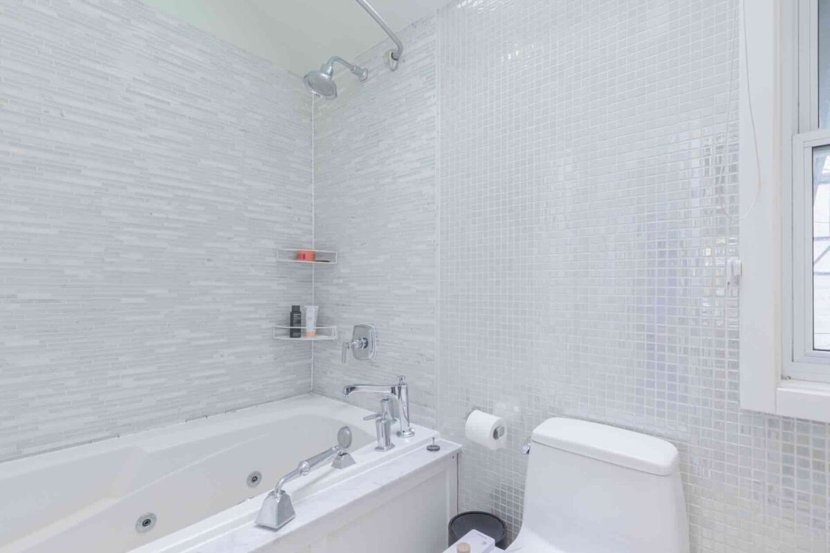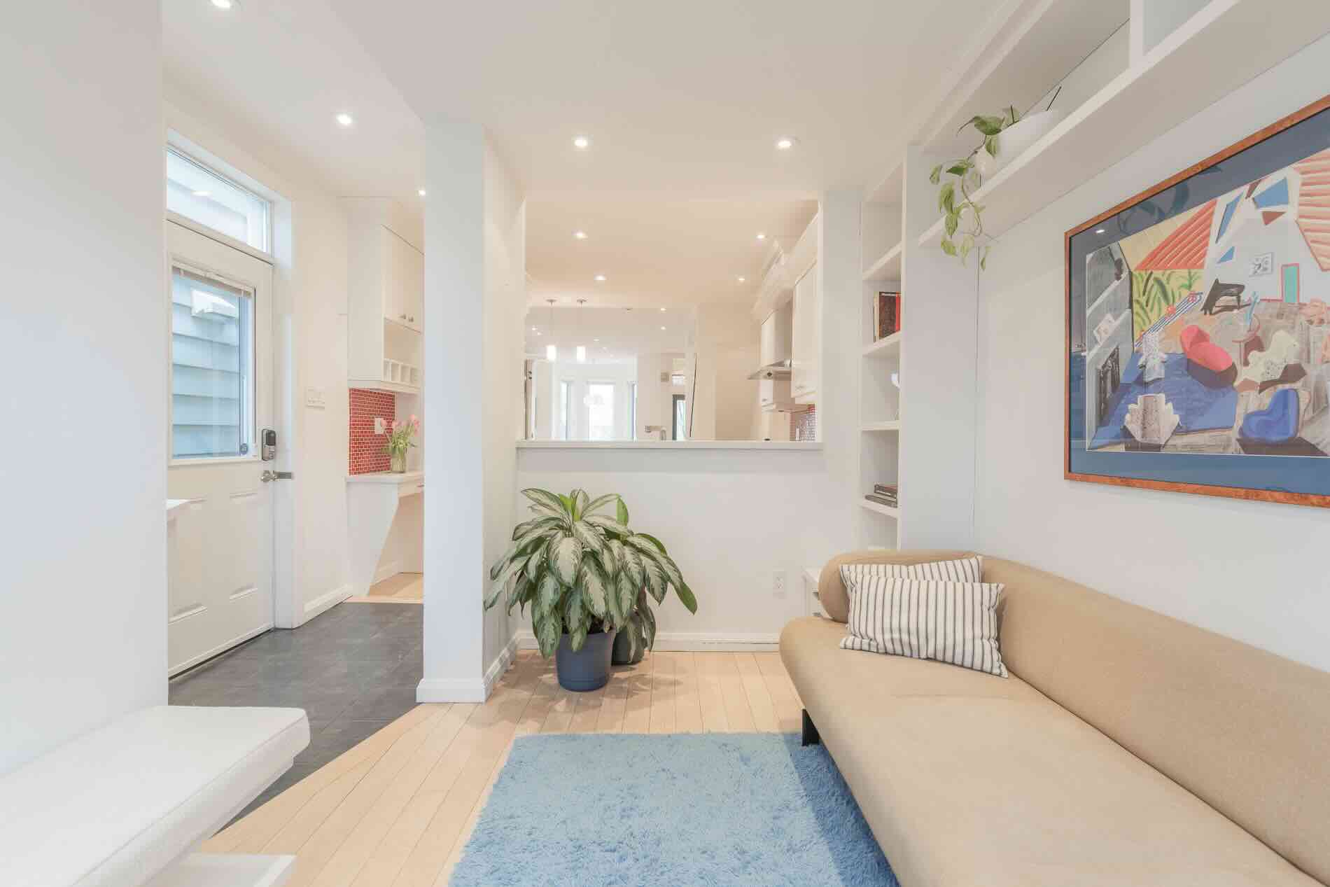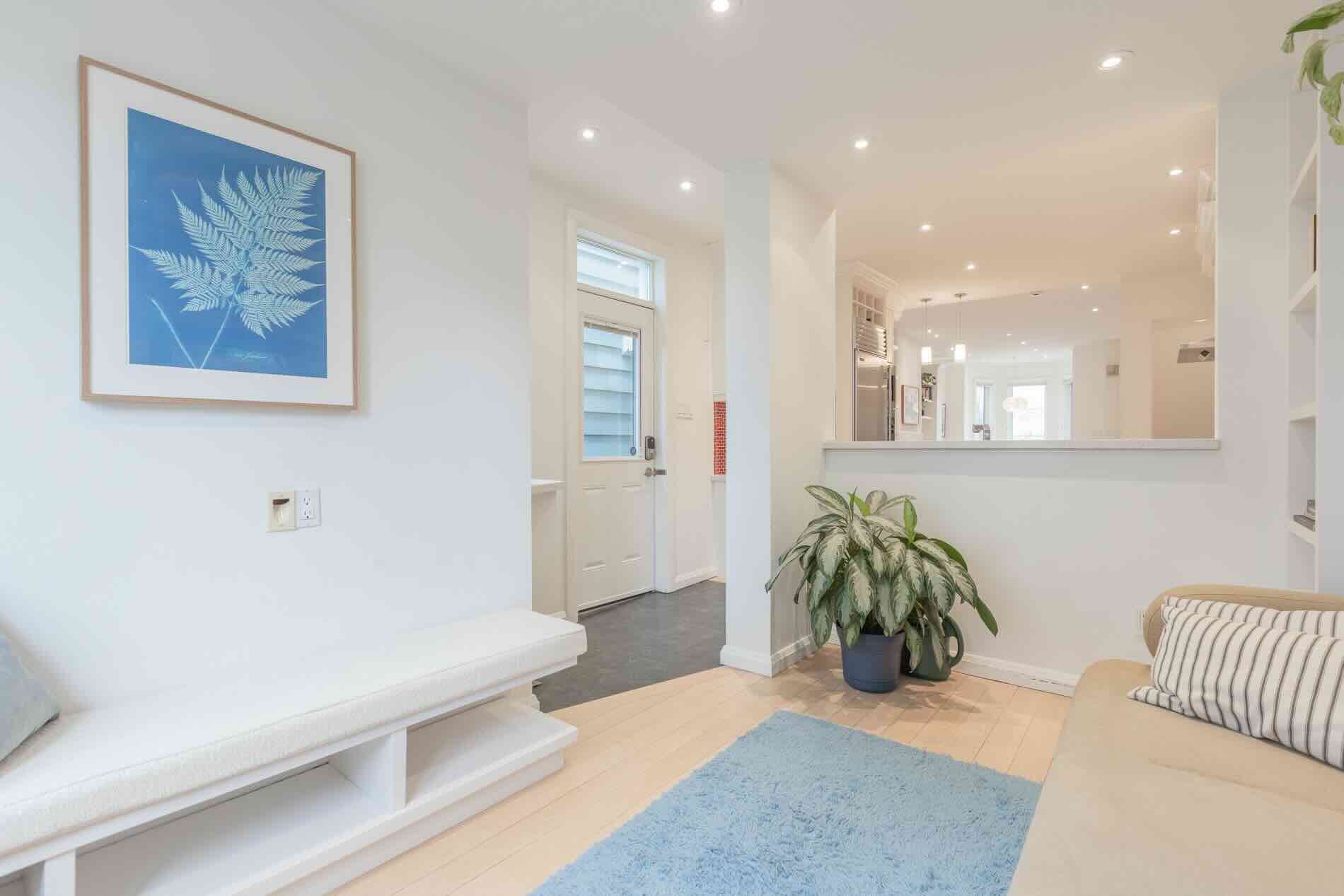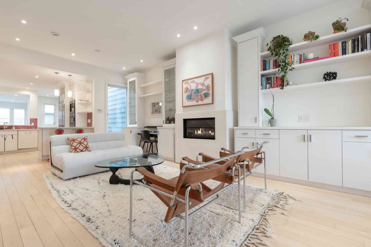 The lower level awards a third bedroom, an additional renovated bathroom, a sauna, and a large recreation space with tall ceiling heights. There is a large laundry/utility room as well as a separate entrance to the rear garden for added connectivity and convenience.