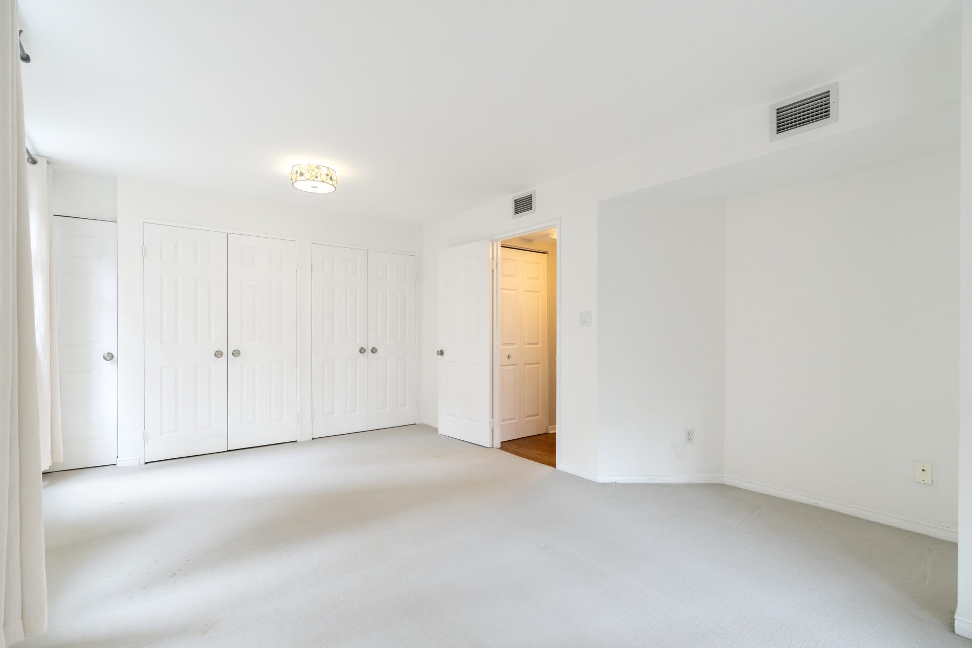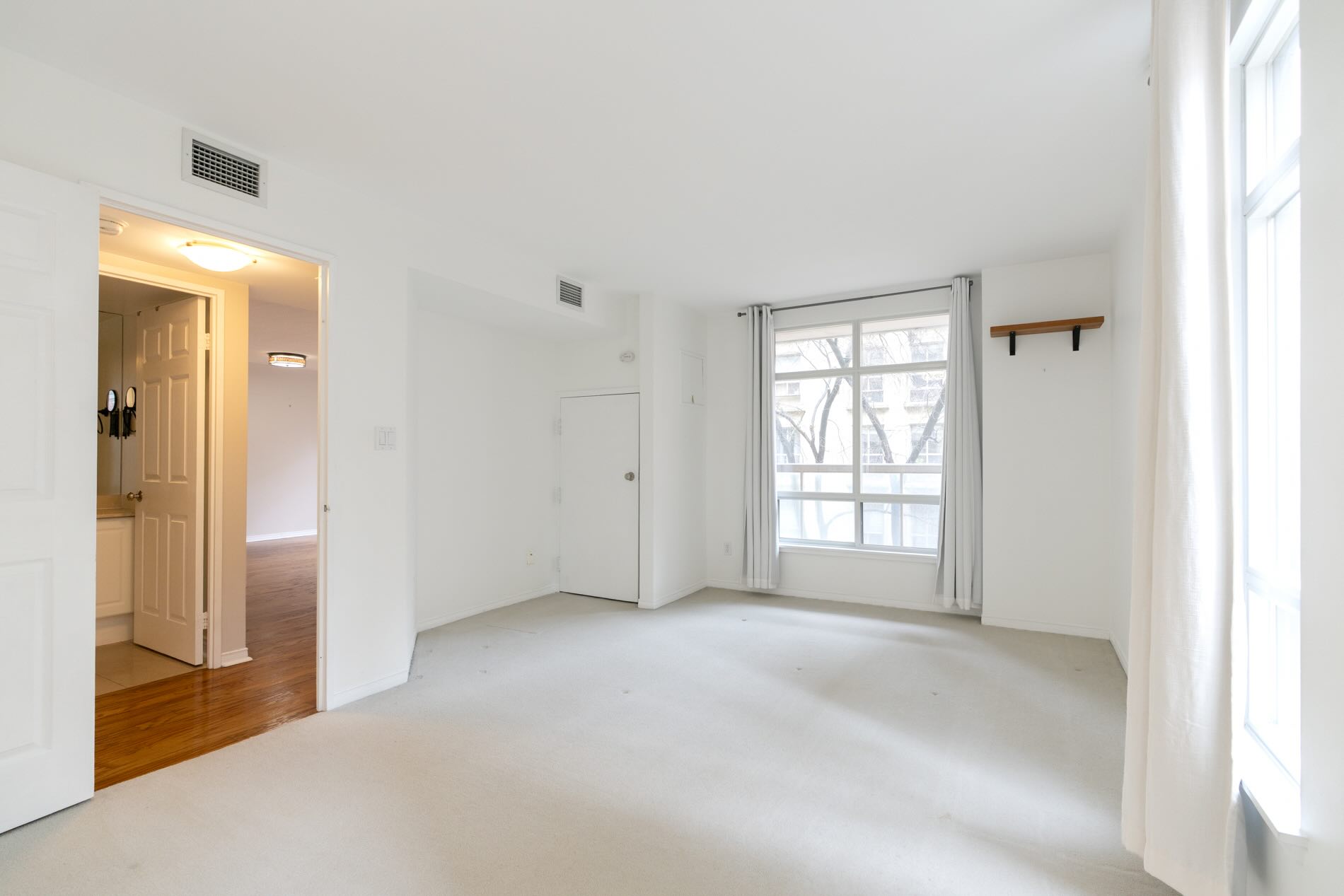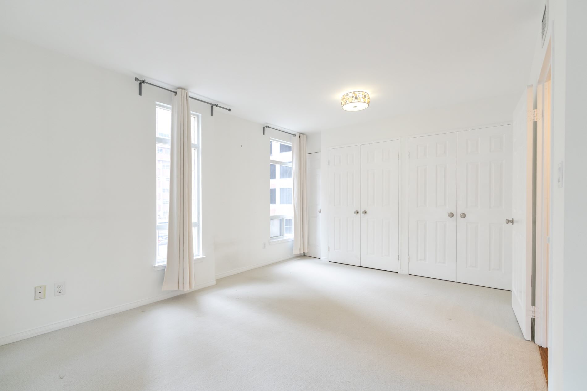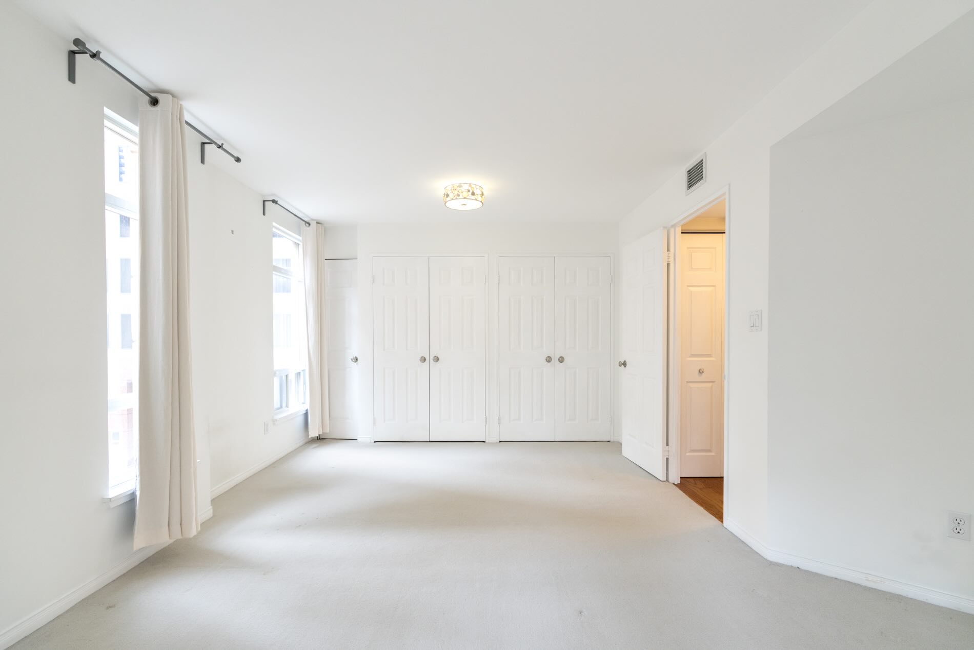 The king-sized bedroom is much larger in size than you’d expect and can easily accommodate a tandem home office space, if required. There is a wall of closets and windows on two sides of the room.