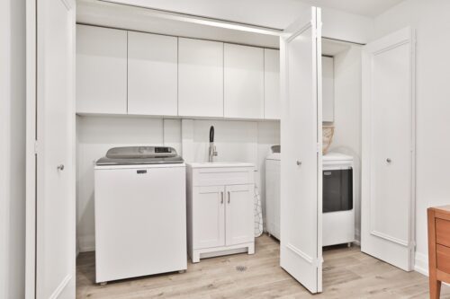 The lower level is largely at grade. The entrance from the laneway arrives at a huge mud room with custom built-ins, and heated floors. Beyond this, a recreation room is set below an at-grade window, with an adjacent laundry closet with full-sized machines and loads of extra storage. Uniquely, this home has a built-in garage that can hold an SUV, plus there is additional parking for one car in front of the garage. The right of way driveway is used by all residents in this complex, and horizontal parking in front of this unit opposite the grass can be used for guest or additional parking for this suite.