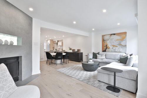 On the main floor, a generous foyer sets the tone with custom built in storage and a renovated two-piece guest bathroom. Beside this, the kitchen opens with a completely new design and open-concept connection to the living and dining rooms. It is lined with new customized cabinetry, stainless steel appliances, and a striking slab countertop and backsplash. There is a large breakfast bar with seating for up to four guests, beyond which the dining room expands with generous proportions for a side board and a large dining setting.