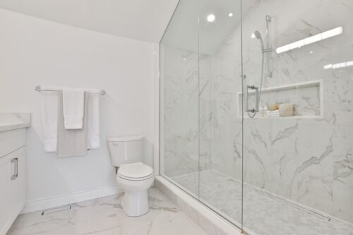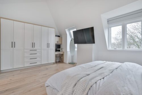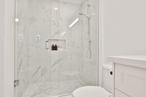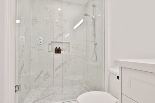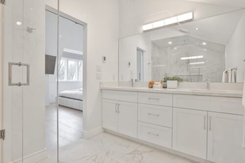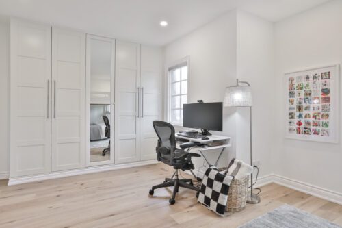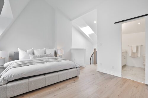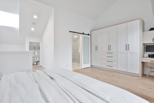 The second level hosts two substantial bedroom suites, each with its own beautifully renovated ensuite and built-in storage closets and shelves. Above, the third level is devoted to a stunning primary retreat with vaulted ceilings, skylight exposure, and a full wall of custom millwork with storage closets and an integrated workspace. The bathroom is gorgeous, with a custom double-vanity, a huge walk-in glass encased shower, and vaulted ceilings. There is also a secret storage room behind the built-in bookshelf in the bedroom, perfect for seasonal wardrobe storage.