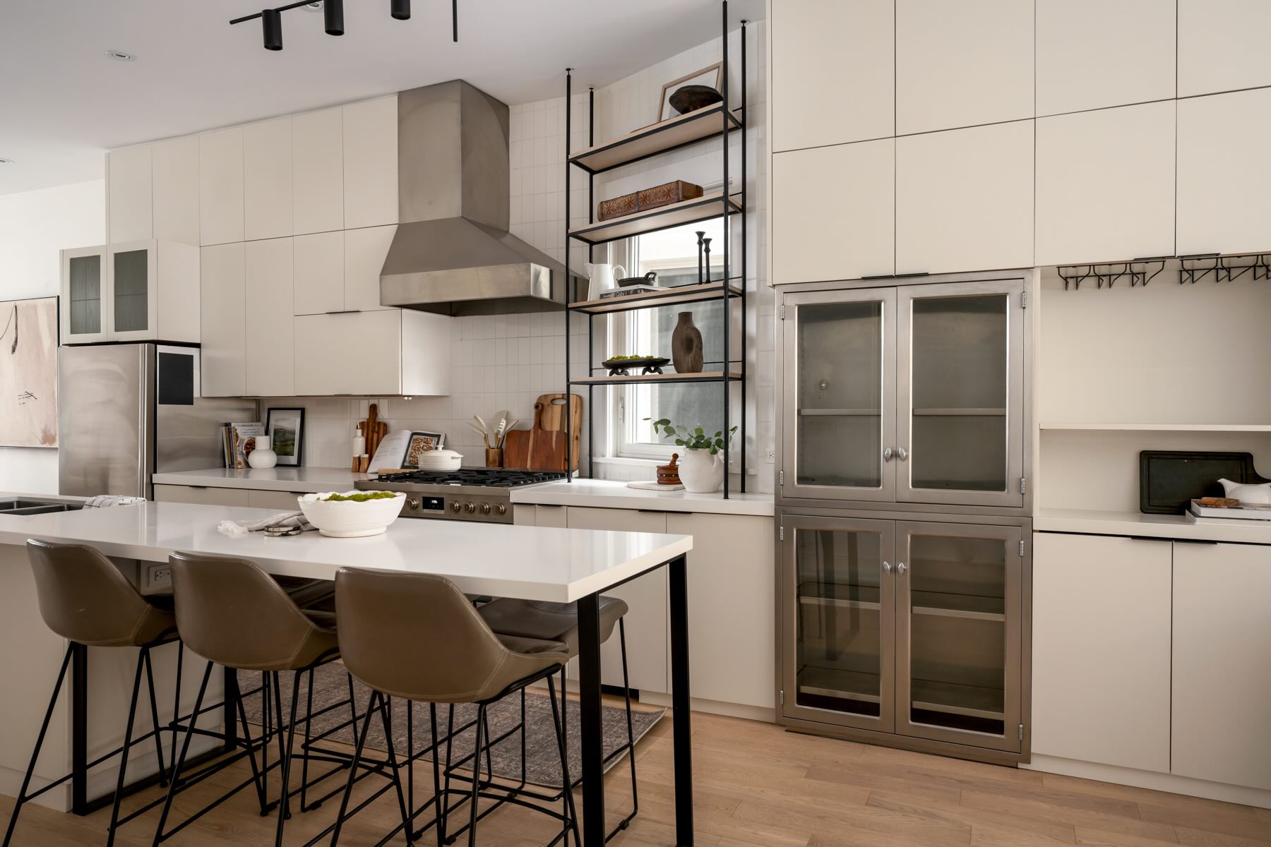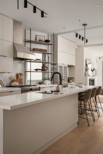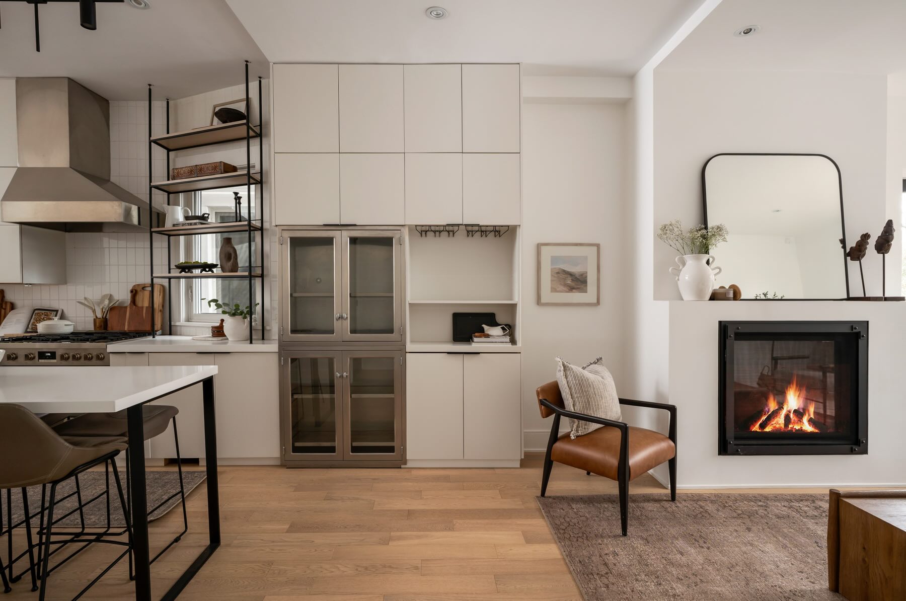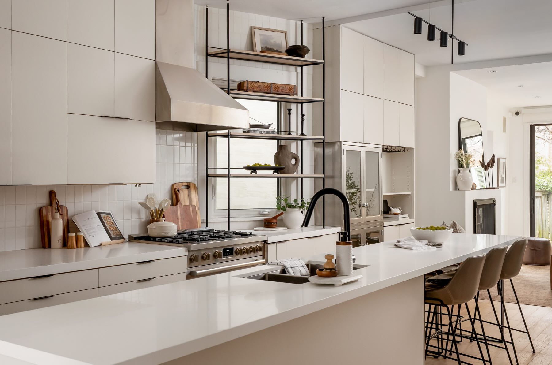 The kitchen is a chef’s paradise, equipped with high-end stainless steel appliances, including a KitchenAid fridge/freezer, professional-grade gas range, Bosch dishwasher, and Garland exhaust fan. Designed with style and functionality in mind, it features a large center island with seating for six, custom cabinetry, Caesarstone countertops, and thoughtful storage options like a built-in bar, wine rack, and wine storage cupboard. Complementing the modern design are built-in display shelving and integrated speakers, creating the perfect space for culinary creativity and entertainment. Thoughtful lighting design, including Mobilia track lighting and under-cabinet illumination, ensures a bright and welcoming atmosphere.