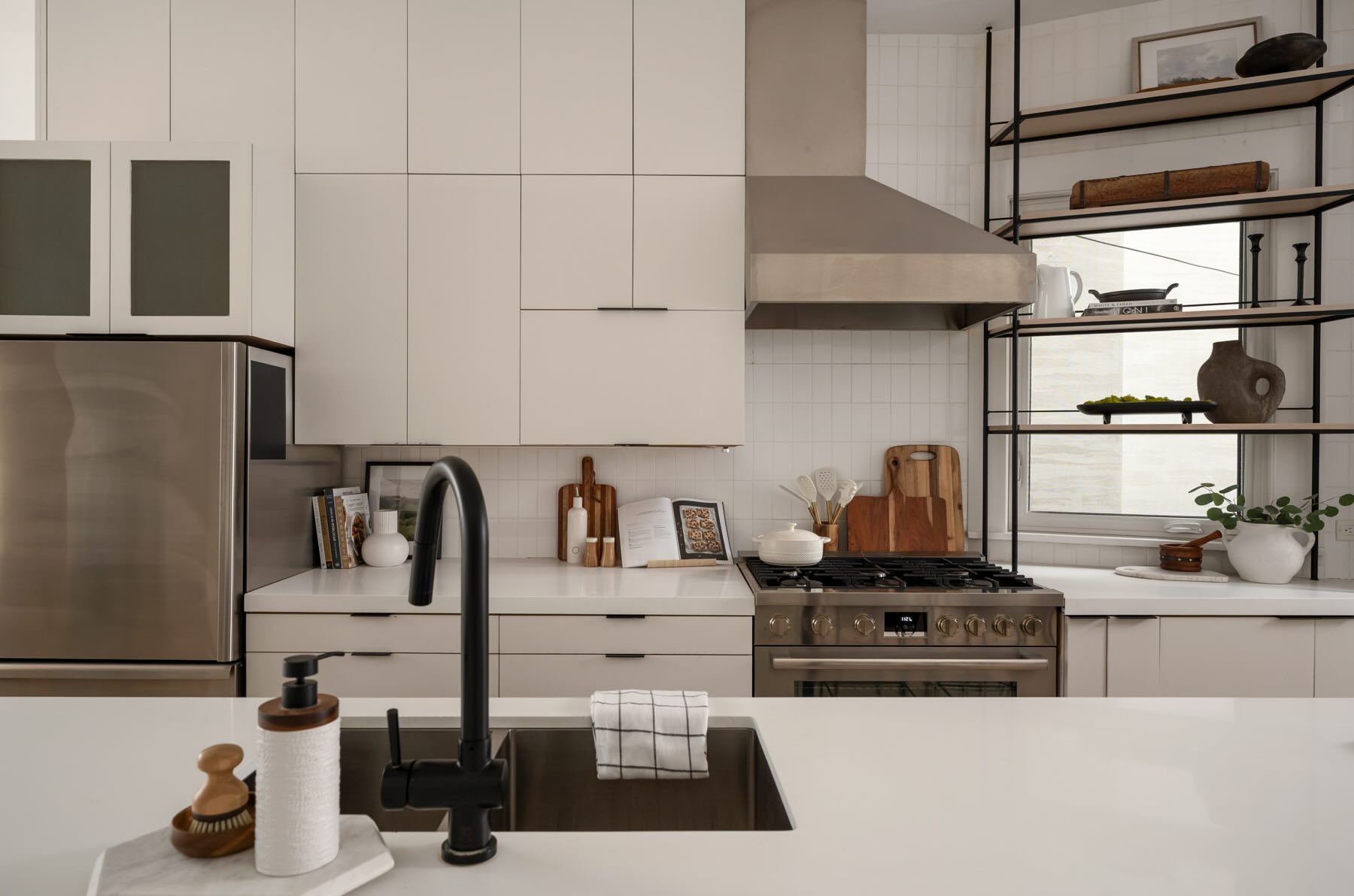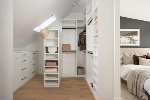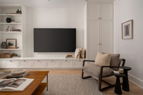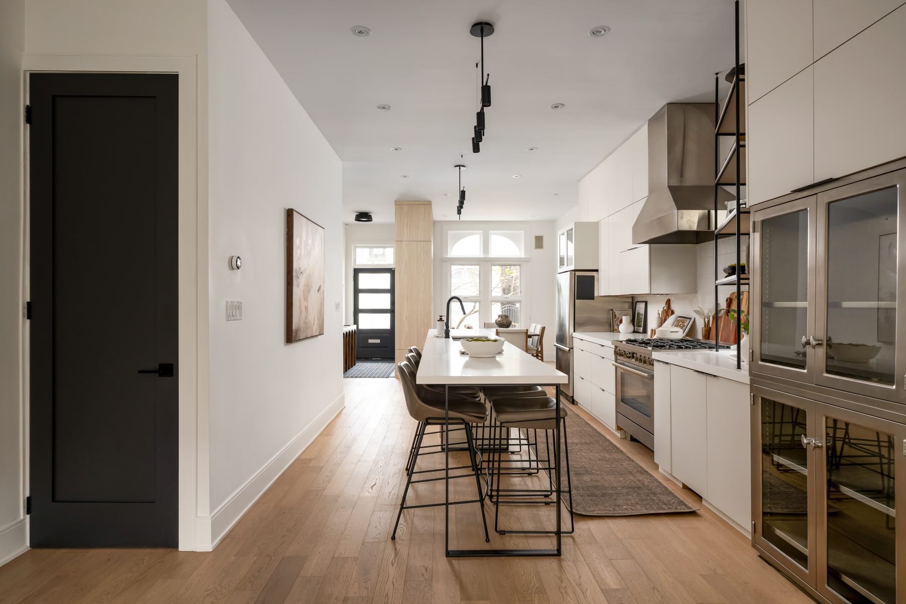 The kitchen is a chef’s paradise, equipped with high-end stainless steel appliances, including a KitchenAid fridge/freezer, professional-grade gas range, Bosch dishwasher, and Garland exhaust fan. Designed with style and functionality in mind, it features a large center island with seating for six, custom cabinetry, Caesarstone countertops, and thoughtful storage options like a built-in bar, wine rack, and wine storage cupboard. Complementing the modern design are built-in display shelving and integrated speakers, creating the perfect space for culinary creativity and entertainment. Thoughtful lighting design, including Mobilia track lighting and under-cabinet illumination, ensures a bright and welcoming atmosphere.