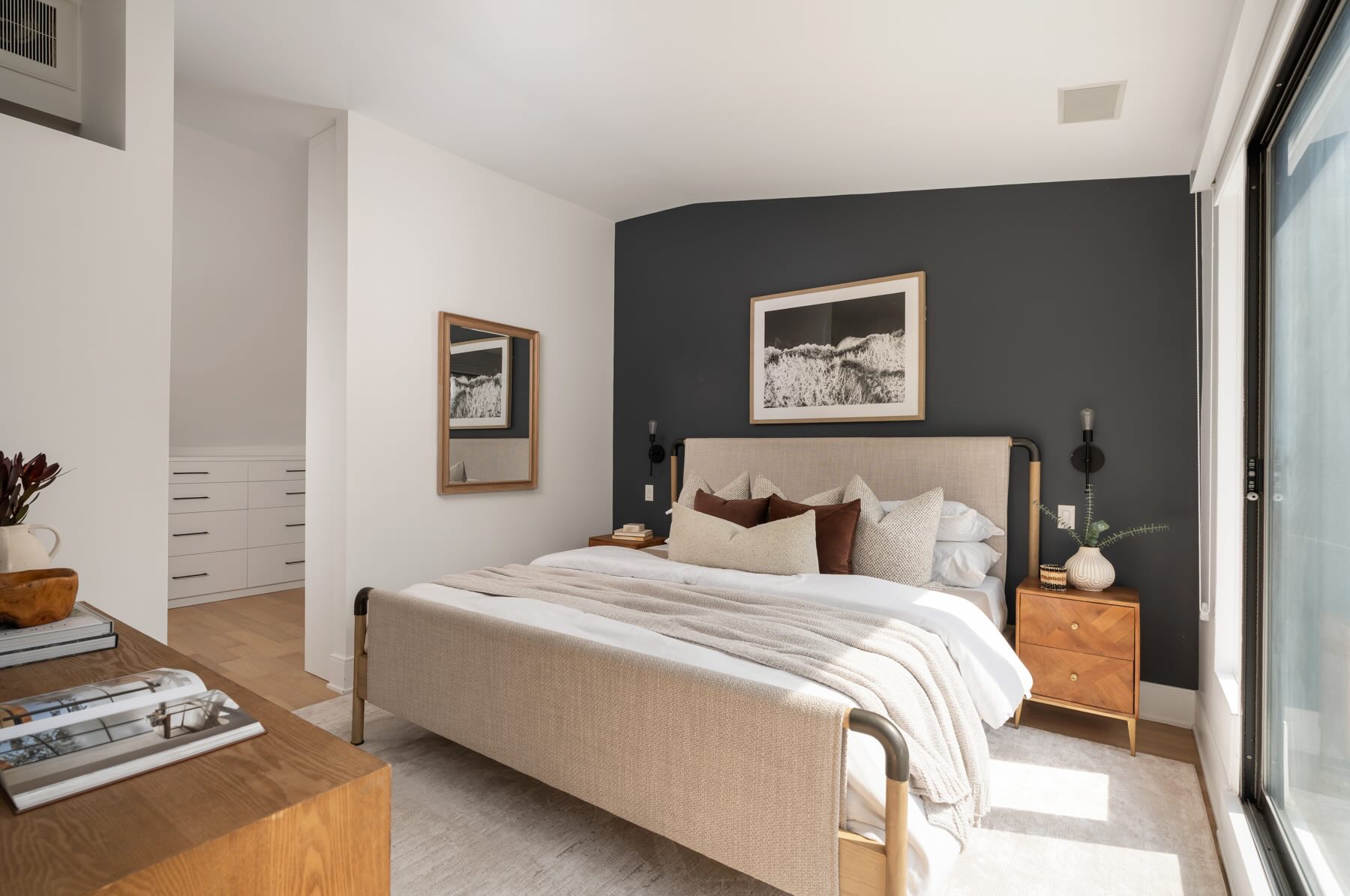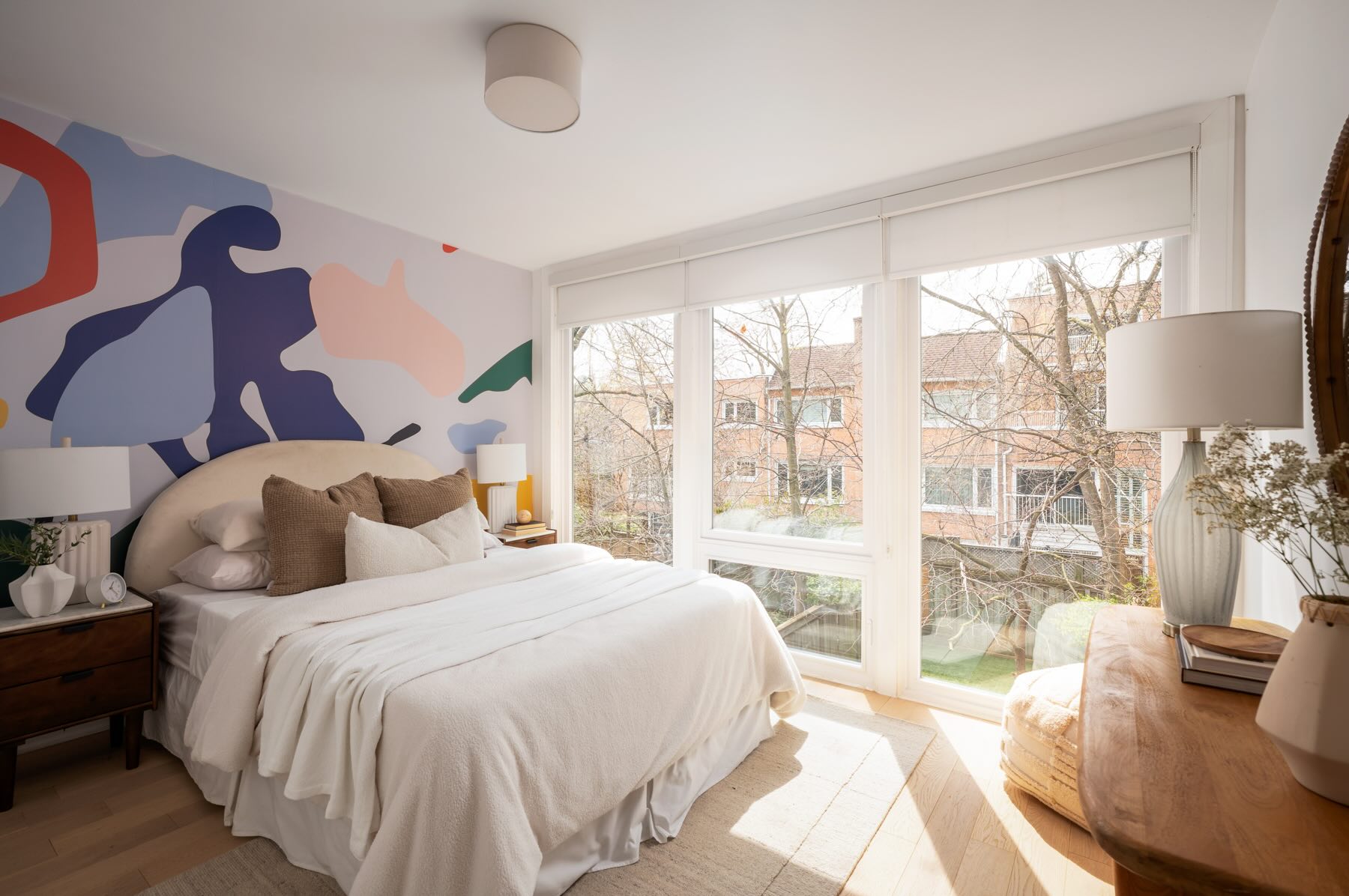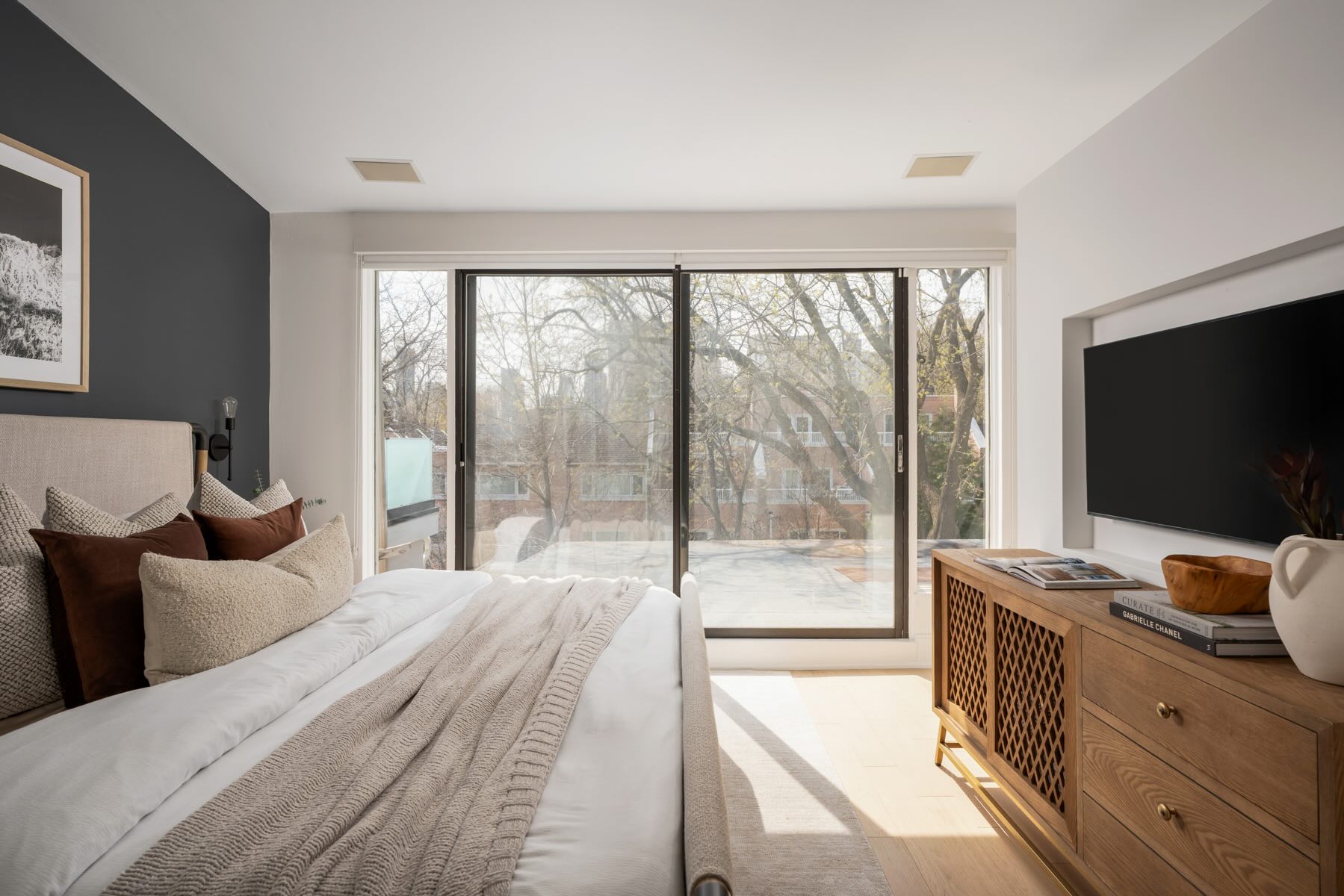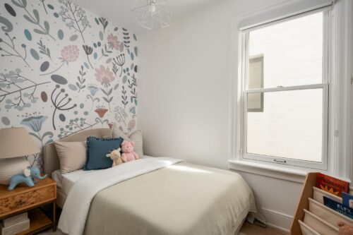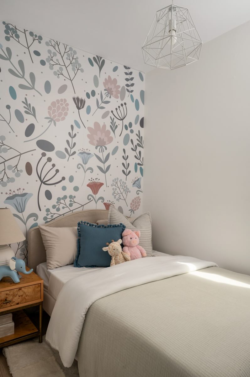 The second floor boasts well-designed bedrooms, each with custom roller blinds, modern lighting, and artistic wall features. The second bedroom offers a floor-to-ceiling west-facing window that bathes the room in light, while the third bedroom features additional storage with a freestanding wardrobe. The family room on this level offers a built-in entertainment center with custom cabinetry and brass hardware, creating a stylish and functional space, illuminated by the morning sun from its east-facing windows.