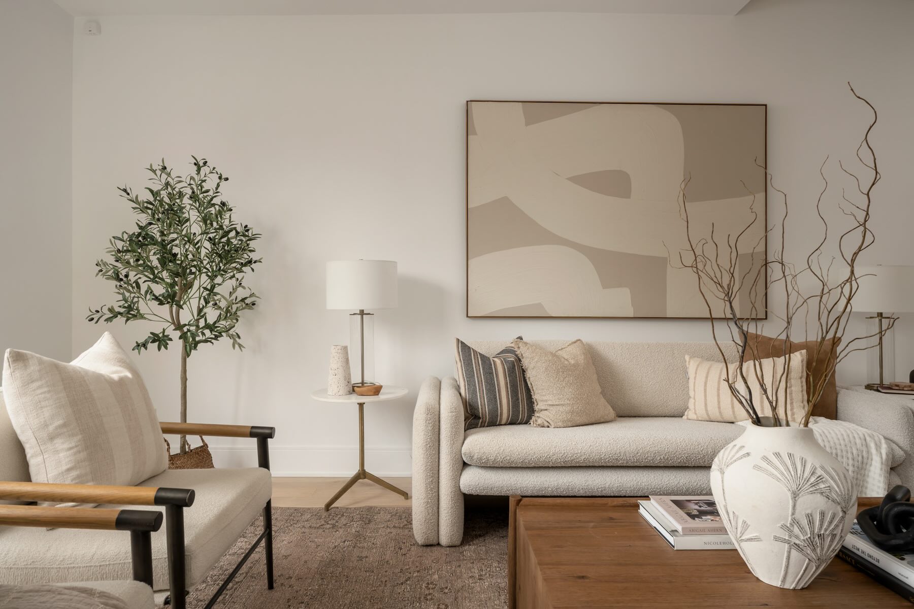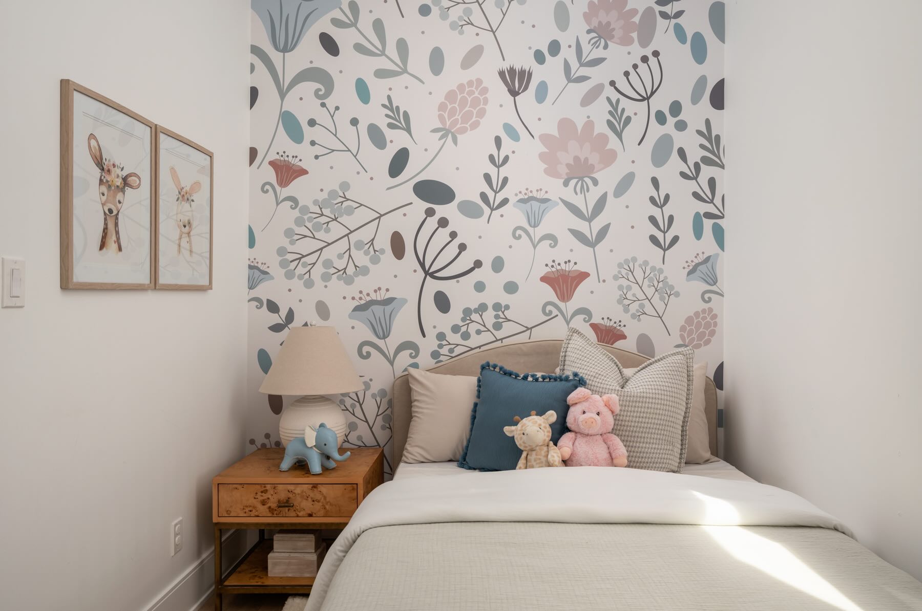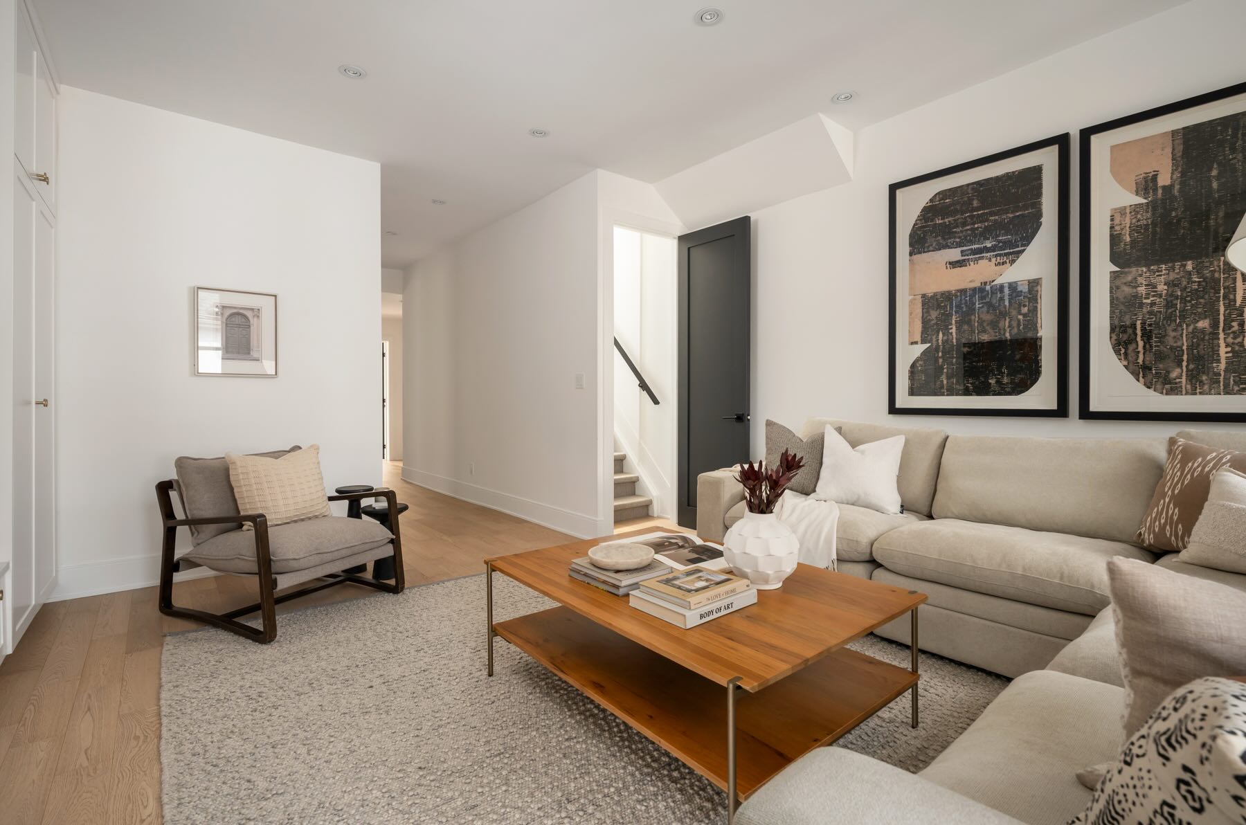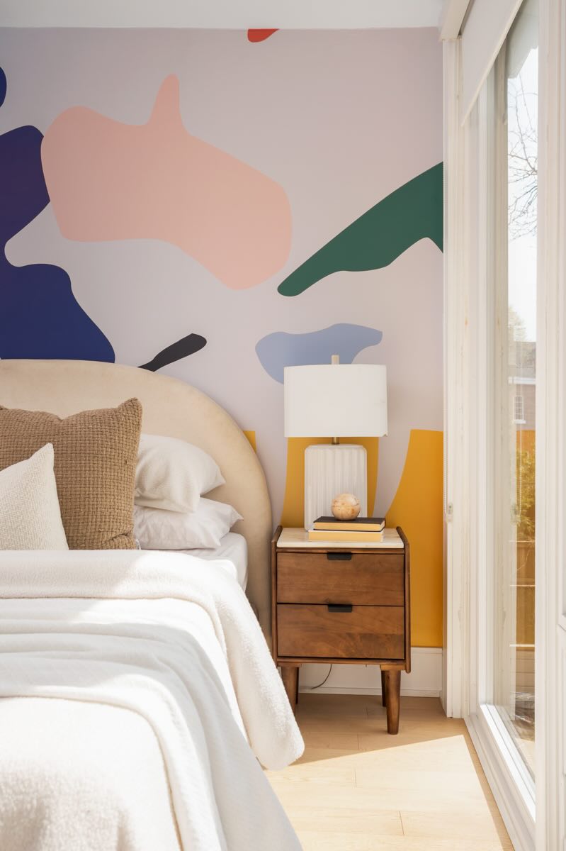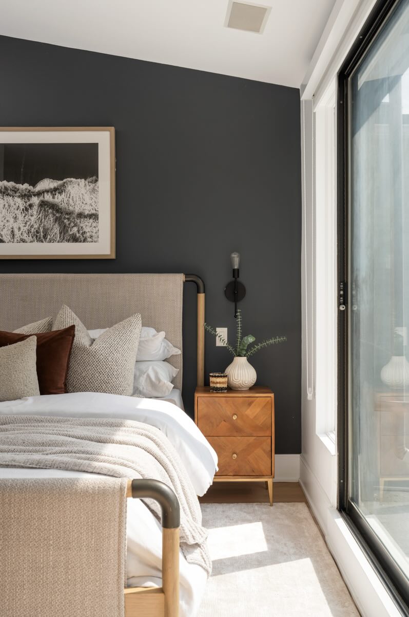 The second floor boasts well-designed bedrooms, each with custom roller blinds, modern lighting, and artistic wall features. The second bedroom offers a floor-to-ceiling west-facing window that bathes the room in light, while the third bedroom features additional storage with a freestanding wardrobe. The family room on this level offers a built-in entertainment center with custom cabinetry and brass hardware, creating a stylish and functional space, illuminated by the morning sun from its east-facing windows.