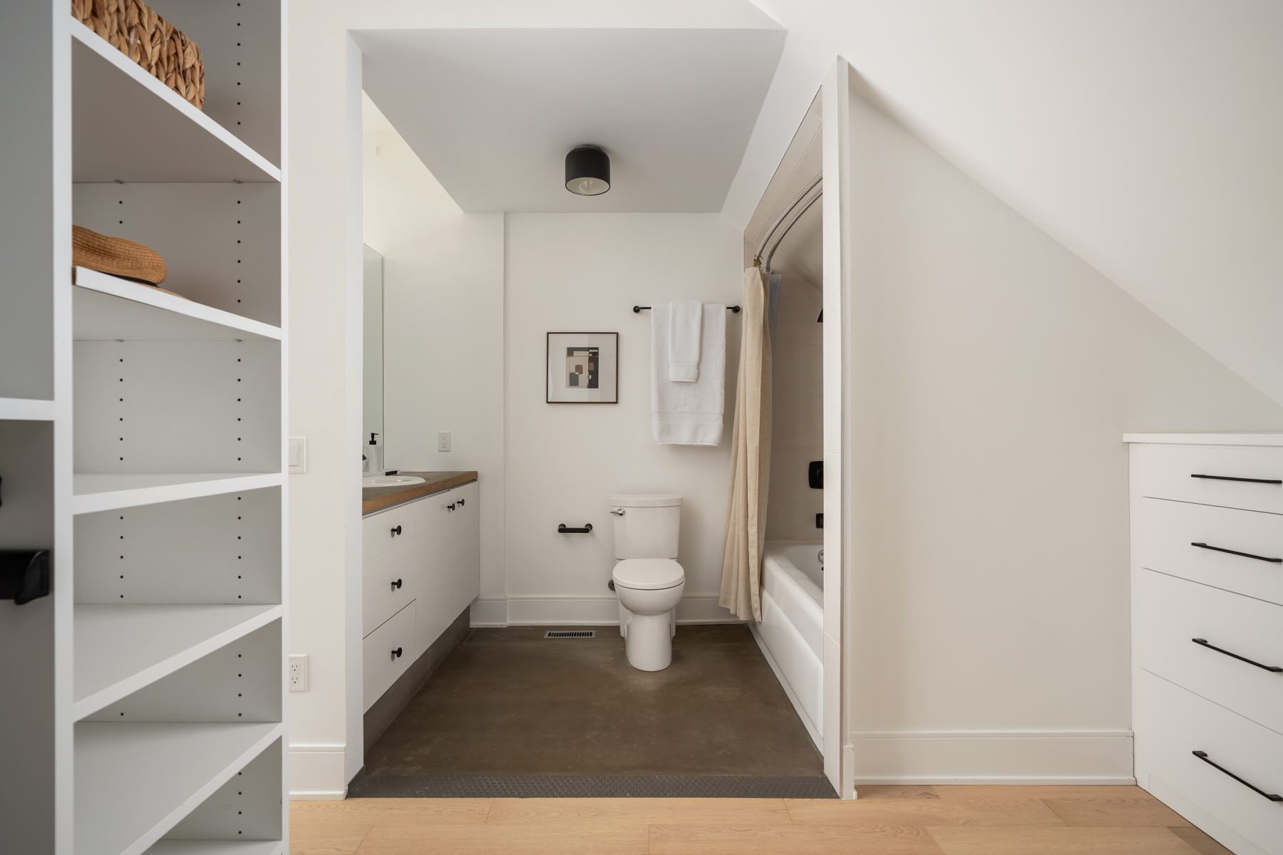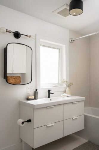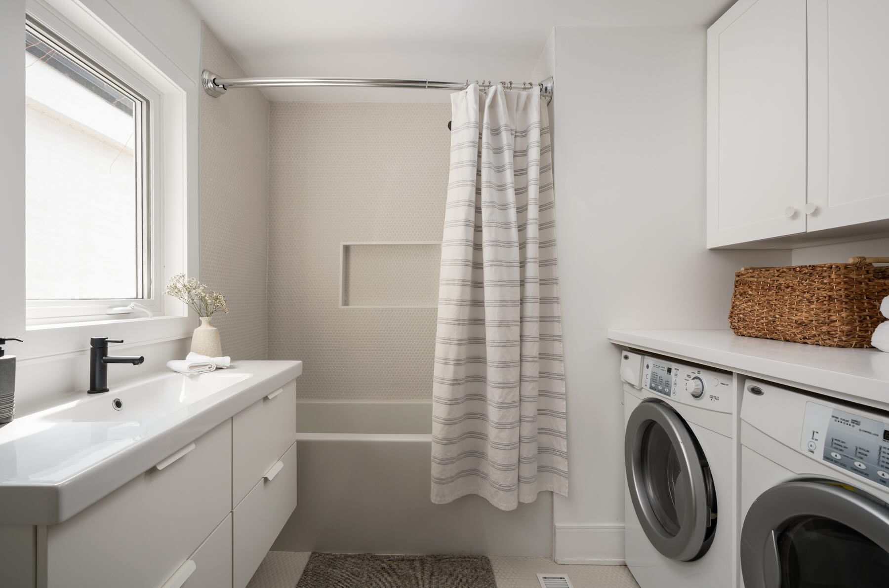 A spa-like second-floor bathroom is complete with a tub surrounded by hexagonal tiles, integrated shelving, custom fixtures, and a floating vanity. Within the space, a laundry area provides ultimate convenience, with a folding table, cabinetry, and a front-loading Amana washer/dryer.
