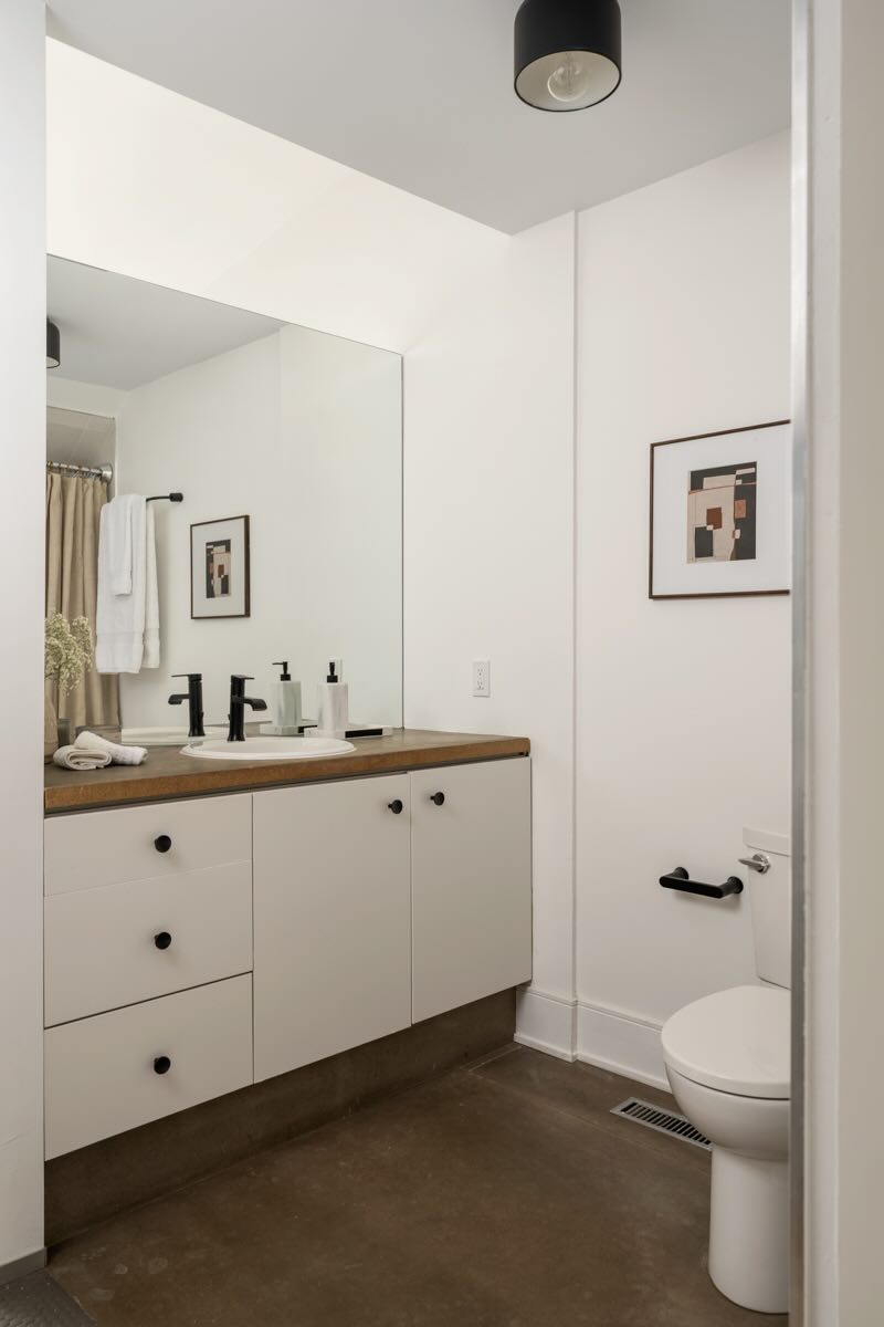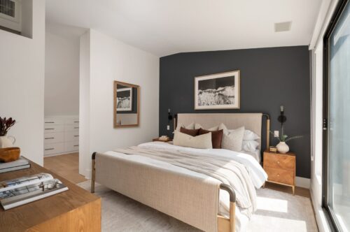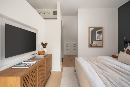 The third-floor primary suite offers unparalleled privacy and luxury, with an enclosed stairwell leading to a king-sized room featuring a media wall, bedside sconces, and a custom walk-in California Closet system. The ensuite bath has been upgraded with modern tile surrounds, contemporary fixtures, and a custom mirror. Sliding doors open to a flat roof, perfect for a potential rooftop deck with stunning views.