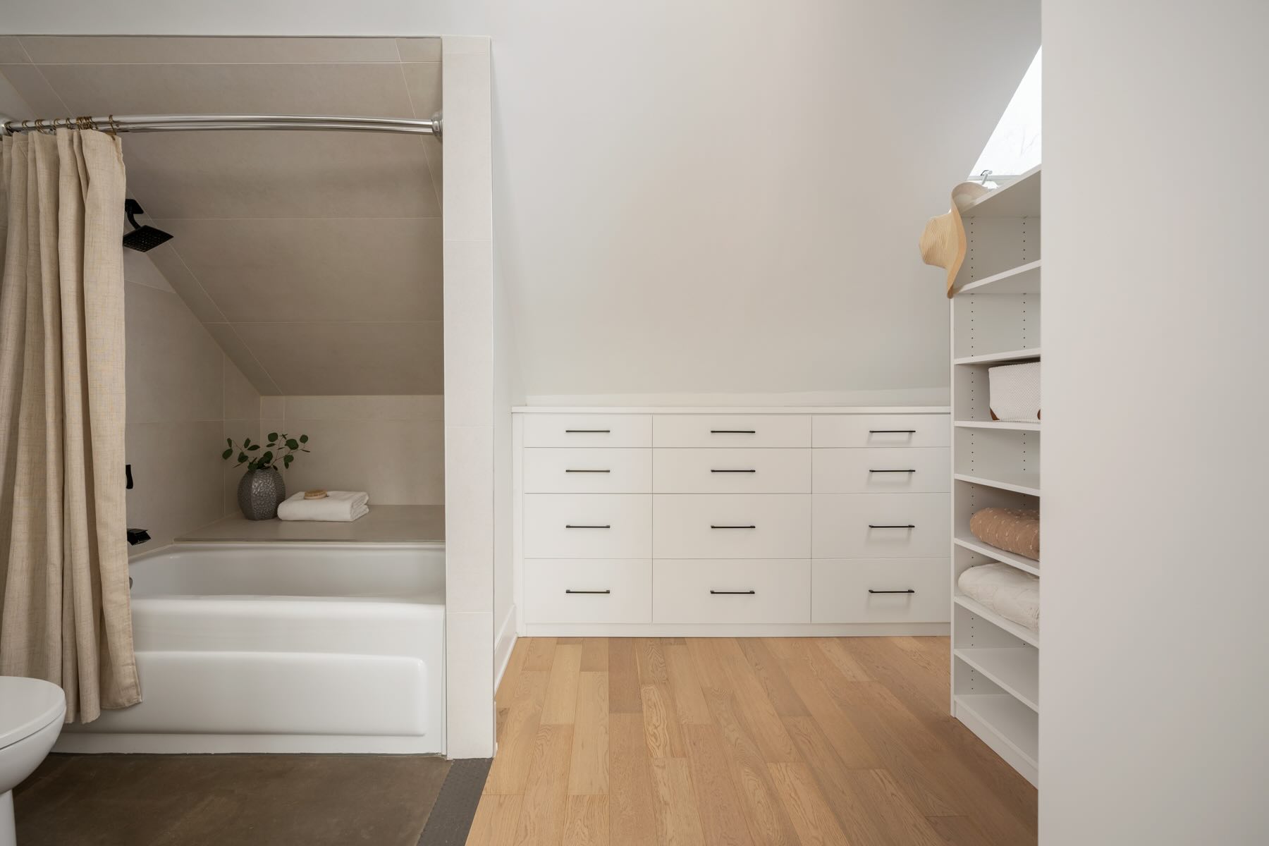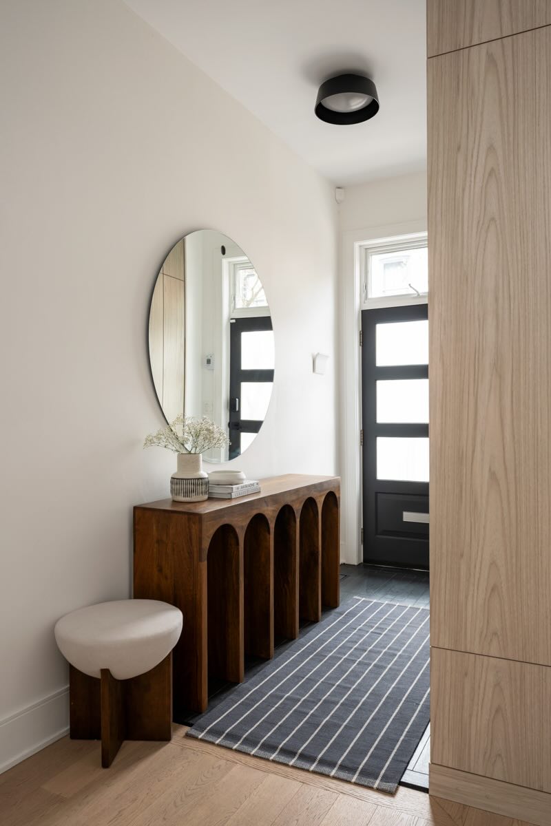 Upon entering, you’re greeted by a warm and inviting foyer with heated porcelain tile flooring and a custom-built closet that blends practicality with elegant design. The dining room is a true showpiece, featuring a striking arched window that frames the picturesque view of Wellesley Avenue, a paneled feature wall, and custom roller blinds, all of which add to the room’s refined ambiance. The space is unified by luxurious Kentwood brushed oak hardwood flooring, flowing throughout the main level.